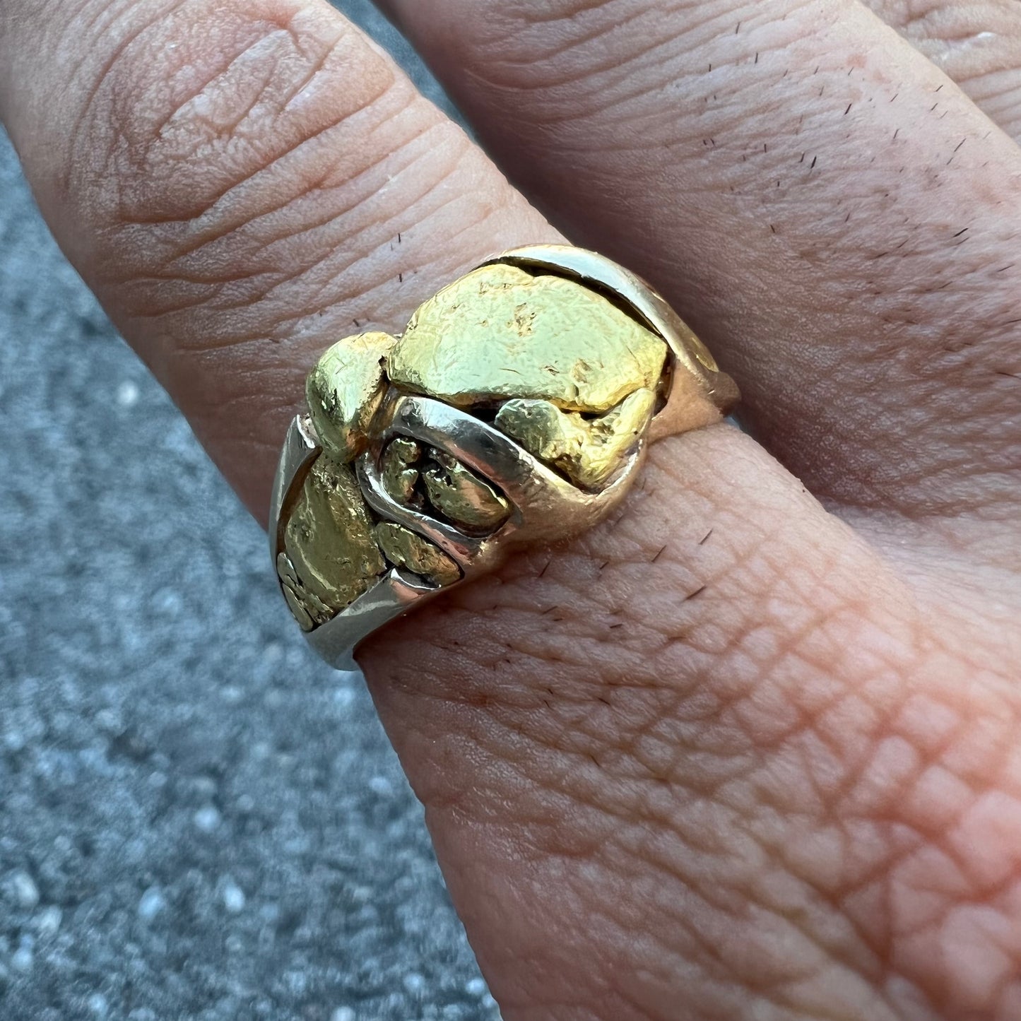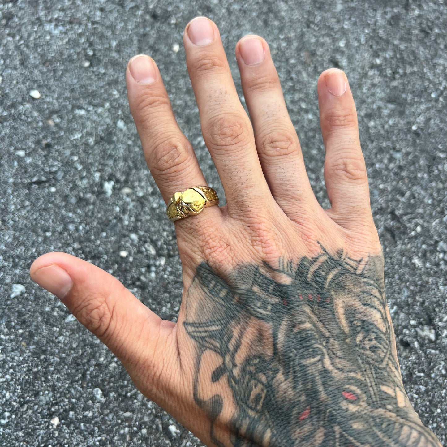 All of the rings made by orocal are all 1 of a kind and each one made to order produced by hand. If you look at the last picture that’s this model, the RM490, straight off of their website for an astounding price of $3963.99. Made with a beautiful comfort fit style and solid backed this ring is quite heavy and made by serious craftsmanship. Weighing in at just under 13.5g the majority of the weight is coming from the approximate 22k natural raw gold Nugget encased into the different sectors of the ring. This is a high end piece of art for way cheaper than you’ll find anywhere else. Size:10.5