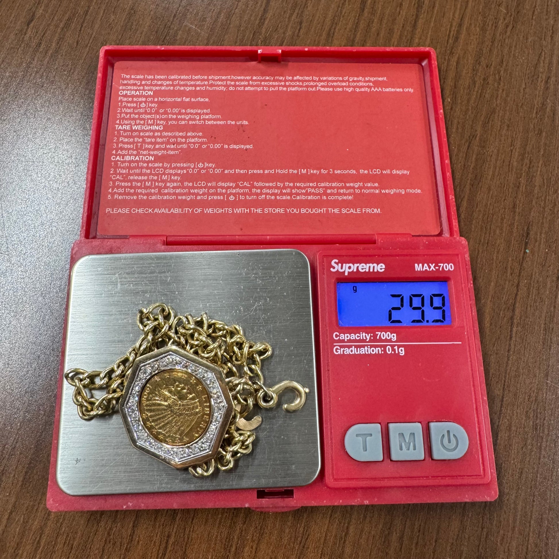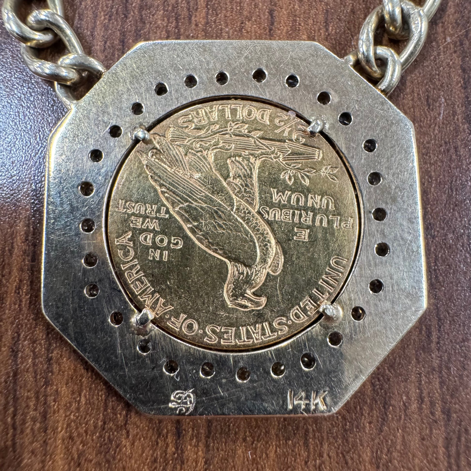1908 $2.5 Gold Indian Head Coin Natural Diamond Curb Link Necklace (16”)