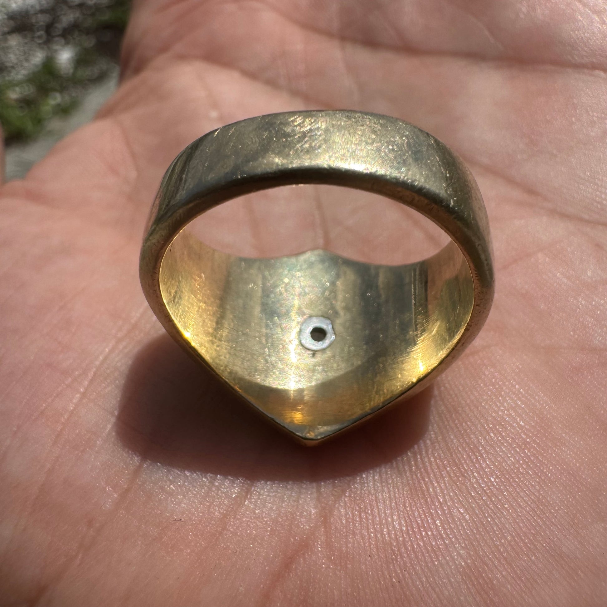 Extremely rare to come across made at the hands of an artisan master jeweler sometime around the art deco era of the 1930’s this gents ring was built tough and to last through the centuries. Crafted out of a solid, thick, and heavyweight 10k yellow gold for added strength and brute force it has been inlaid with almost half of the ring in all natural raw gold nuggets (approximately 21k-22k). Bezel set in the center is a luscious olive green nephrite jade and raw nugget solitaire added in the middle. A larger size:11 with a hefty weight of 13g it’s 18.5mm from top to bottom taking up a relatively large stance on the finger. The fact that this ring somehow was abandoned by the family of the original owners is mind boggling as this should be an heirloom piece you never let go of out of the family circle again.