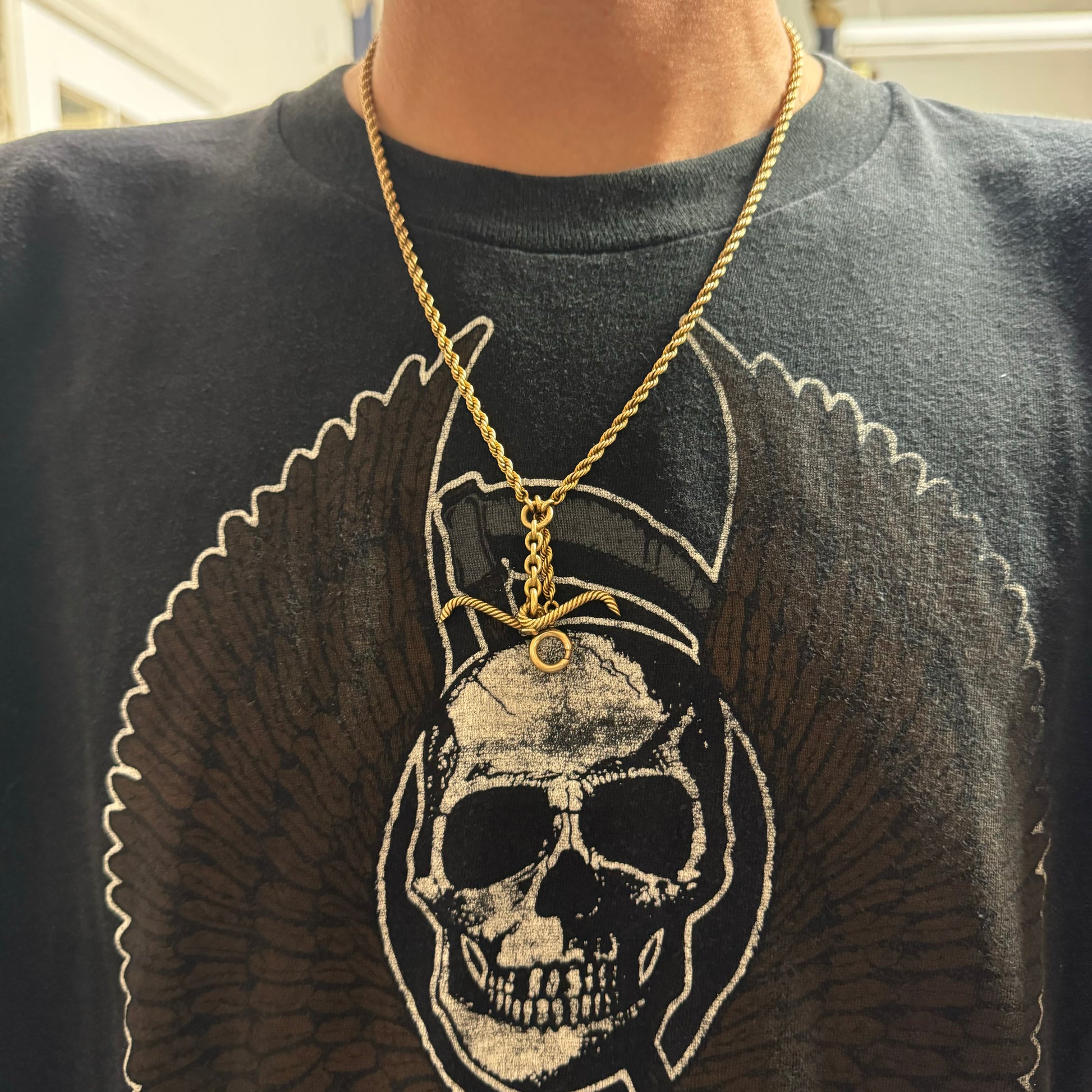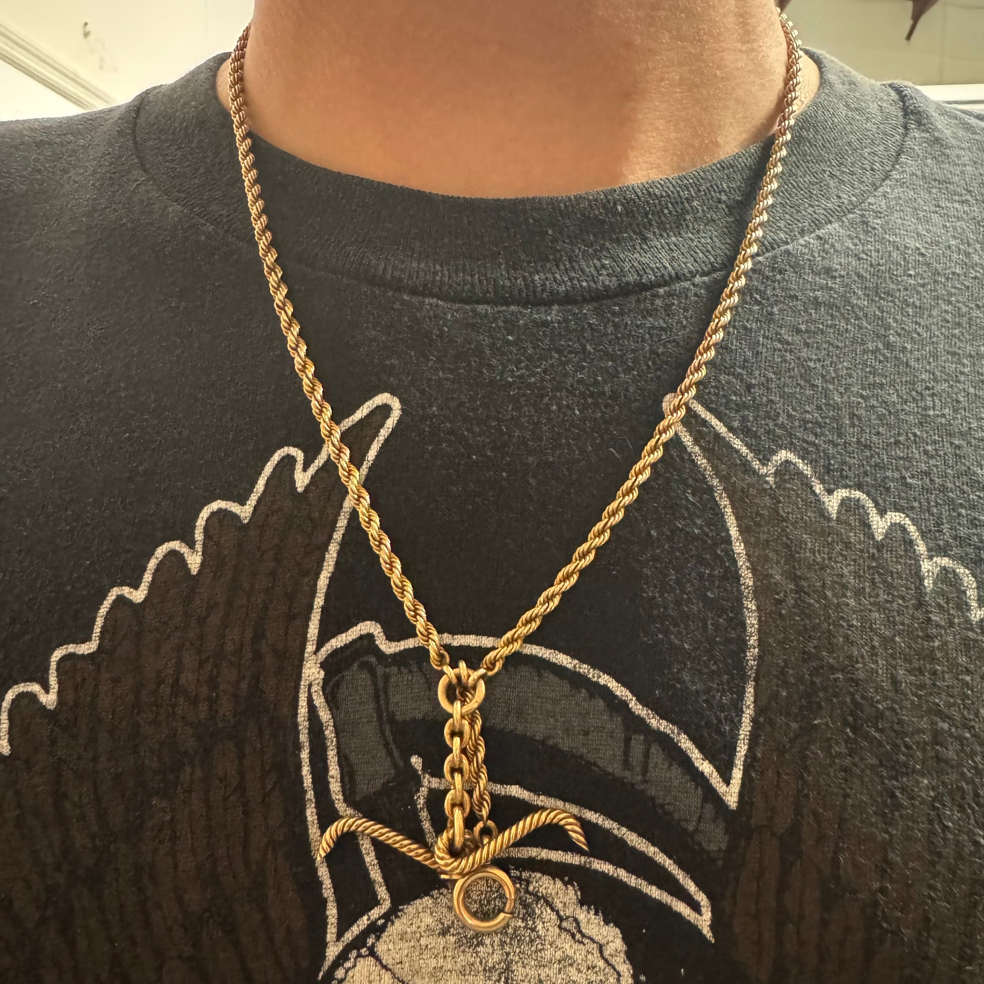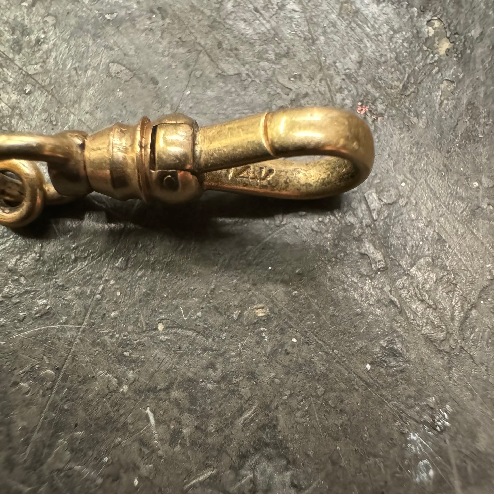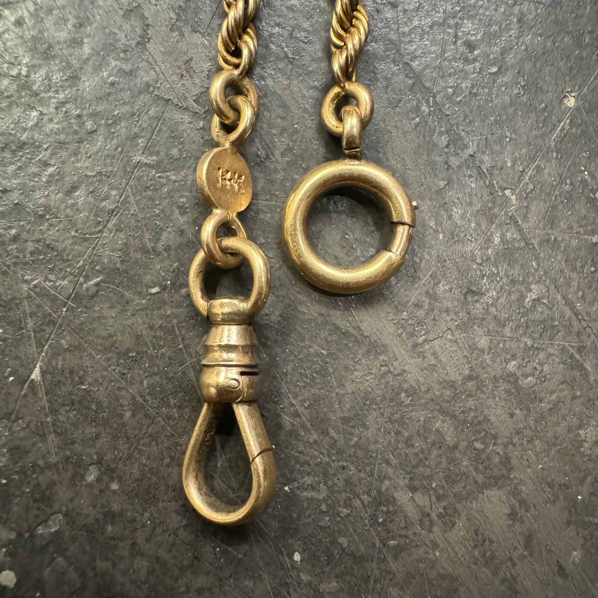 Found together with another all original solid 14k yellow gold watch chain crafted in the 1930’s out of NYC by Castagnetta & Son Inc. from the original owners family. These double Albert watch chains have so many uses and ways to wear them especially since this specific chain is a perfect wearable length for most everyone at 21”. All solid weighing just about 33g this is a hefty piece with the chain thickness of 3.25mm. Comes complete with all the original hardware of spring ring and dog clip as well as twisted ribbed style curved T-bar and extra hanging spring ring drop for extra pendants if you decide, all in tight functioning condition. These are getting more and more rare and expensive as each day passes especially the longer wearable ones like this with the extra drops and hardware at an affordable price cheaper than you will find more than 99% of the places you can even find one at online.