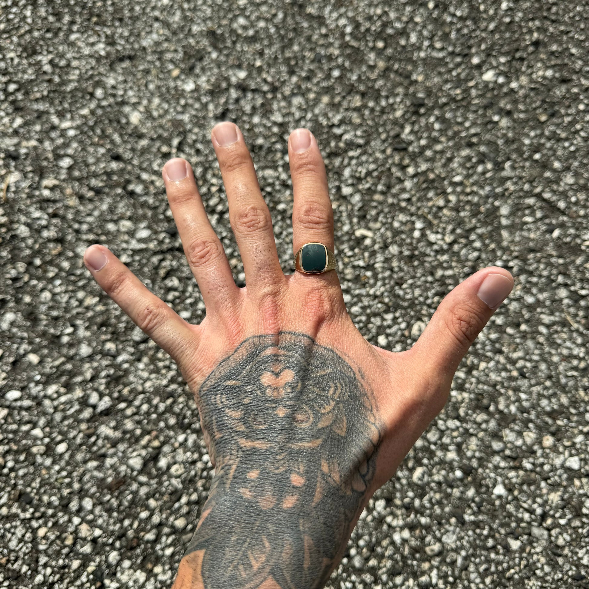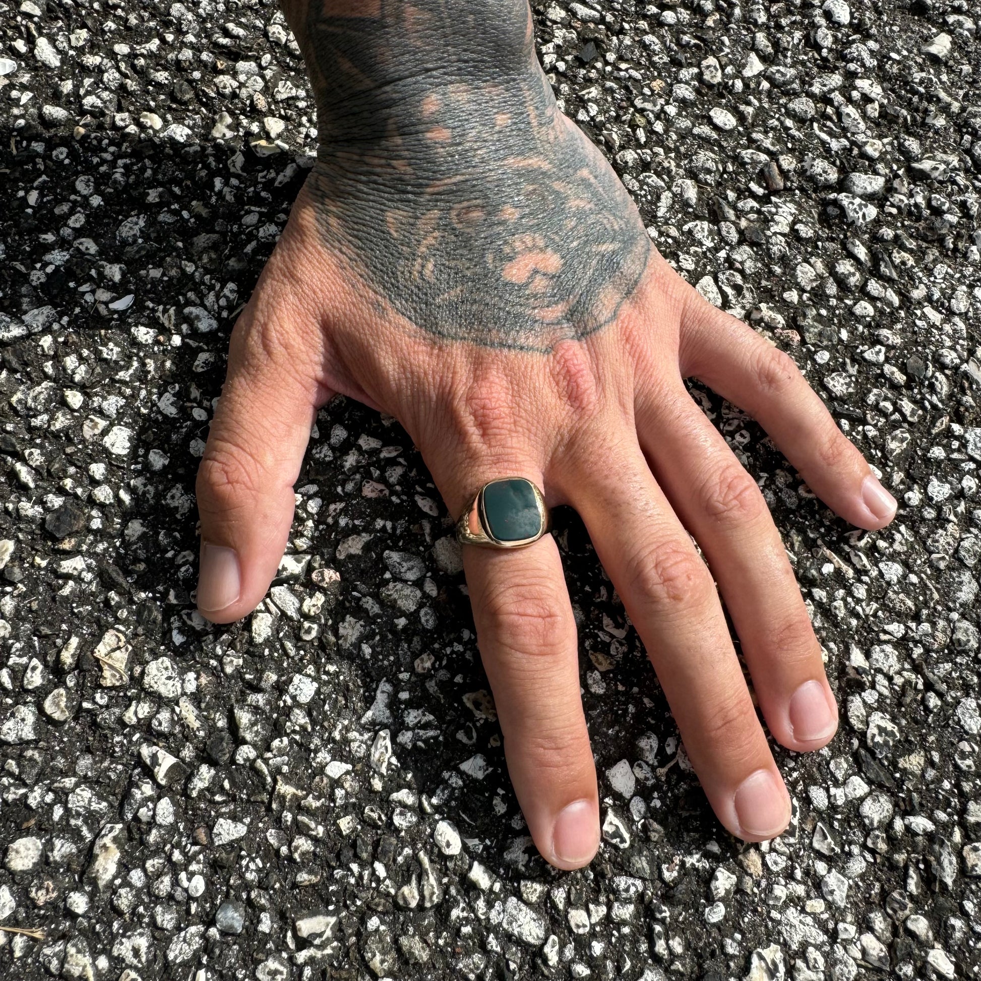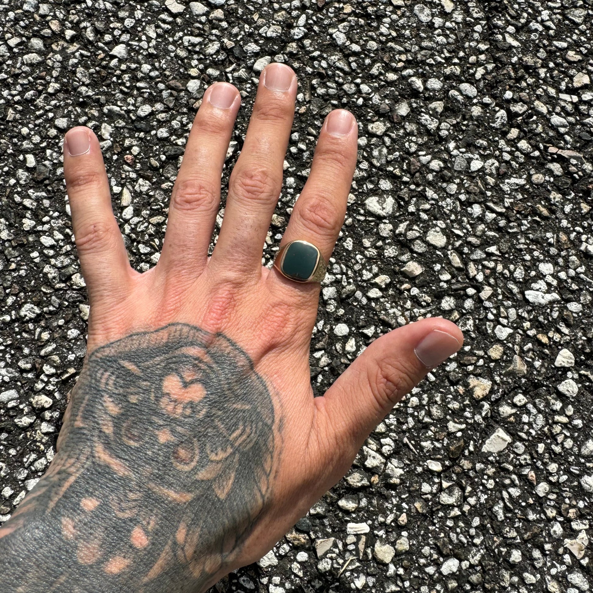 One of the coolest looking stones of a bygone era, the bloodstone. A darker forest green with lots of blood splatter this 1930’s signet style ring set in 10k yellow gold is in great condition considering it’s about 100 years old. Some bloodstones you have to look hard just to see a couple specks of blood while this one has large splattering of red all through the entire stone, which has no scuffs or scrapes on the front or back surface to speak of. Deep stamped old school hallmarks this is a true definition of a gents ring that gives off that serious vibe of age with wisdom. A size:9.25 and weighing approximately 6g as it takes up quite a bit of real estate on the finger at 16mm these are getting harder and harder to find and a great example of a prominent piece of the past.