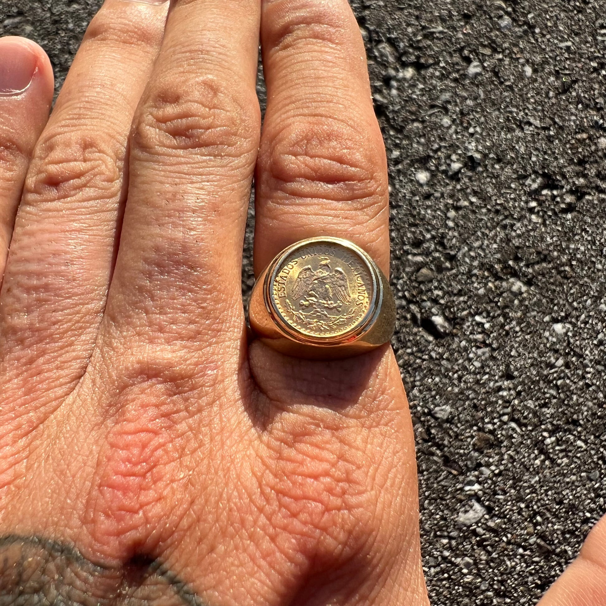 With an exact gold content of .900 (21.6k) weighing 1.666g, the 1945 Mexican dos pesos is a very sought after gold coin for collectors. Not only from a collectors standpoint but with the Mexican national arms eagle and snake insignia it makes for a very cool looking ring. The coin is set inside a 14k high polish signet style ring size 8.5 with an overall combined weight of 8.1g