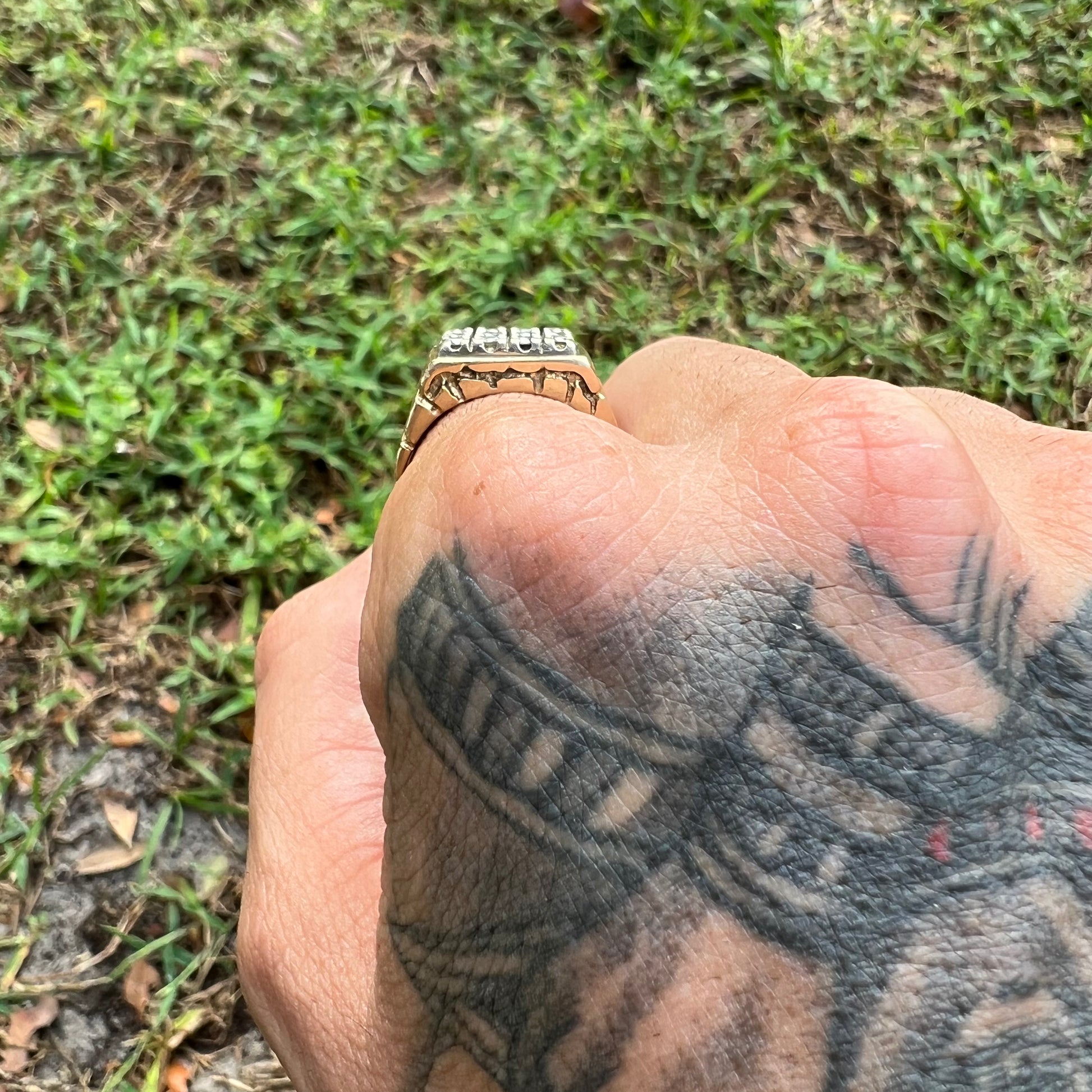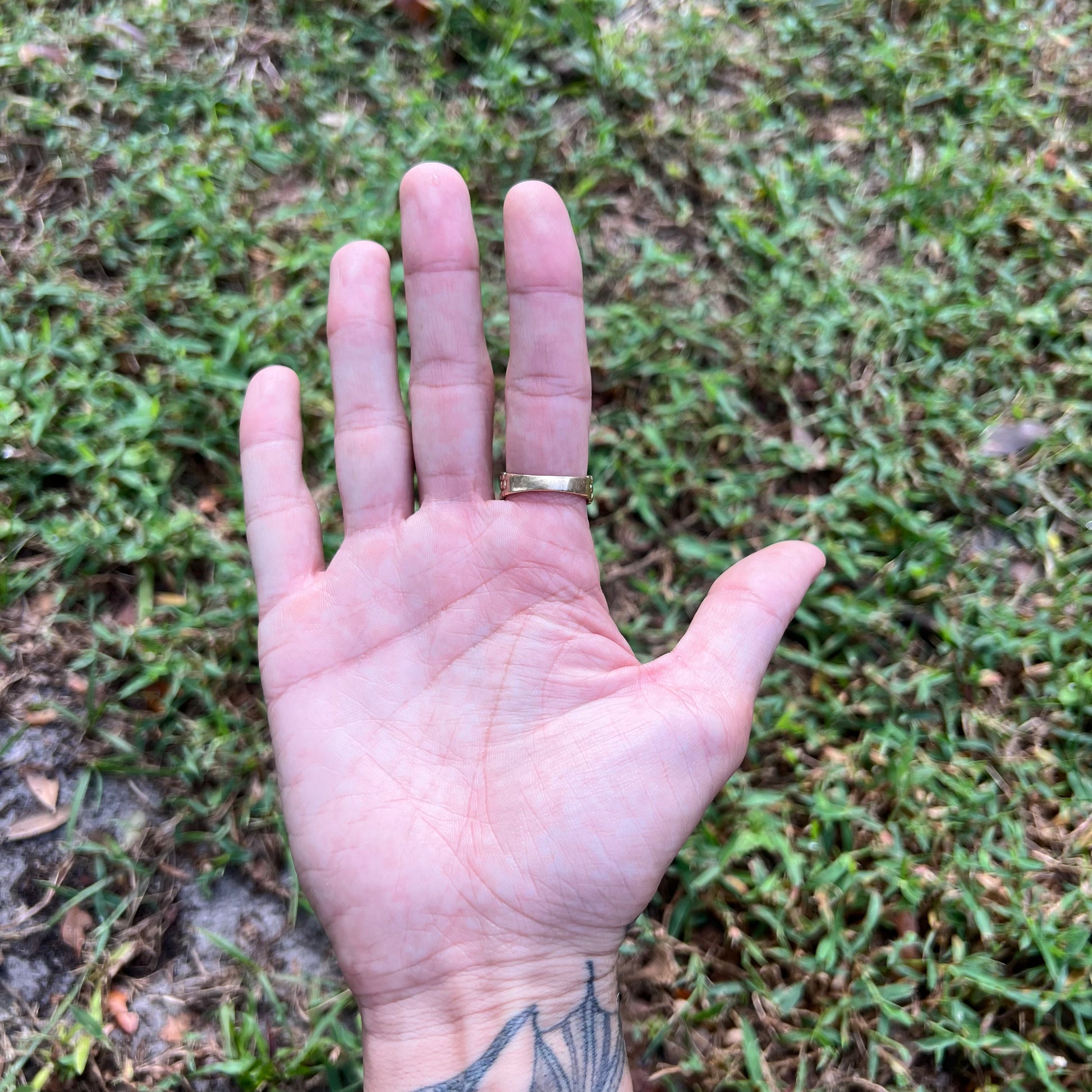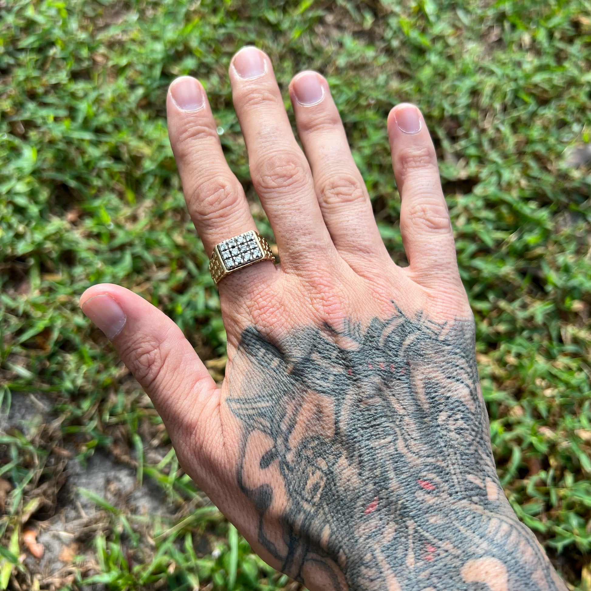 1960’s modernist style 14k yellow gold nugget ring prong set up top with 12 natural .06 pointer diamonds counting up for a total of approximately .75ctw of great clarity and color. Weighing just under 9g and a size:11.5 this is a strong ring that can be worn all day while doing outside work, taking a fall on a skateboard, or any other physical activity without having to worry about knocking a stone loose or damaging the ring.