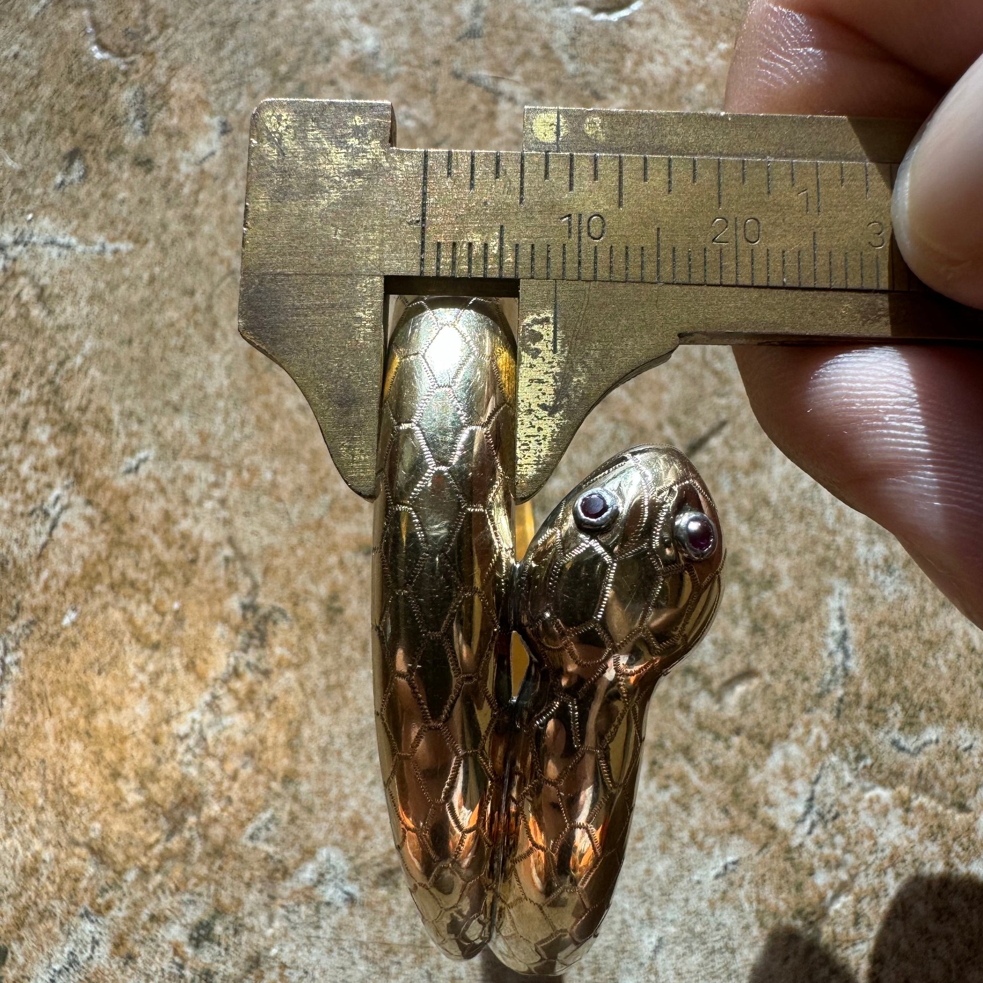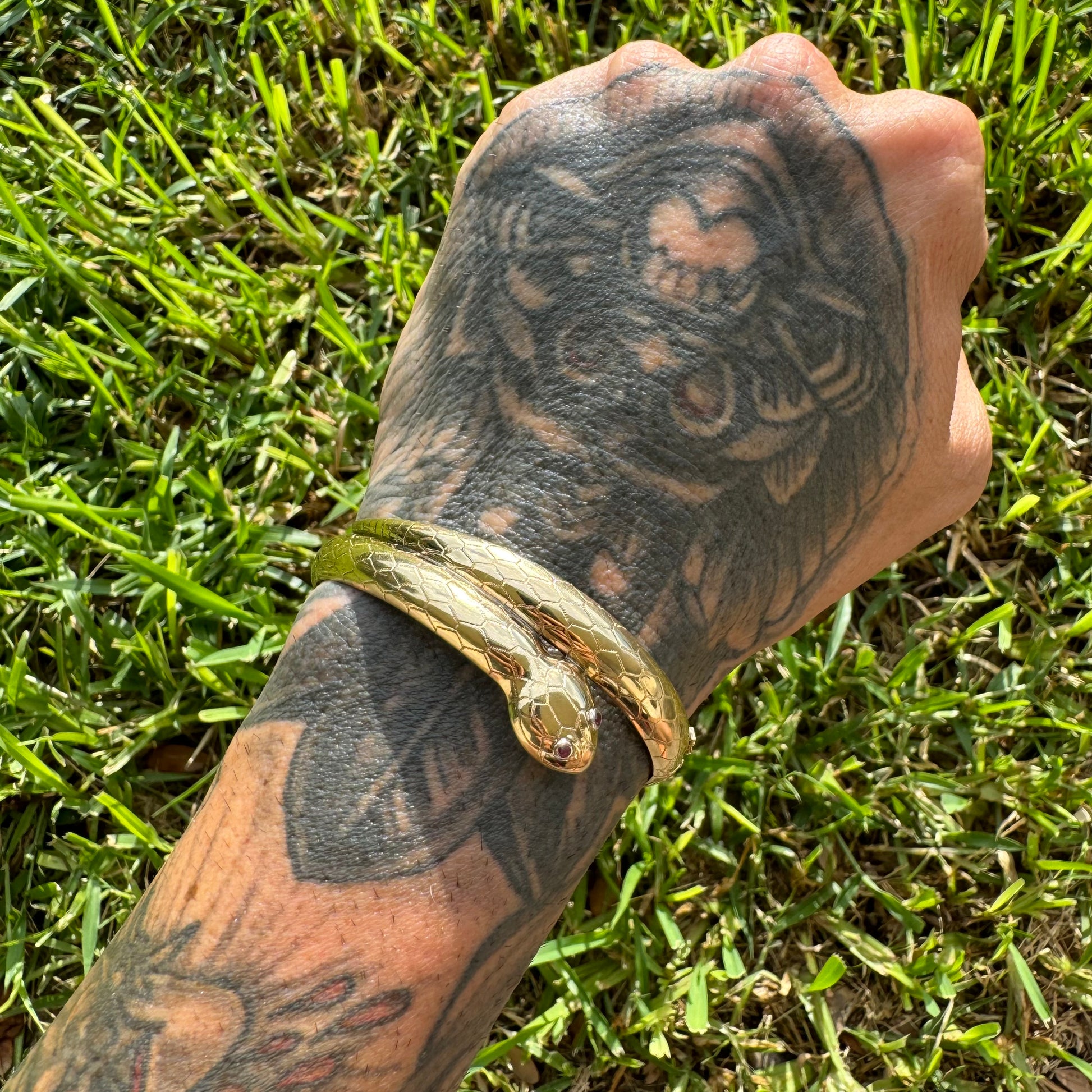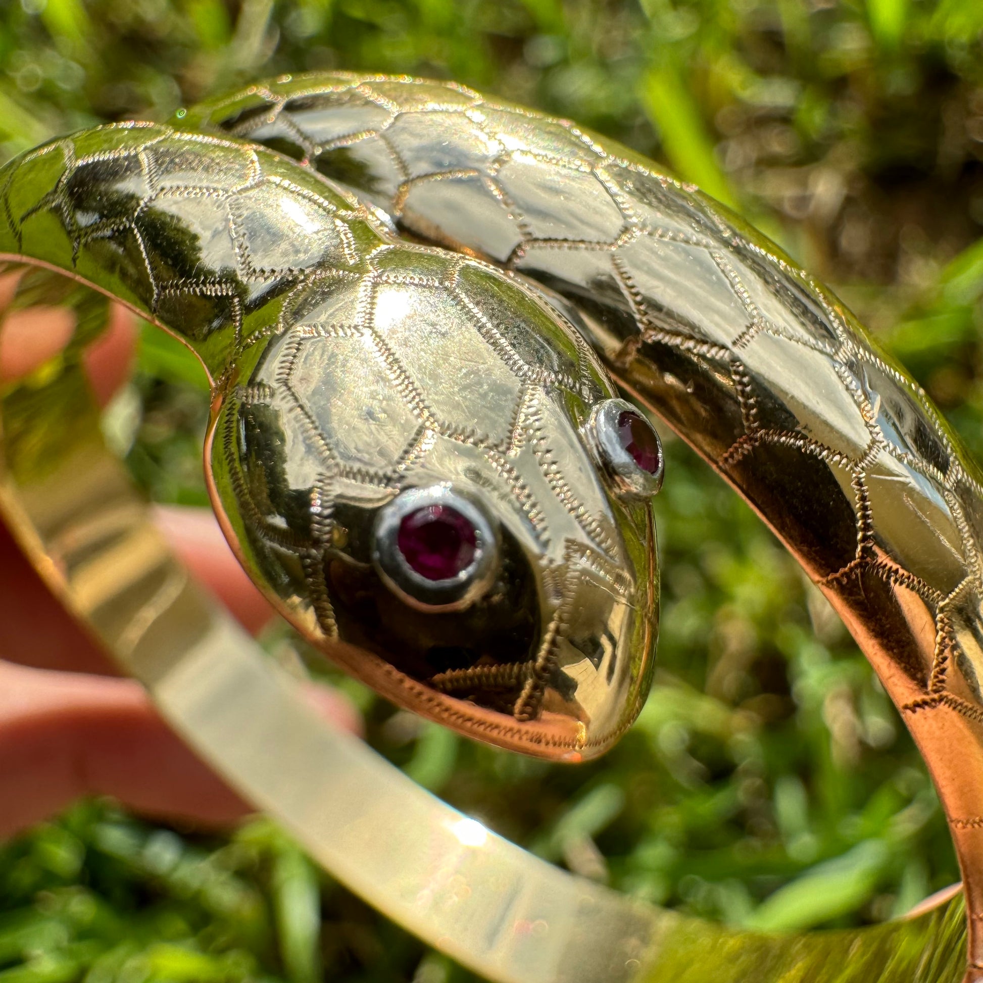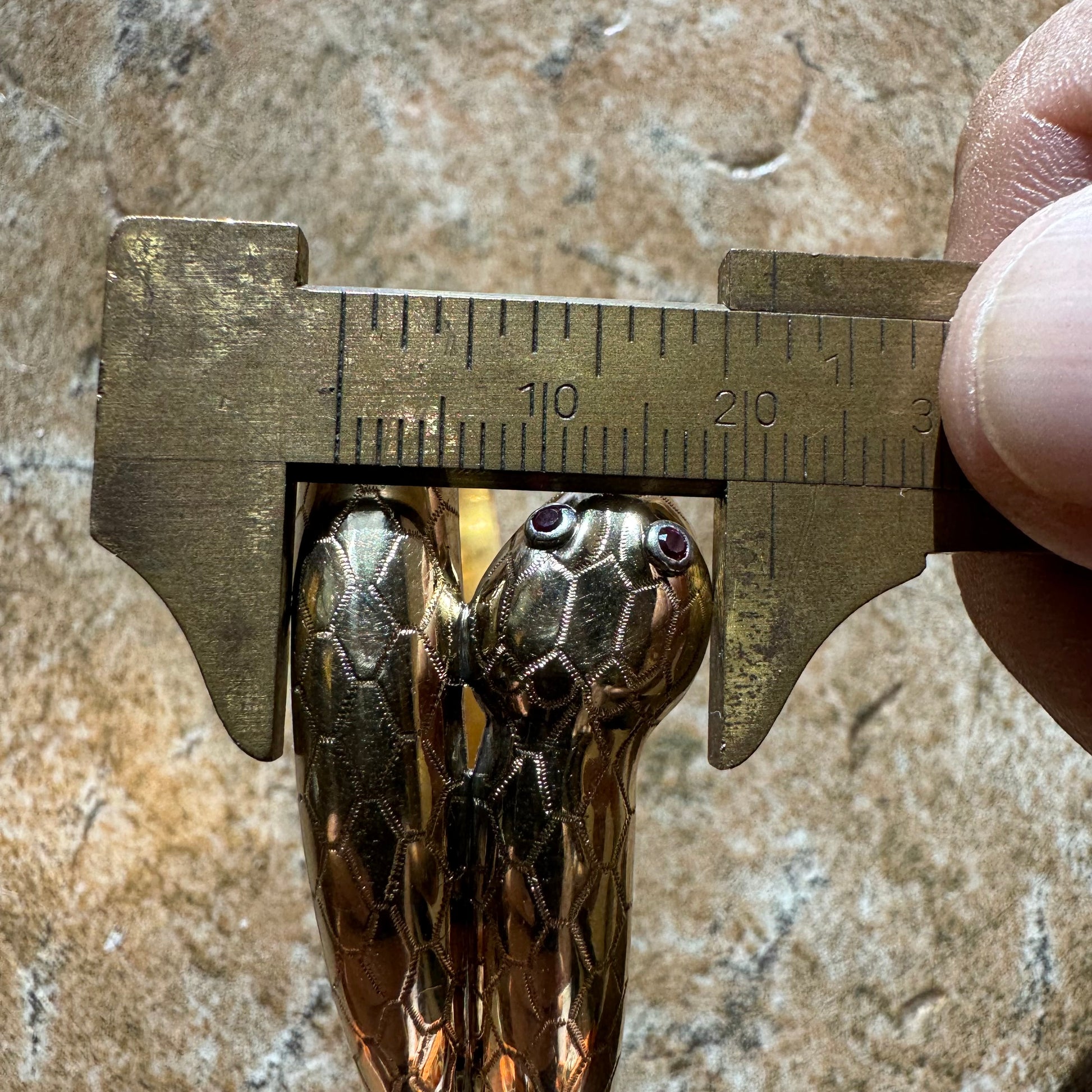 Damn this piece is so fierce. Transport yourself back into the 1960’s when this piece was made by the hands of a skilled artisan jeweler and picture the type of man or woman who wore this bad ass snake. Made out of a high mirror polished vibrant 14k yellow gold with hand chased snake scales engraved fully around this wraparound hinged bangle style bracelet. With 2 bezel set ruby eyes giving off that added touch of aggression from the snake this isn’t just a tame bracelet. In excellent condition there is no scuffs, dents, or scratches to mention as it fits and fastens nice and tight. It has a double lock in place (picture #20) click style tongue and grooved push button lock mechanism for added security as well as figure 8 side latch. Measuring exactly 6.75” around on the inside circumference of the bracelet it fits best for a wearable 5.75” to 6.75” wrist as it has a 21.5mm width at the snake head/tail portion and 8.5mm for the rest of the bracelet and a 3mm thickness with a nice strong, thick walled, and heavyweight of 17.4g. Ones like this don’t come around on the chopping block often and I honestly am hesitant to even sell it.