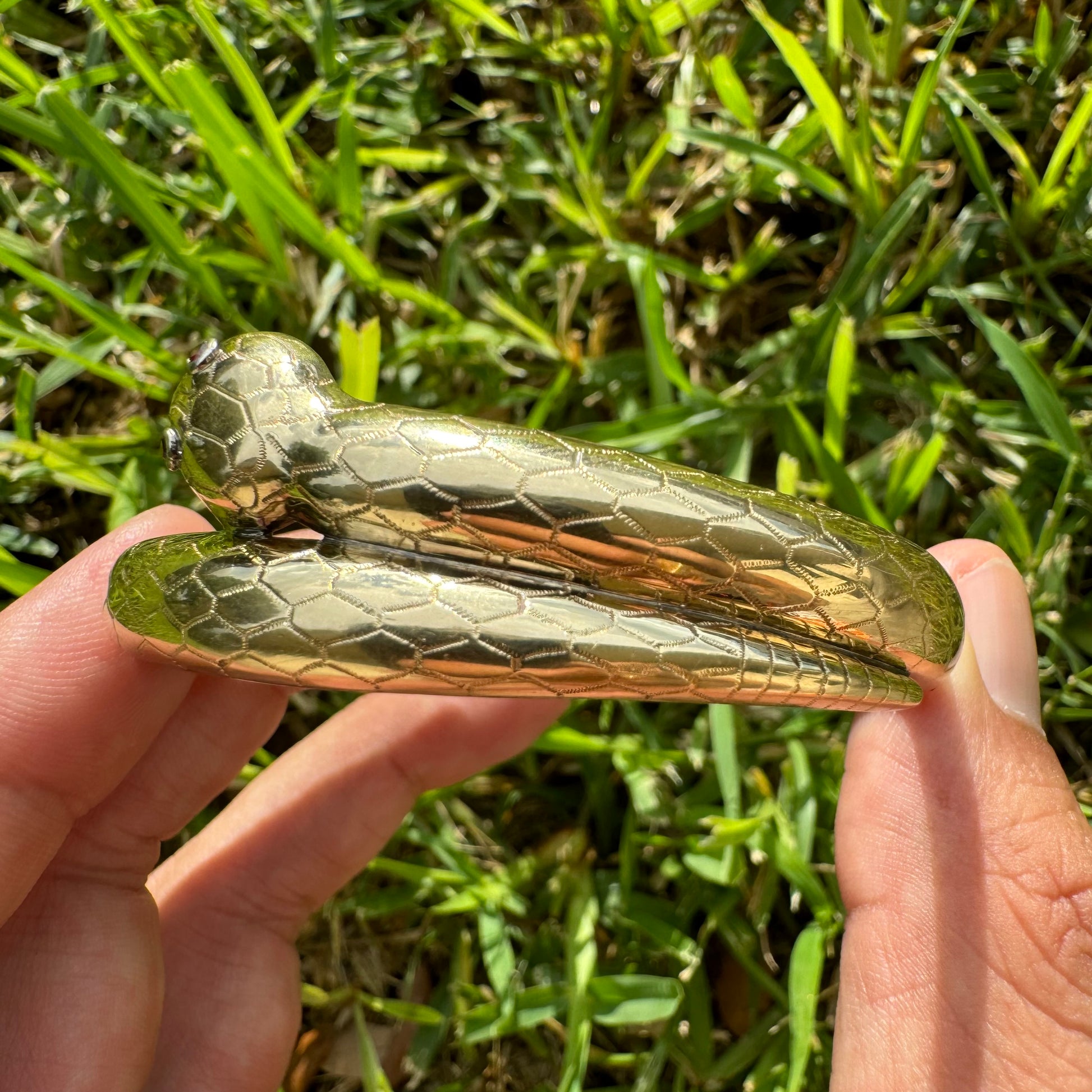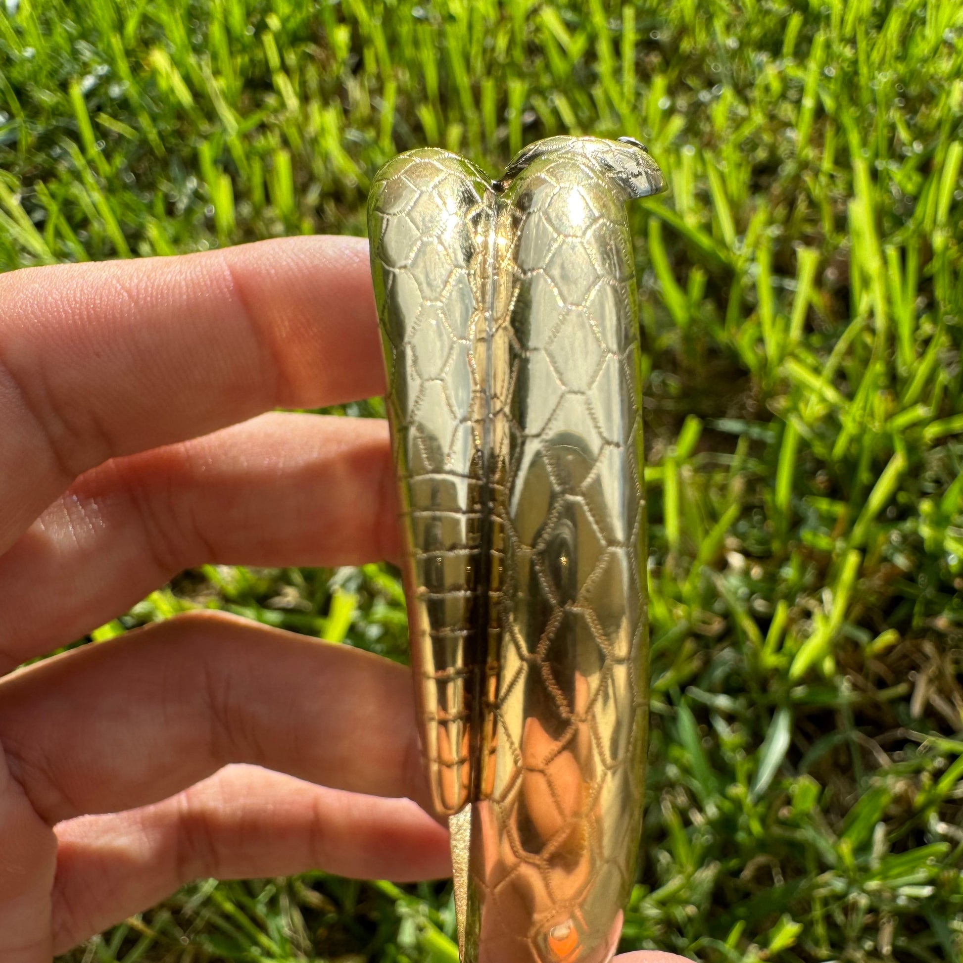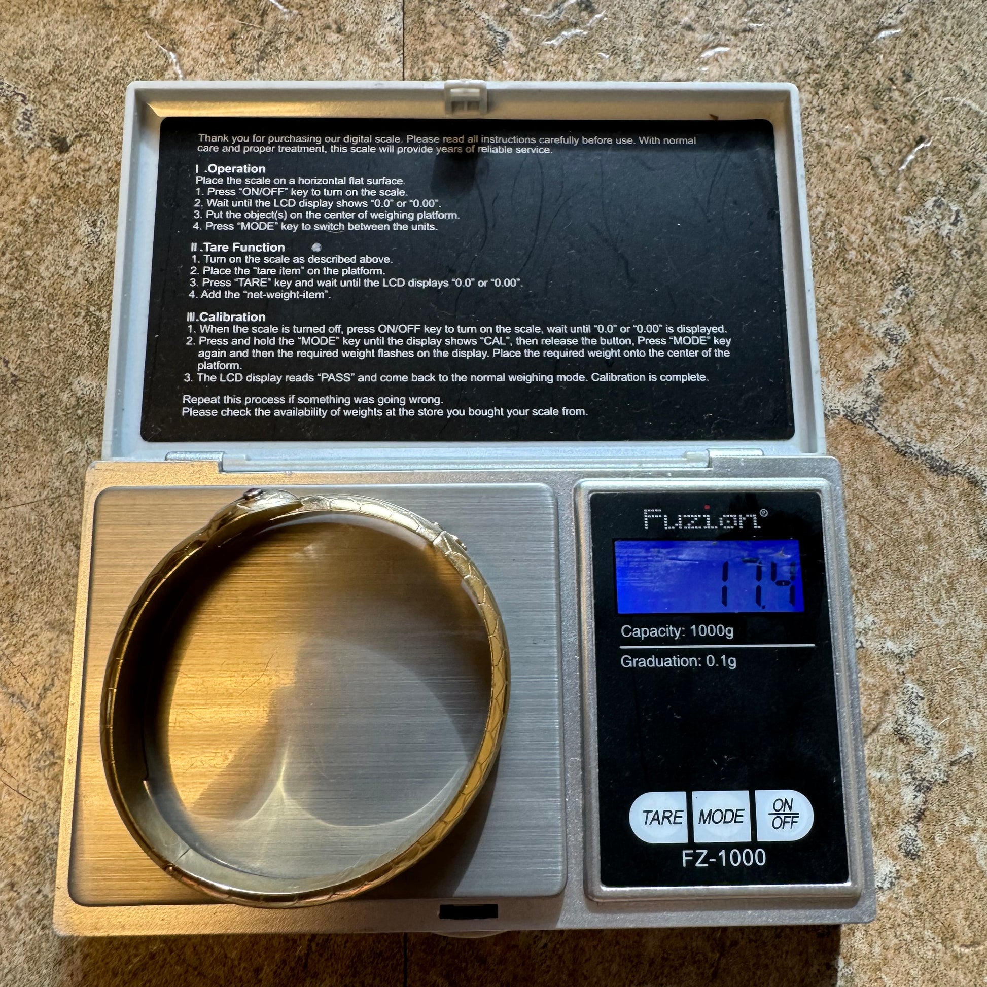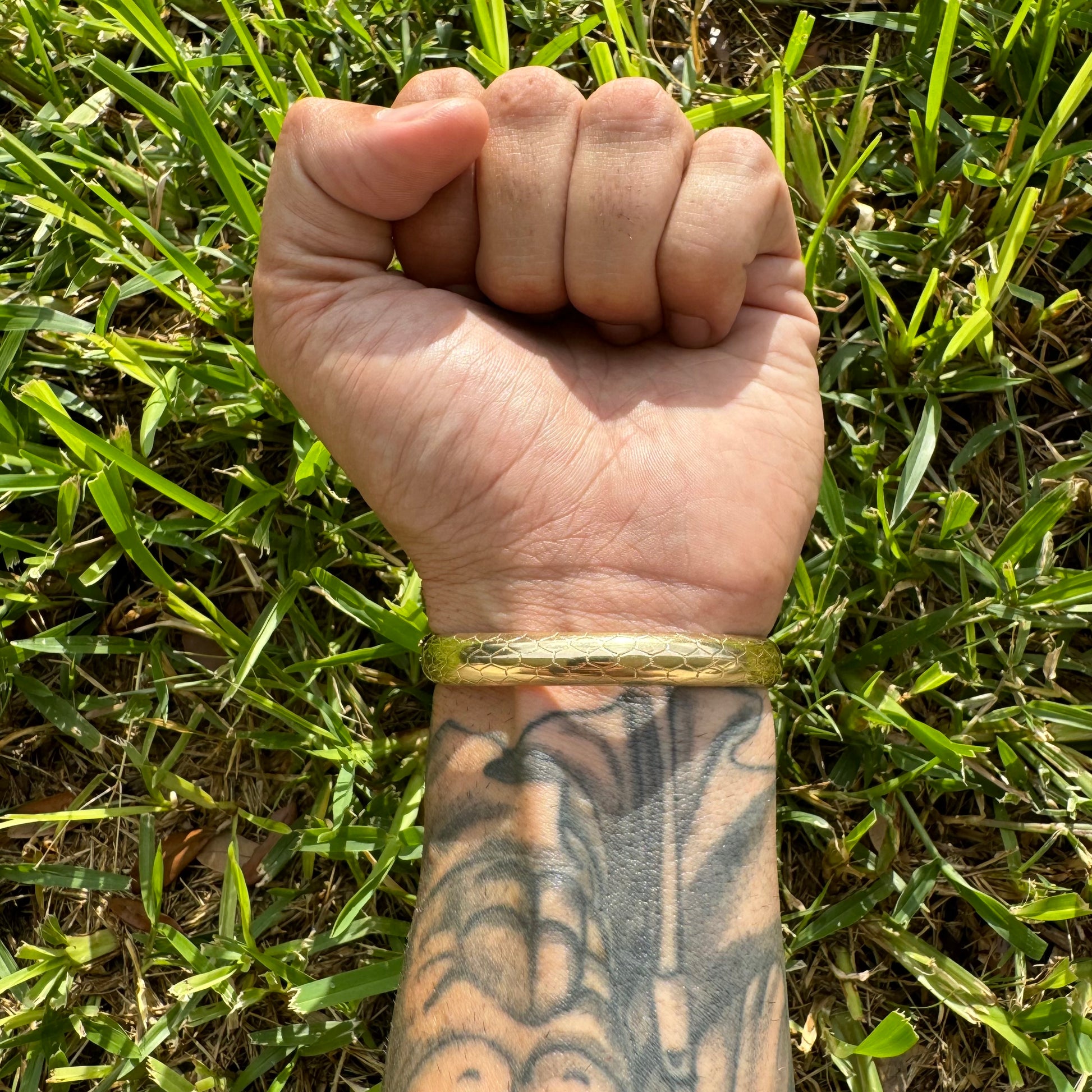 Damn this piece is so fierce. Transport yourself back into the 1960’s when this piece was made by the hands of a skilled artisan jeweler and picture the type of man or woman who wore this bad ass snake. Made out of a high mirror polished vibrant 14k yellow gold with hand chased snake scales engraved fully around this wraparound hinged bangle style bracelet. With 2 bezel set ruby eyes giving off that added touch of aggression from the snake this isn’t just a tame bracelet. In excellent condition there is no scuffs, dents, or scratches to mention as it fits and fastens nice and tight. It has a double lock in place (picture #20) click style tongue and grooved push button lock mechanism for added security as well as figure 8 side latch. Measuring exactly 6.75” around on the inside circumference of the bracelet it fits best for a wearable 5.75” to 6.75” wrist as it has a 21.5mm width at the snake head/tail portion and 8.5mm for the rest of the bracelet and a 3mm thickness with a nice strong, thick walled, and heavyweight of 17.4g. Ones like this don’t come around on the chopping block often and I honestly am hesitant to even sell it.