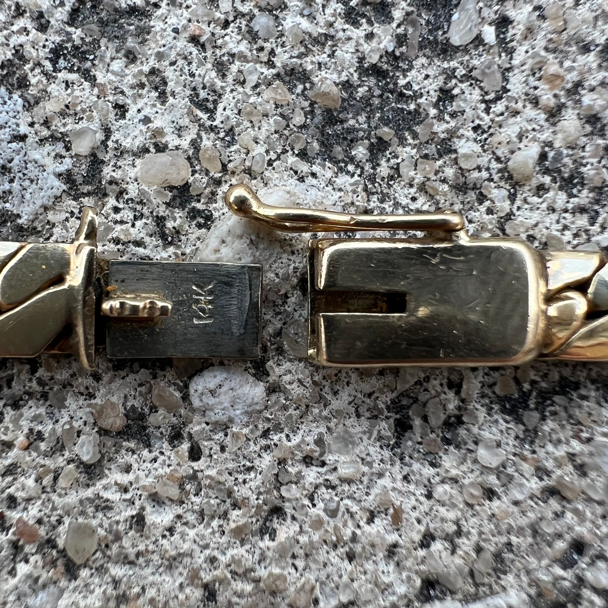Sleek and low profile this old school style sleek Cuban link chain is a very elegant and sophisticated look with the size and weight bringing out that fierce side of things. Solid 14k yellow gold with a strong tongue and groove box lock style clasp with side latch for added protection. 16.5”/5MM/28.1g
