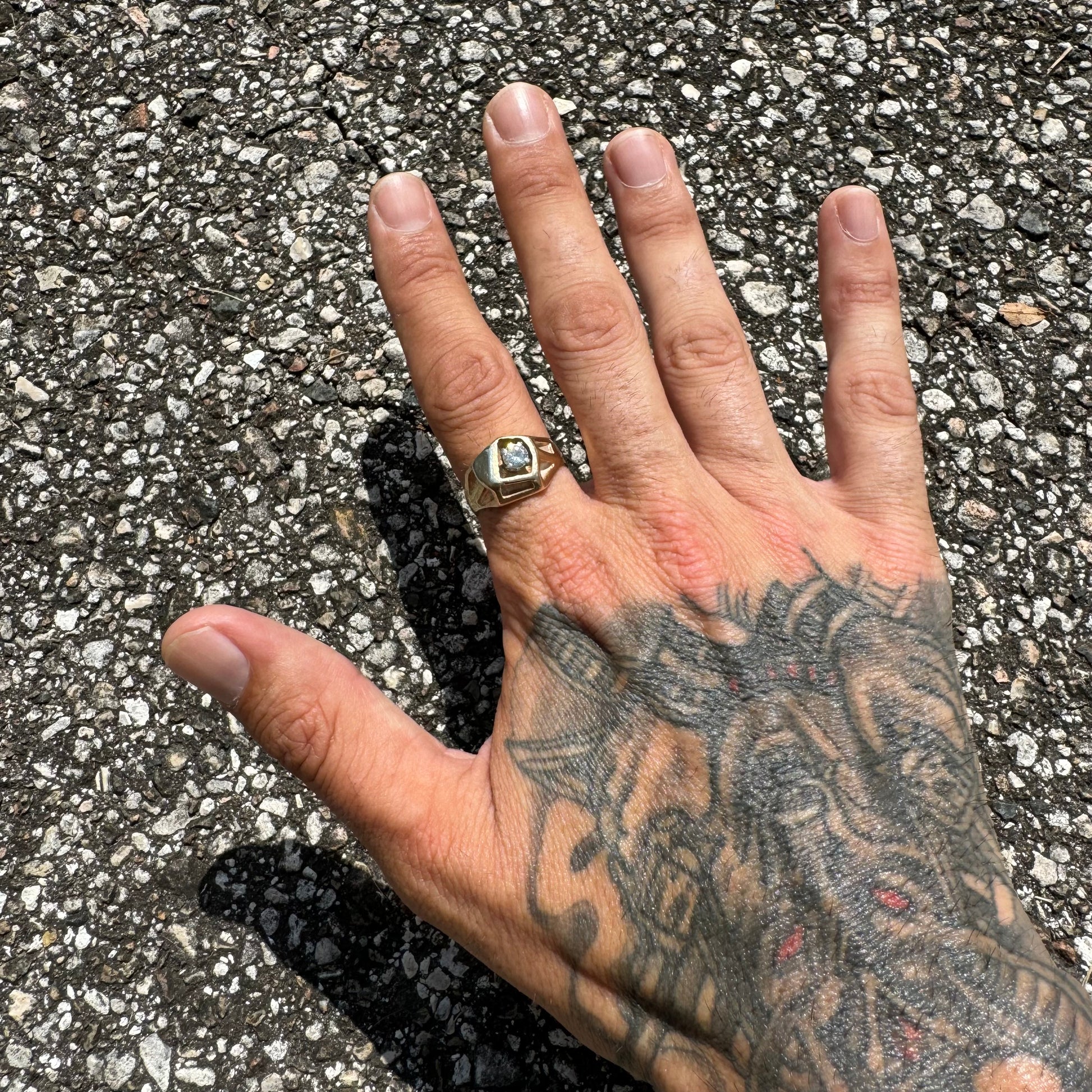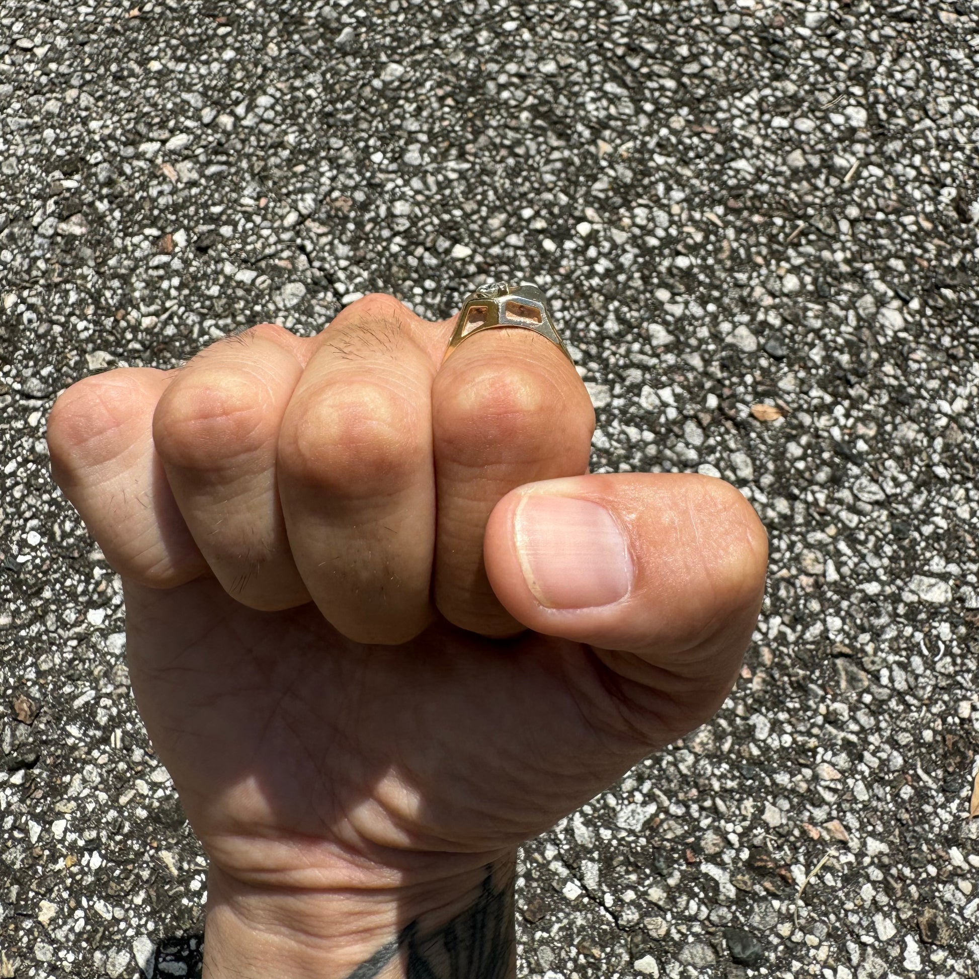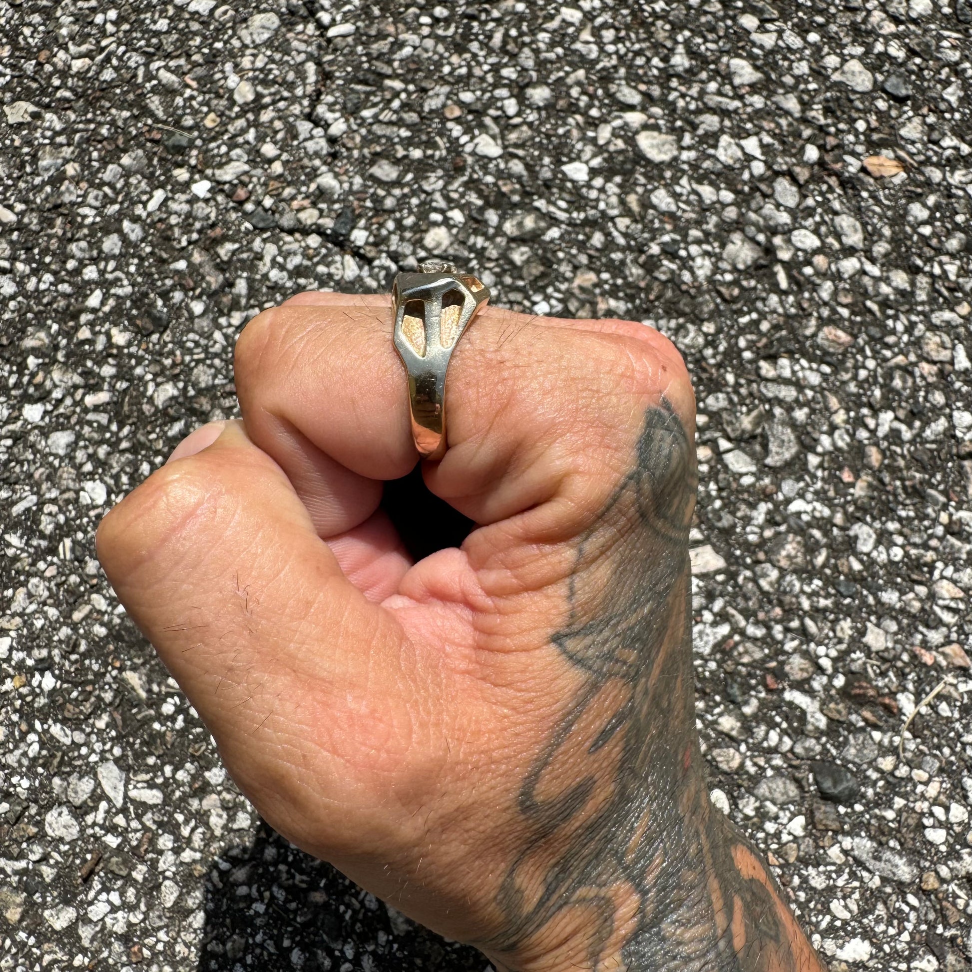 Straight out of the art scene of the groundbreaking and rule defying 1960’s is this very unique modernist style solid backed 14k gold ring. Prong set with a super clean near Vs quality .50ct natural diamond, that looks perfect to the naked eye. The most prominent point on the top of the ring is the sharp slanted edge that has also been plated in a rhodium finish giving off that subtle white gold effect. Surrounded by what I would refer to as a honeycomb look this is by far one of the most interesting looking rings I’ve had in a very long time and can be pulled off with so many different types of styles and looks, a size:10 (which can be easily resized) the ring weighs approximately 9.2g and takes up quite a bit of the knuckle at 14mm.