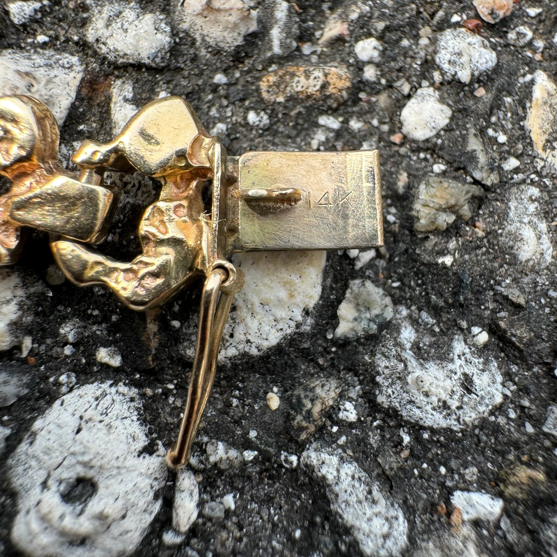Crafted out of solid 14k yellow gold sometime around the 1960’s is this old school style freeform nugget link. When you do see old Nugget bracelets around they never look quite like this. A very unique hinged style link with very buttery color reminiscent of an 18k tone. This had a very rough and tough look to it with a pinch of class and elegance. You can even take this one step further in the future and set diamonds or precious gemstones into the openings of the links. Measuring approximately 7.75” in wearable length by 10mm wide and a hefty 16g this is a phenomenal deal for a top caliber old school piece like this.