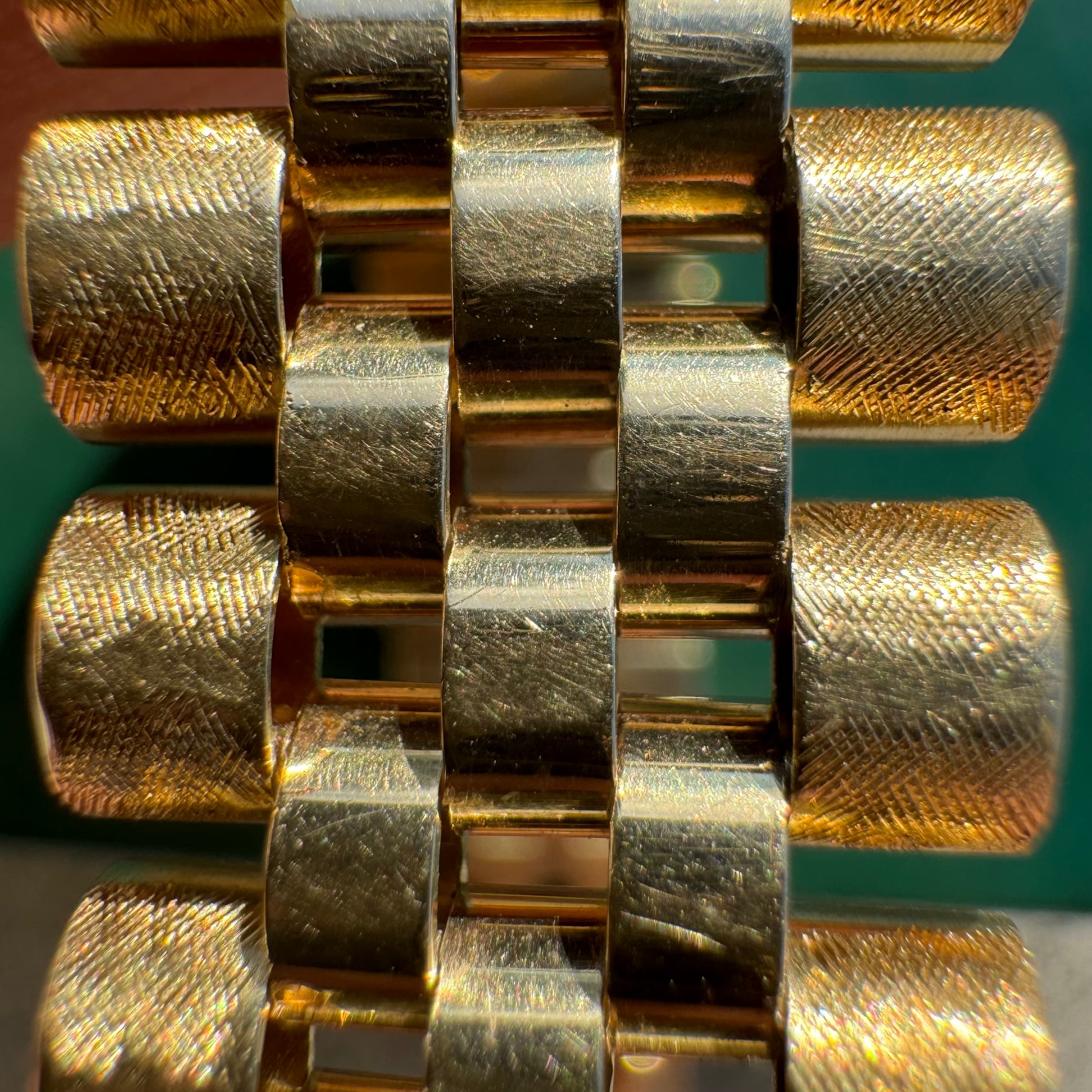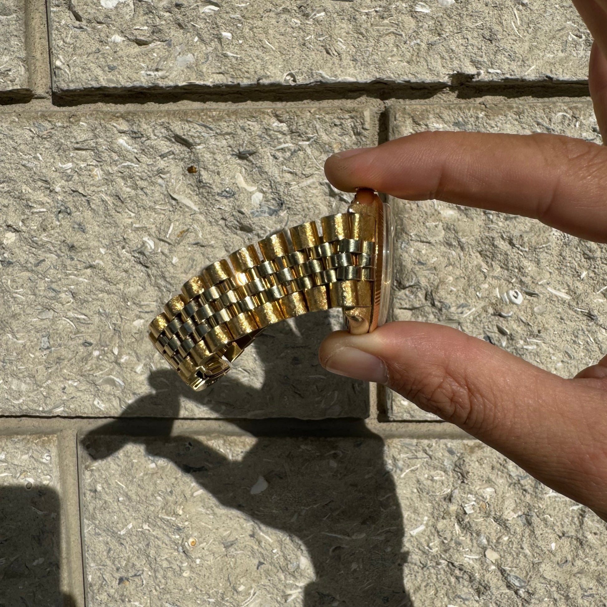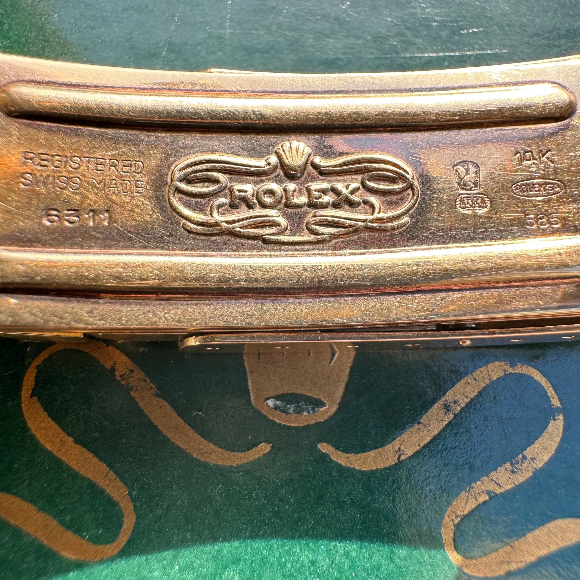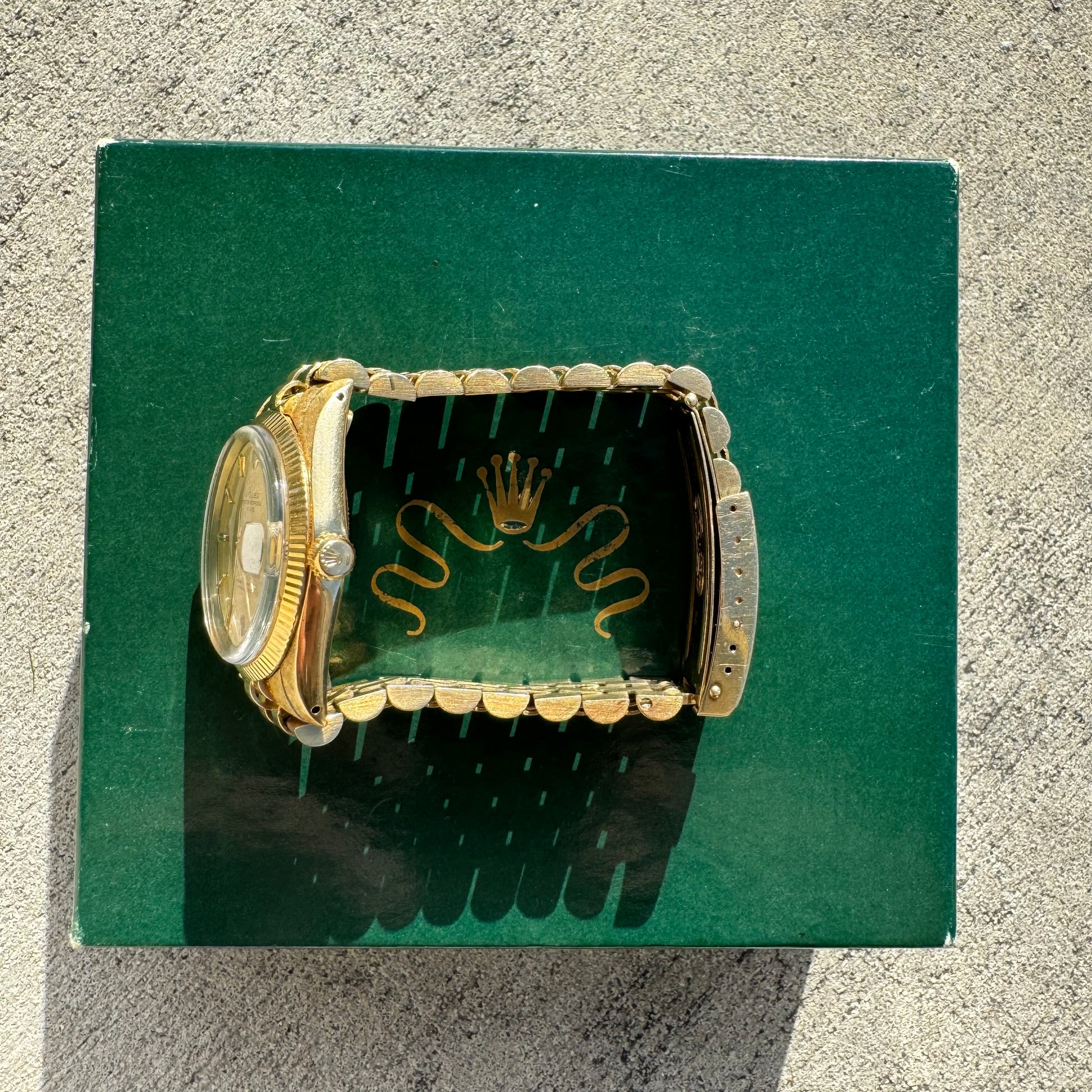 Let’s bring it back to the old school with this masterpiece. The 14k yellow gold jubilee bracelet has been accented with a Florentine finish all done skillfully by hand and is currently fit to a 7.5” wrist. Reference #1503 this Rolex “Oyster Perpetual Date” model has a serial number of 1527xxx which brings the dating of this watch to circa 1966 while the case is accented with a gold fluted bezel and houses an automatic Cal. 1570 movement. Crafted fully out of 14k yellow gold the case measures 34mm (without crown) and weighs over 103g, while the lug width is 19mm. The sunburst Champagne dial has gold stick indices with minute markers running along the outer rim. A date indicator with Cyclops magnifier is located at 3 o'clock and glow in the dark luminous hands and hour marks. This watch is in what I would consider great shape especially for its age with little sag to the bracelet and comes with the original boxes all at a very low price well below market value. Will not be sad if this watch doesn’t sell as it’s extremely hard to find any Rolex especially a solid gold model like this for less than market retail value so if you’ve been looking for a Rolex of this caliber you won’t find one this nice for cheaper than this. Winds up and runs great and is ready to go and we’re around as soon as you get it. Just like any used Rolex it will need to be serviced at some point in the future but you should have to worry about that for a while. We all need to thank Bob (who’s first and last name is slightly still visibly engraved on the back of the case) for keeping this beautiful watch in such great shape over the years. Though you can still see how great of condition this is in the pictures I can assure you that it’s in even better condition to the naked eye when you hold it and see it in person.