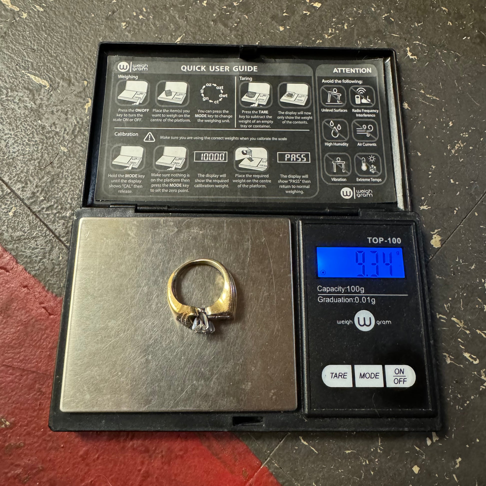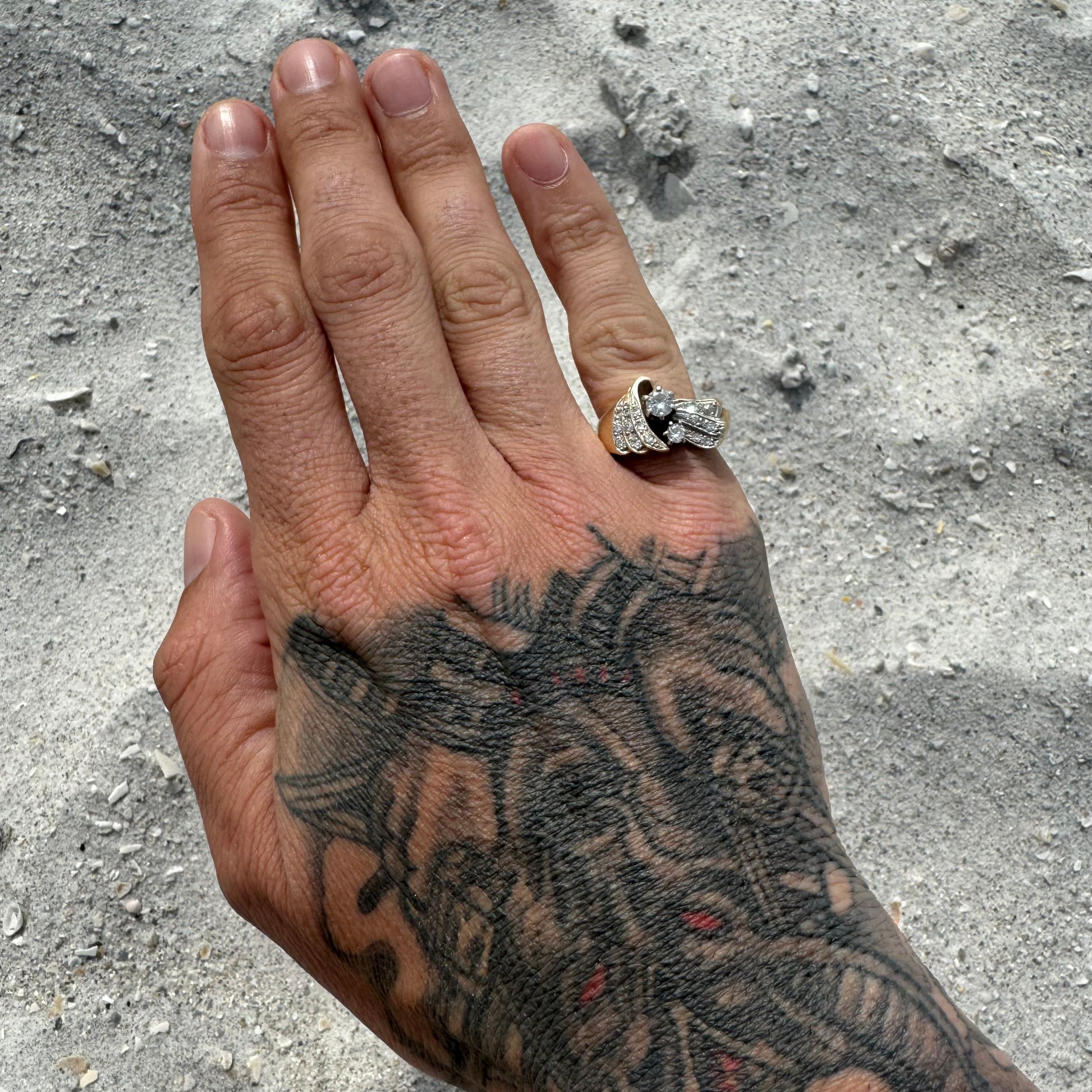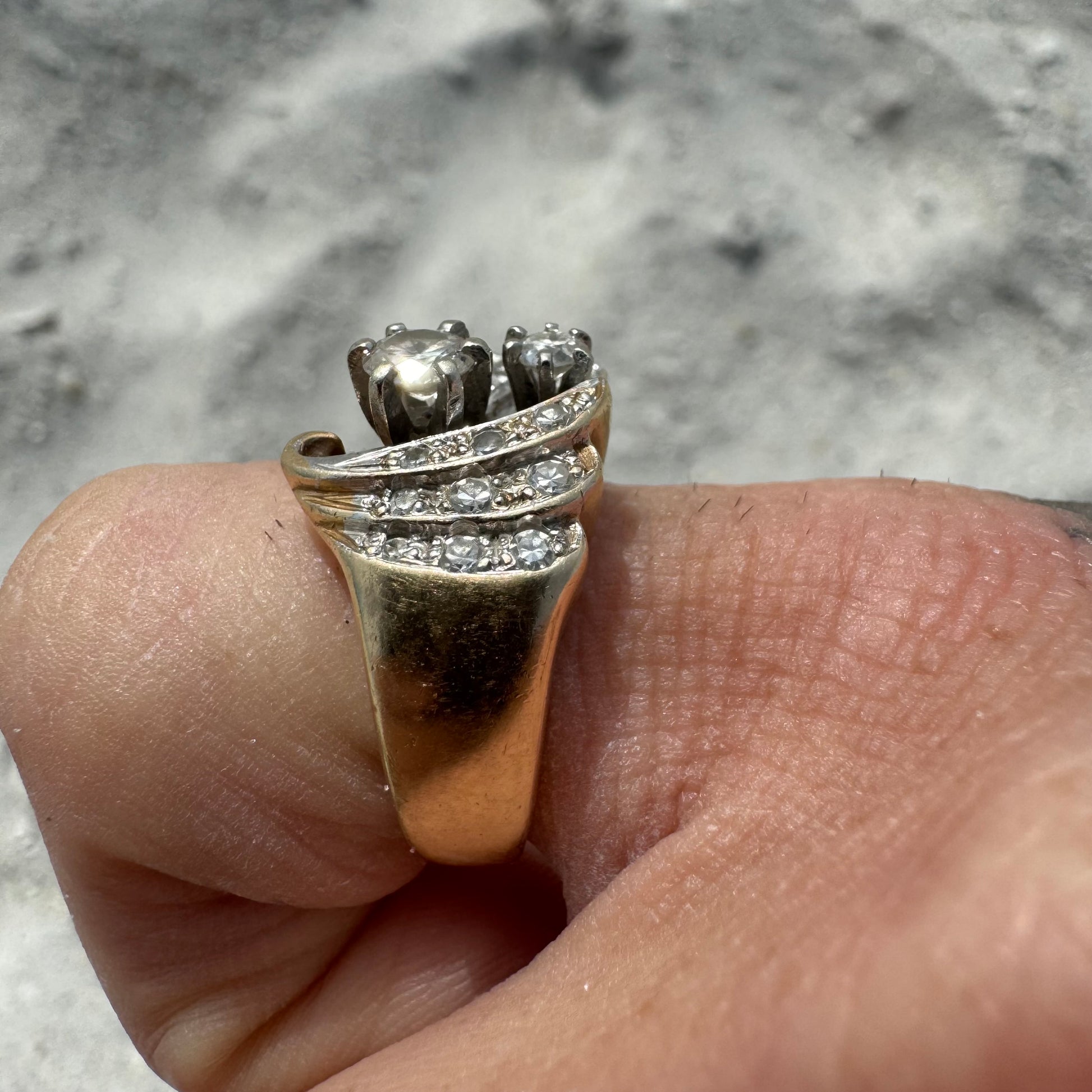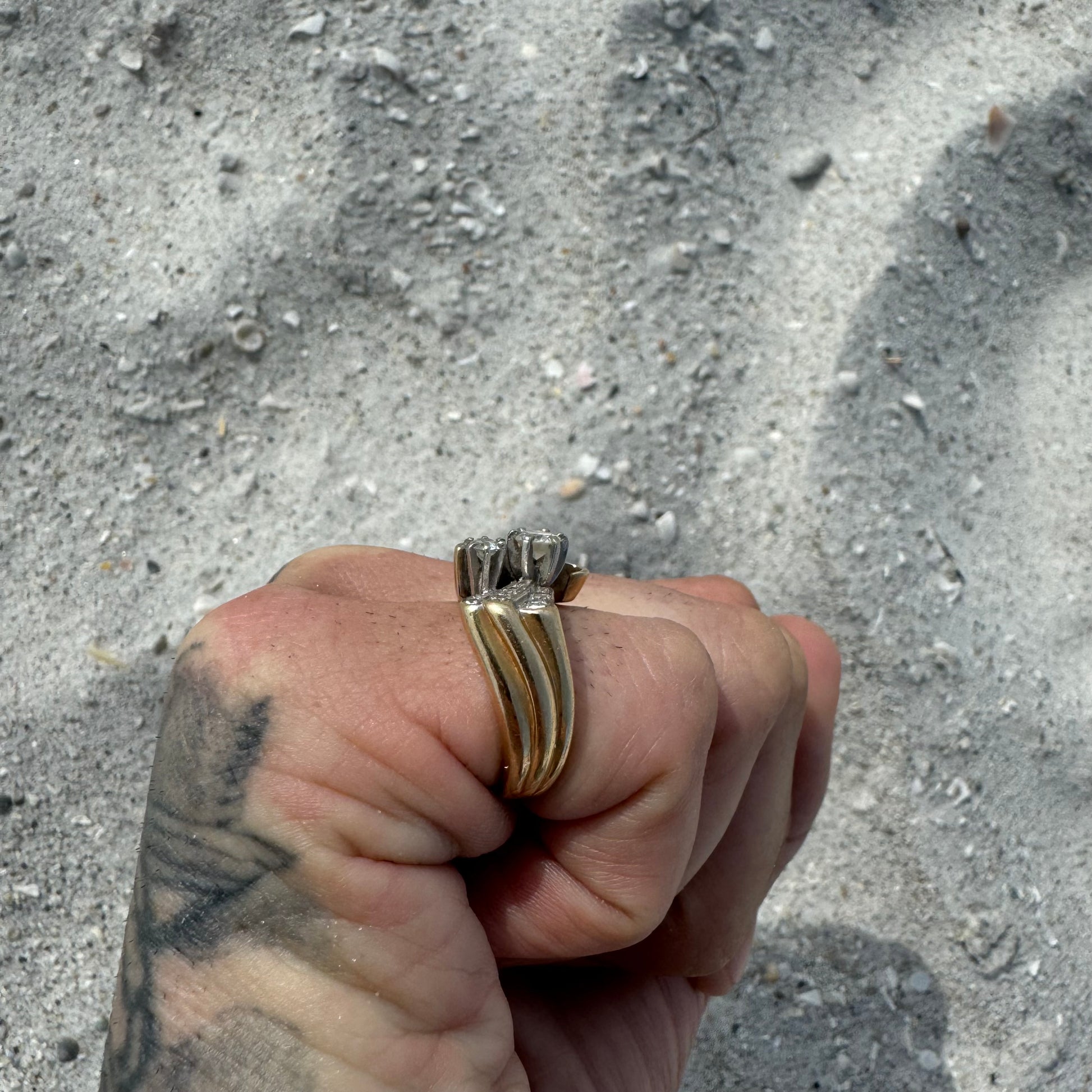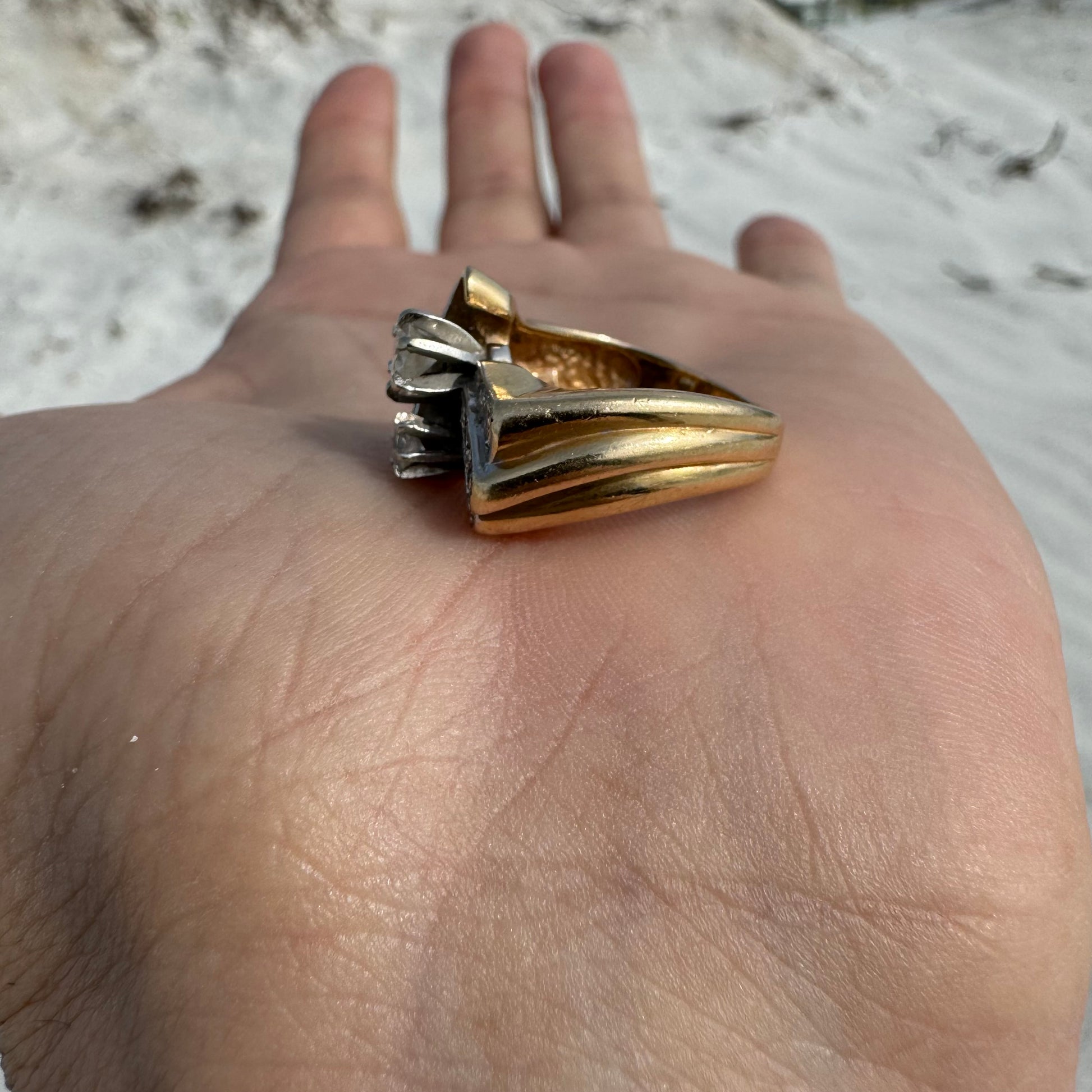 Dated on the inside shank of the ring 1967 by jewelry maker “Stuller” this piece is gorgeous. All hand wrought custom made with a fat .40Ct diamond prong set in the middle next to another very clean .15ct diamond. Reminding me of swept back wings on a bat making their way down in waves of the side shanks and as each level steps up one from another bringing out the brilliance of the flush set diamonds totaling approximately 1.25ctw with all the diamonds combined. Very clean and colorless SI And VS diamonds this chunky heavyweight ring weighs in at 9.34g and sized at 6.5 crafted out of 14k yellow gold with a slight white gold finish up top.