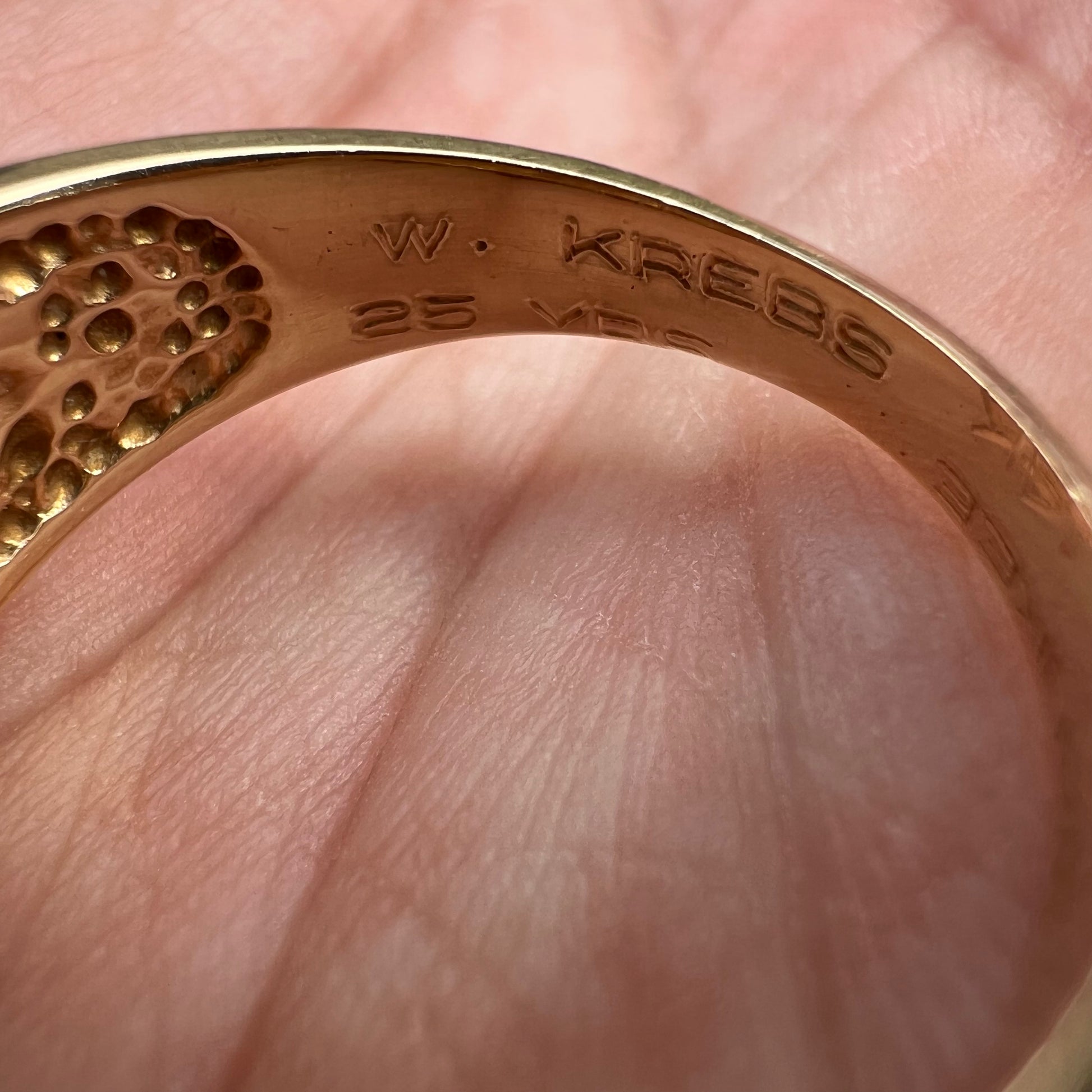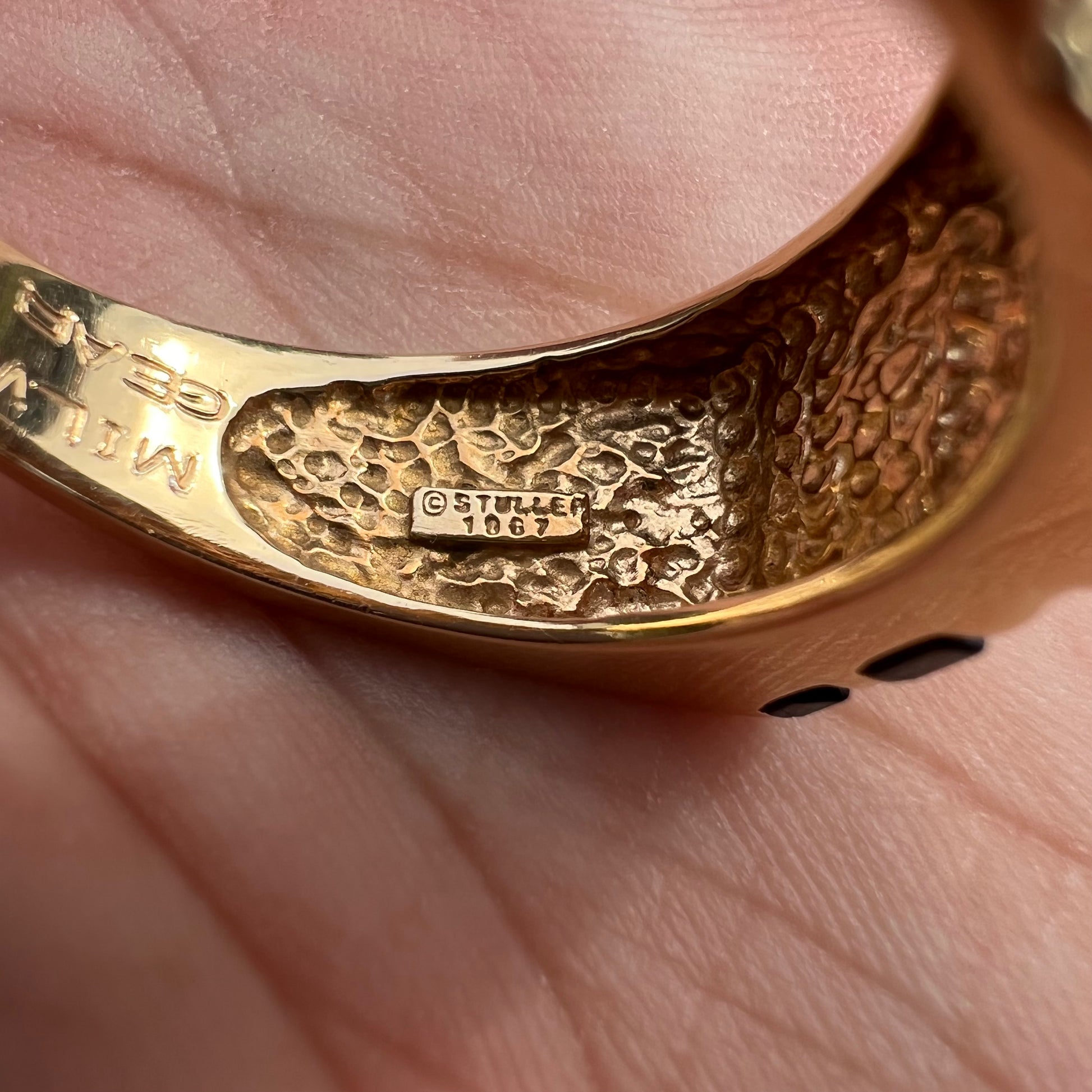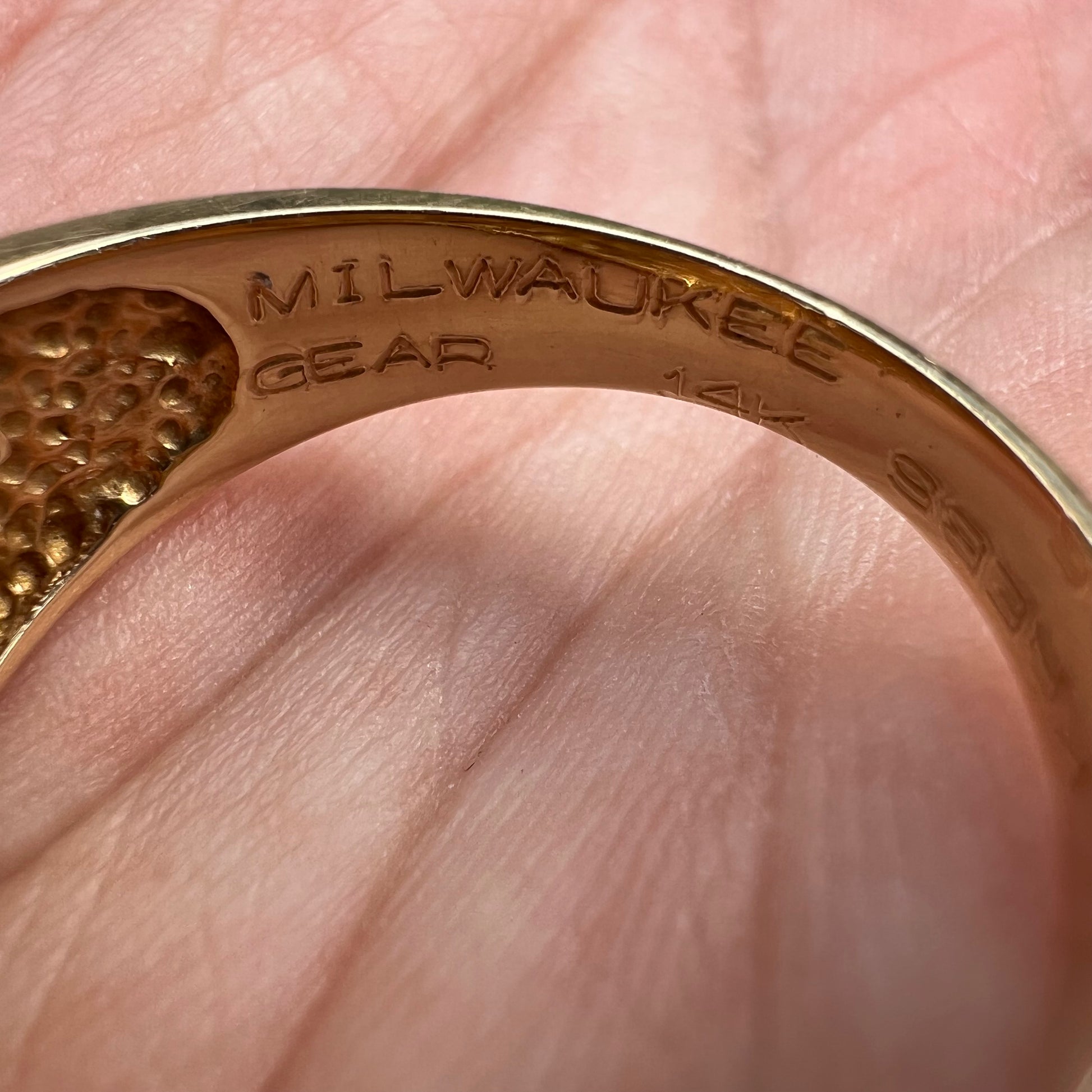 Dated 1967 and made by fine jeweler Stuller this is a very cool solid 14k yellow gold and black only inlaid Nugget signet old school gents ring. On the inside of the shank is engraved “Milwaukee Gear W. Krebbs 25yrs so it was given to an employee of that company for their 25 year service. I looked into it and that company is still around today in Wisconsin and produces drive trains for 4 wheel drive vehicles. Shoot I wish I worked for a cool company that would give away bad ass pieces like this as a thank you for your time and work out in to help a company grow. Unfortunately that’s few and far between nowadays and a thing of the past. This one has a rugged yet sophisticated look and is a size:9 weighing 8.88g