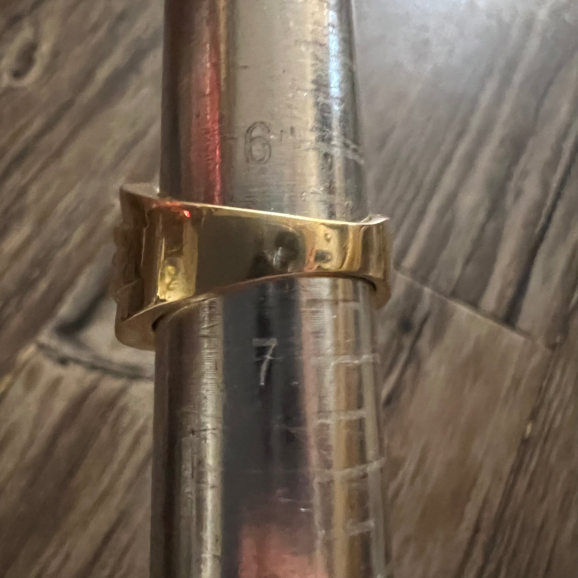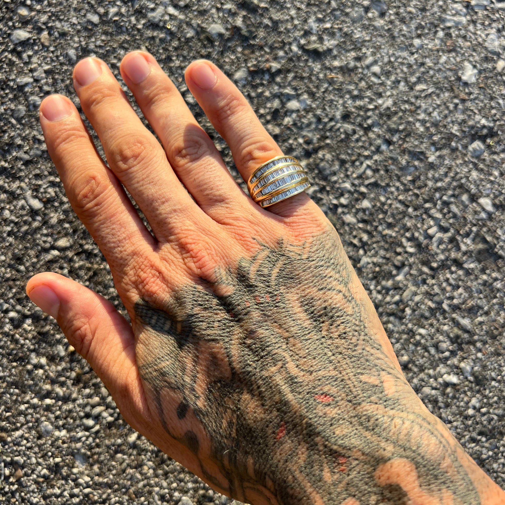 4 rows of 100 natural baguette cut diamonds approximately .035ct each with a total weight of around 3.5CtW. Channel set inside a heavy and chunky 14k yellow gold ring (size:6.5/10.9g). I saw 3 sold comps for similar rings but with less Carat of diamonds that ranged from $1799-$2997. You’re getting an incredible ring at a really great price.