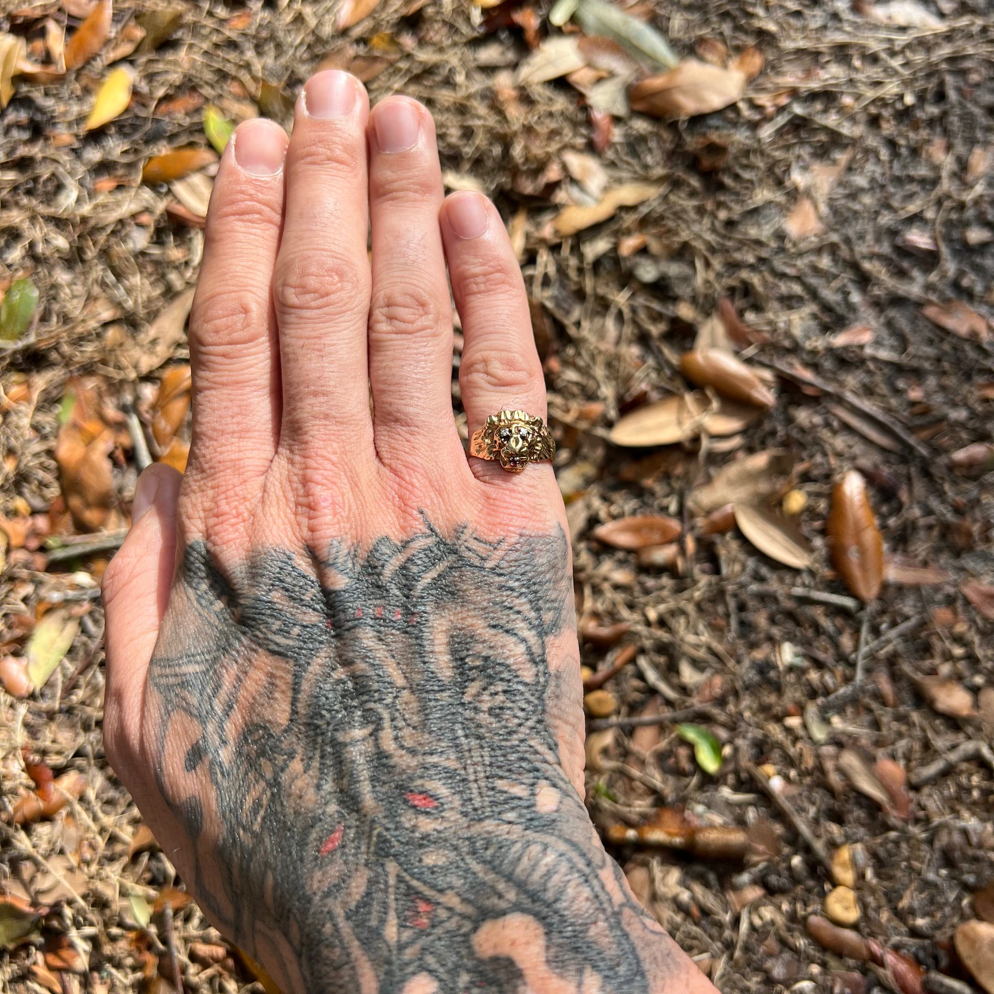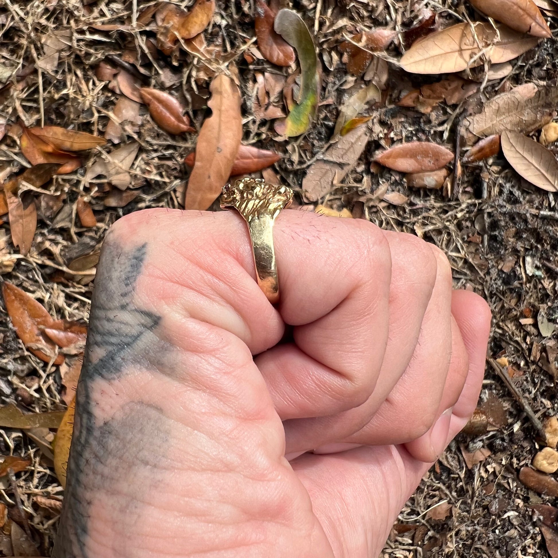 That old school look and patina with a fierce looking lion that wasn’t produced perfectly in a computer and crunched out by the thousands but carved out by hand and then casted in gold. Solid 14k yellow gold with 4 prong set natural Diamond eyes and Ruby encrusted mouth just add that royalty look to this lion made sometime around the 1970’s. Sized at approximately a 7.25 and weighing 4.4g