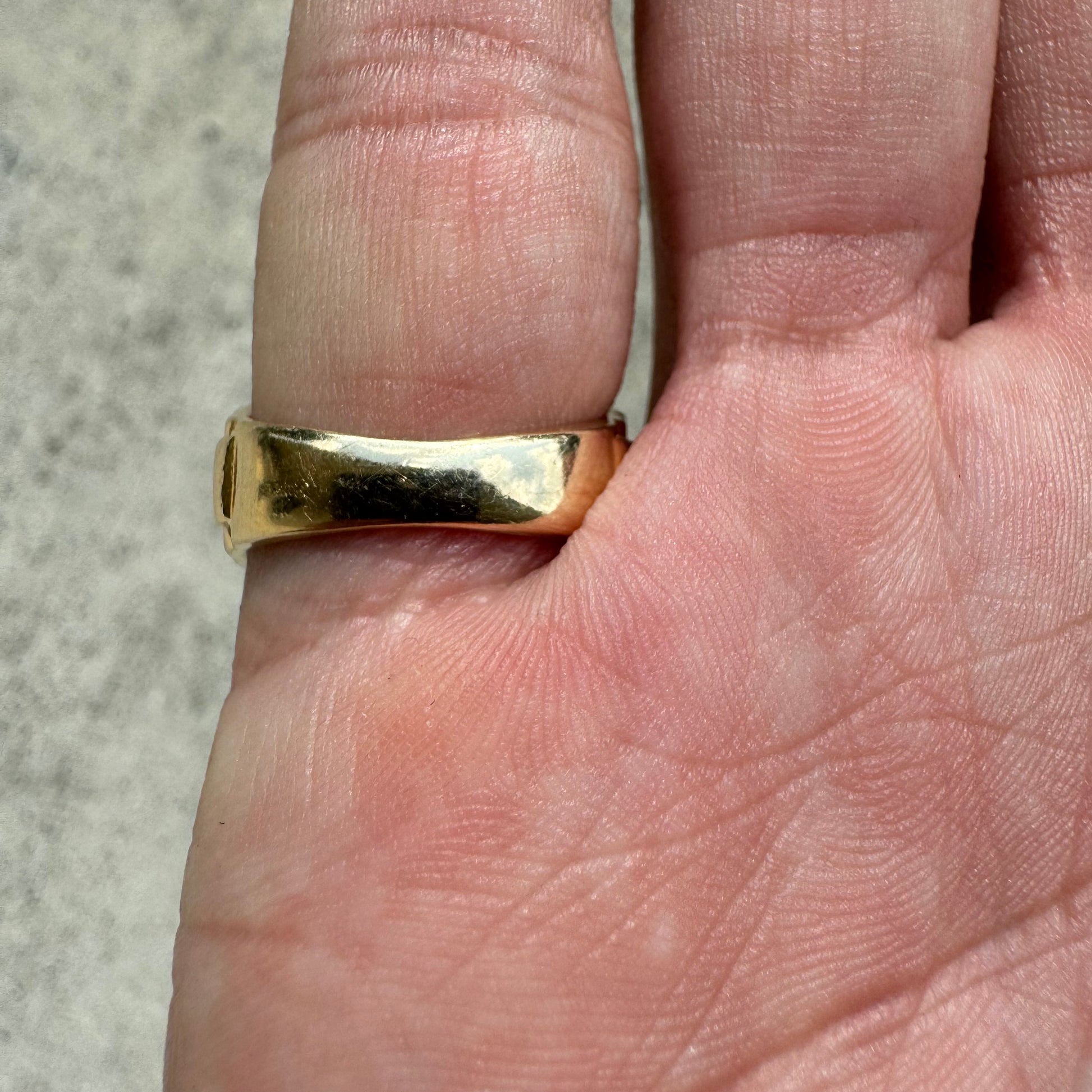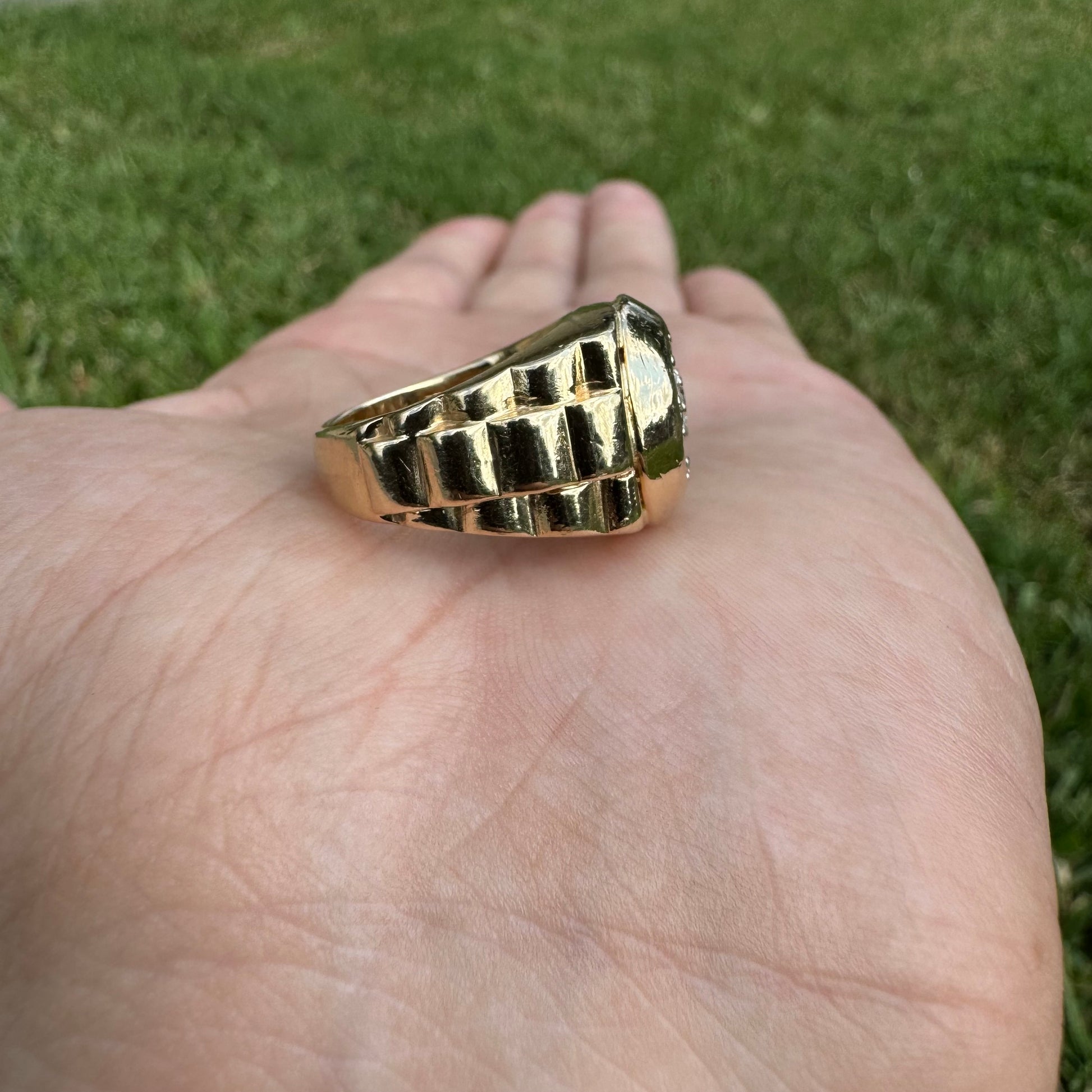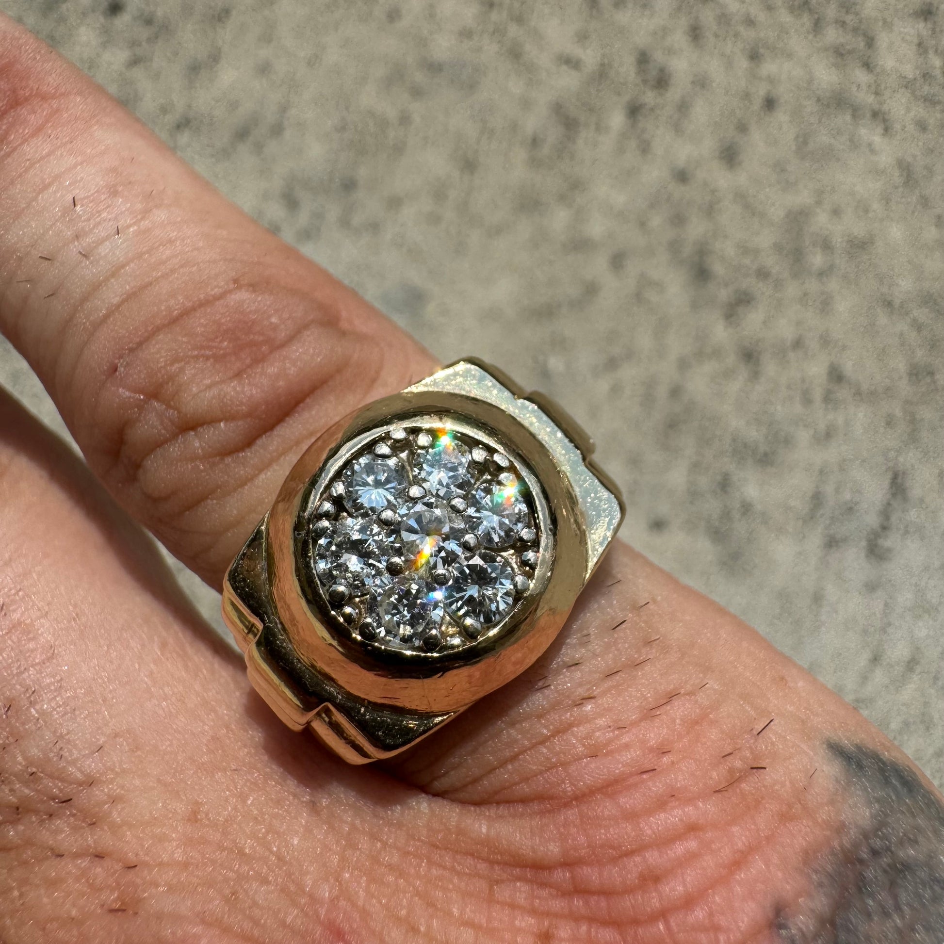 Consisting of lucky number 7 VS-Si clarity natural diamonds totaling up to .75ctw with the main center stone measuring approximately .15ct and the other 6 surrounding stones at .10ct each. Set in a circular Kentucky cluster among a mirror polished 14k yellow gold chunky Rolex style ring crafted sometime around the 1970’s/80’s. Weighing in at a heavy 10.2g and a chunker at approximately 14mm by 20mm this one fits at about a size:6.5. These were extremely popular back in the day within the old school gambling community just like the good luck horseshoe rings were. If you look at a Rolex, the jubilee and oyster style bracelet and round watch face match up exactly with the same characteristics of this ring so a lot of Rolex owners wear this ring to match with their watch as well.