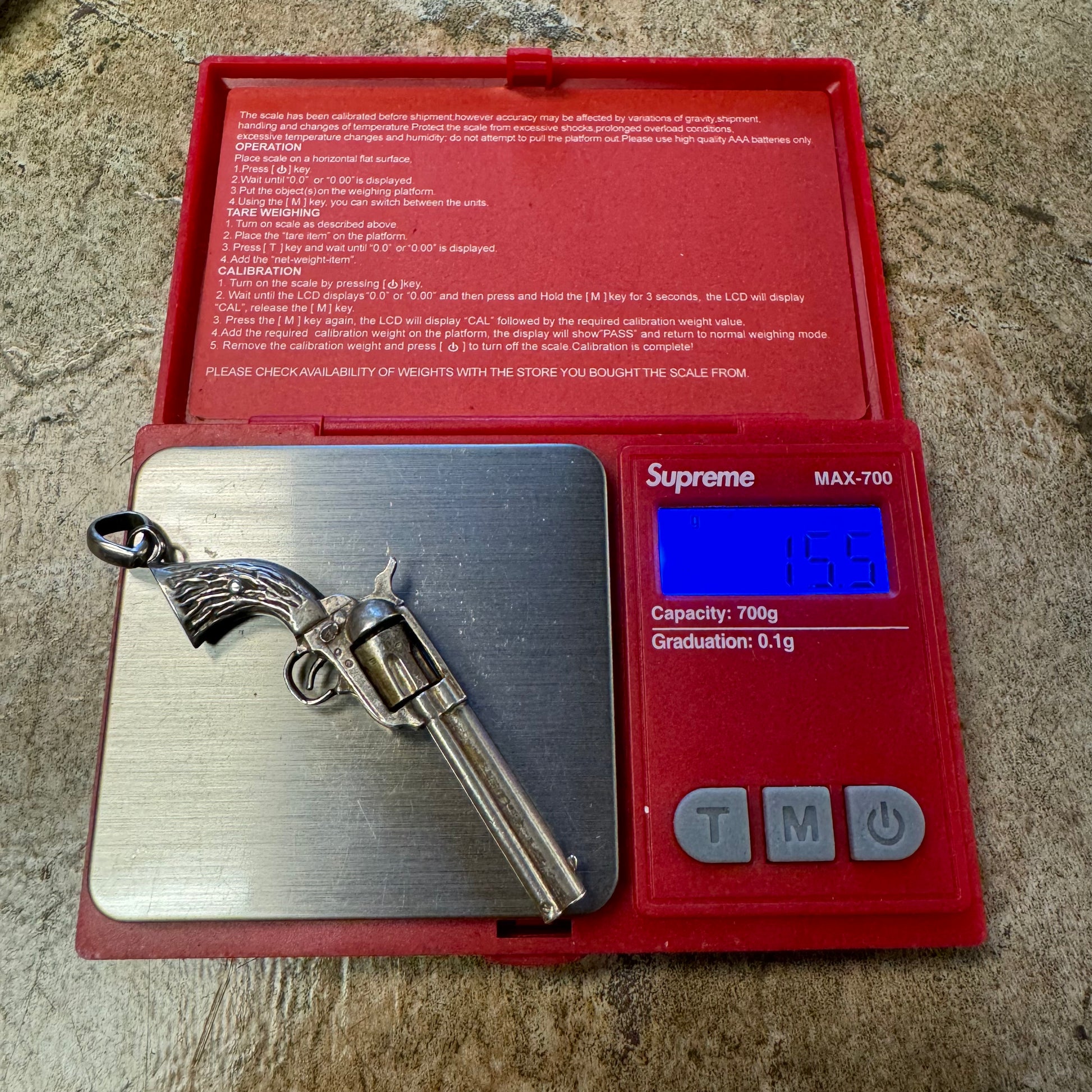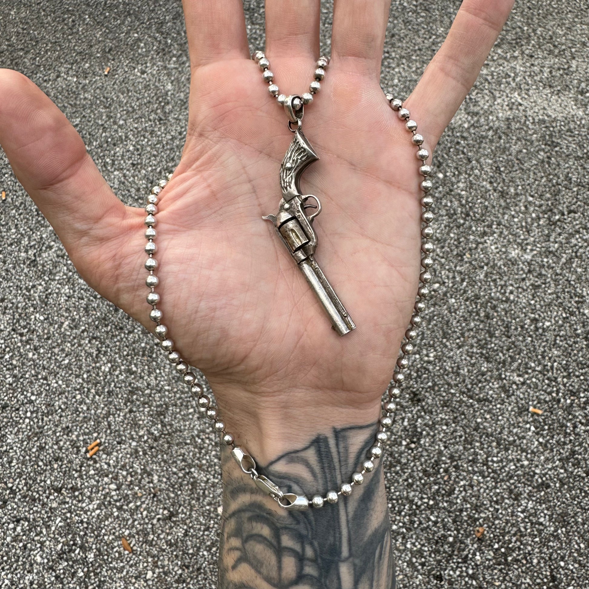 Very interesting back story to this piece is the man that made this was a lawyer out of Ocala,Fl. He made 4 of these sometime in the 1970’s-80’s before he died in 1986. After he made the 4 he crushed the mold so they could never be made again and out of those 4 I was lucky enough to get 2 (one of them sold) so this is the only one left. It’s hand made out of solid sterling silver approximately 3” x 1.5” including the bail and weighing about 16g. The barrel fully spins 360 degrees and the hammer cocks back. This is an exact to scale model of what appears to be an 1881 Colt frontier six shooter. *necklace shown not included*