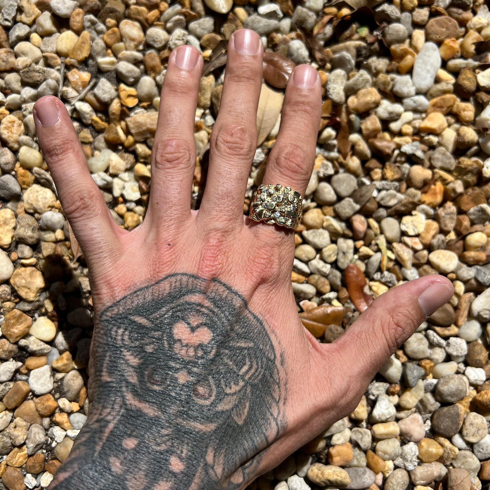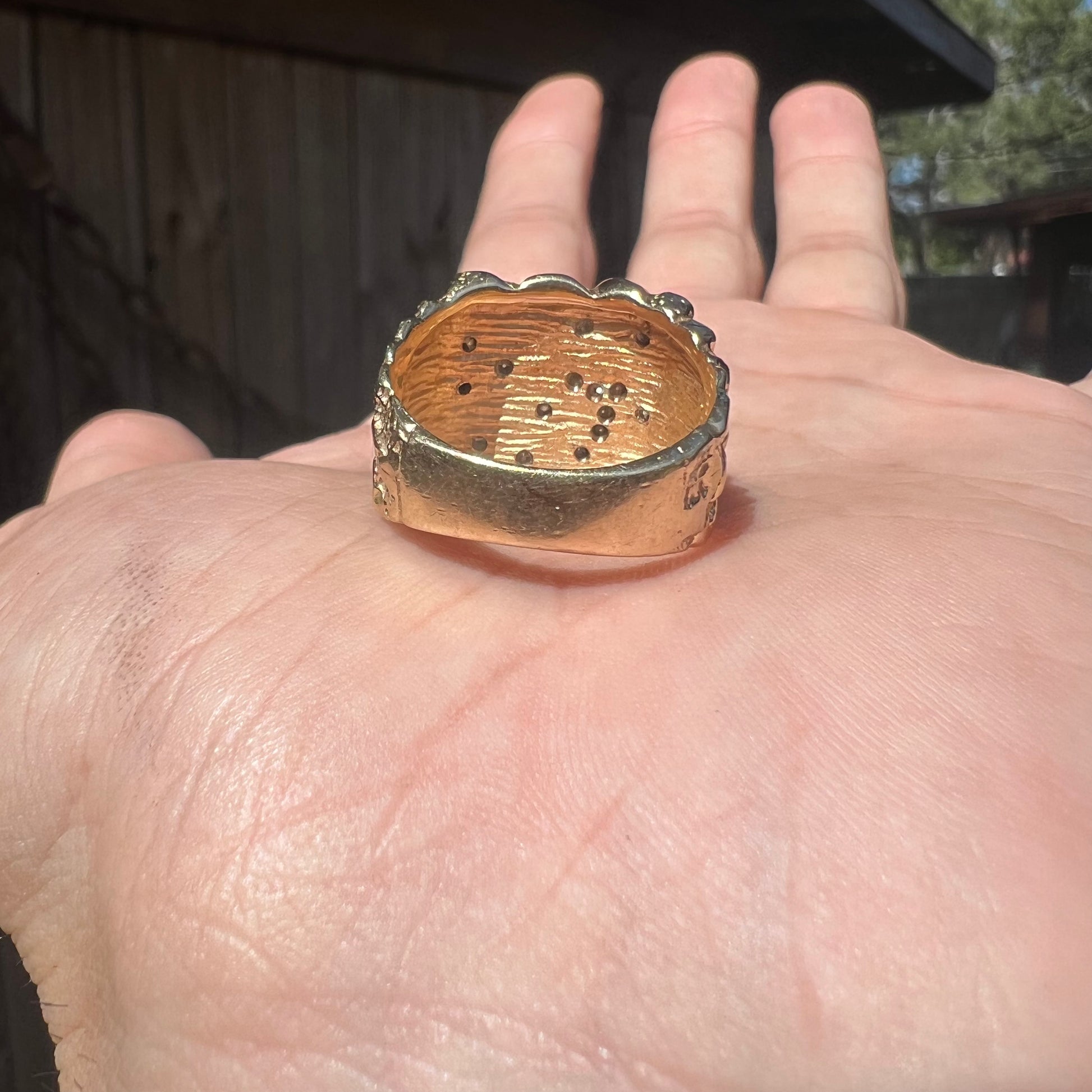 This one is special, it came from a lot I bought of a bunch of gold jewelry that belonged to an old time pool hustler from Texas. My imagination runs wild thinking of who this gentleman was and what he looked like but let your imagination guide you because I’m sure it was an appearance straight out of the movies from what was explained to me. The ring was custom made in the 1970’s out of solid 14k yellow gold. Flooded with 14 very clean near VS quality with great color natural diamonds totaling approximately .75CTW. The Nugget ring is a size:10 but fits a bit on the snug side if you look at the picture of it on the mandrel with a heavy weight of 12.41g