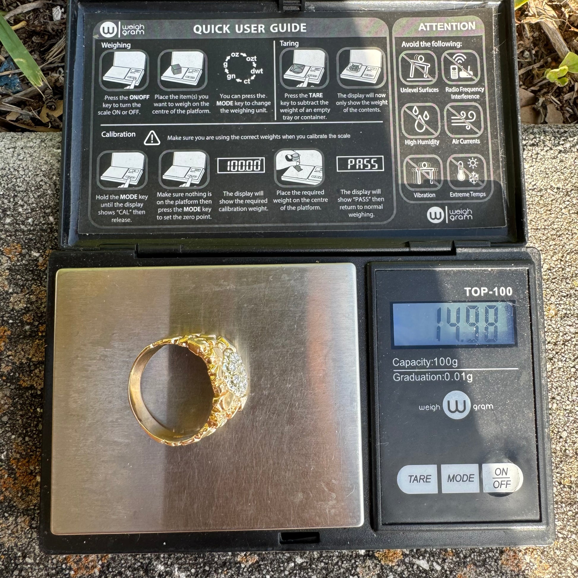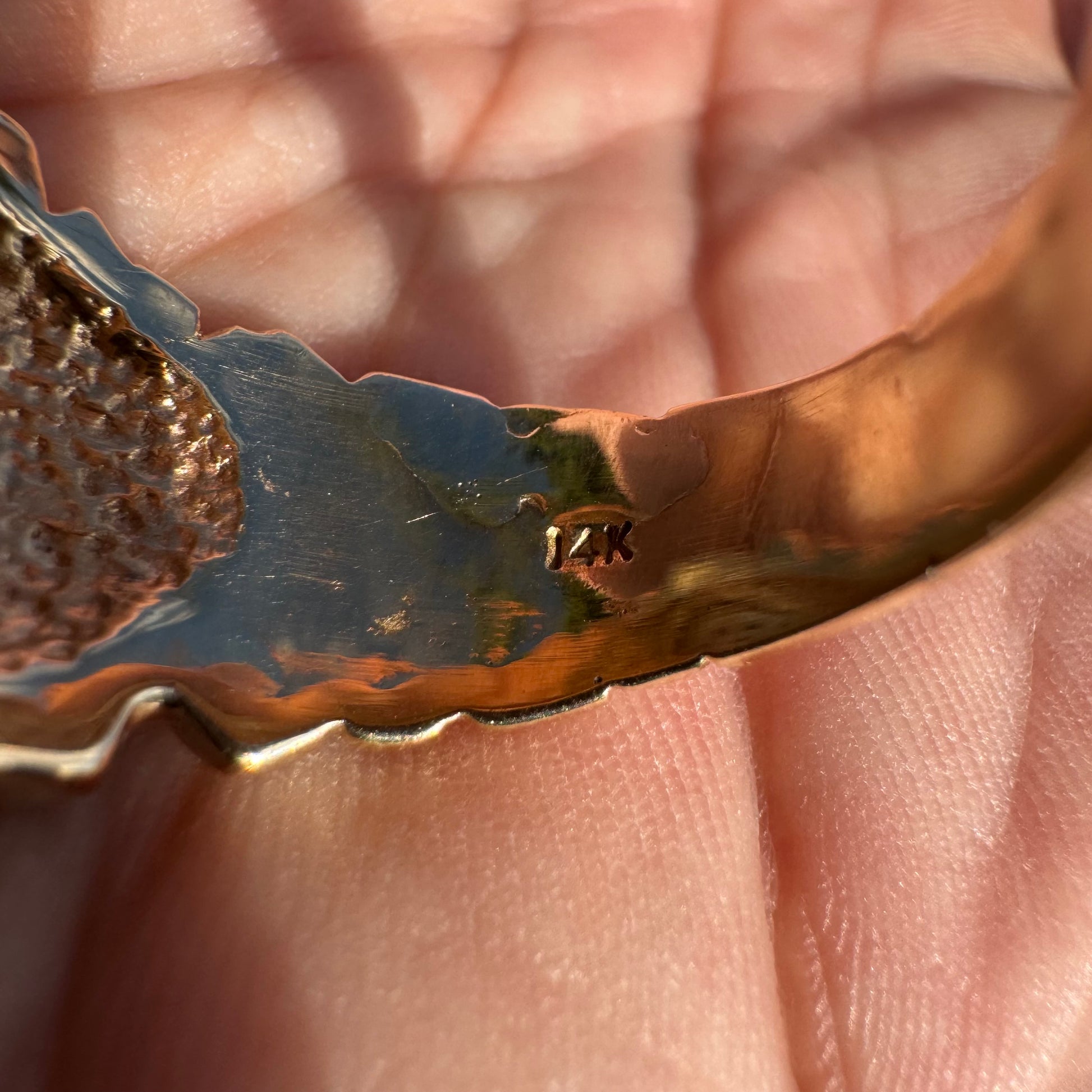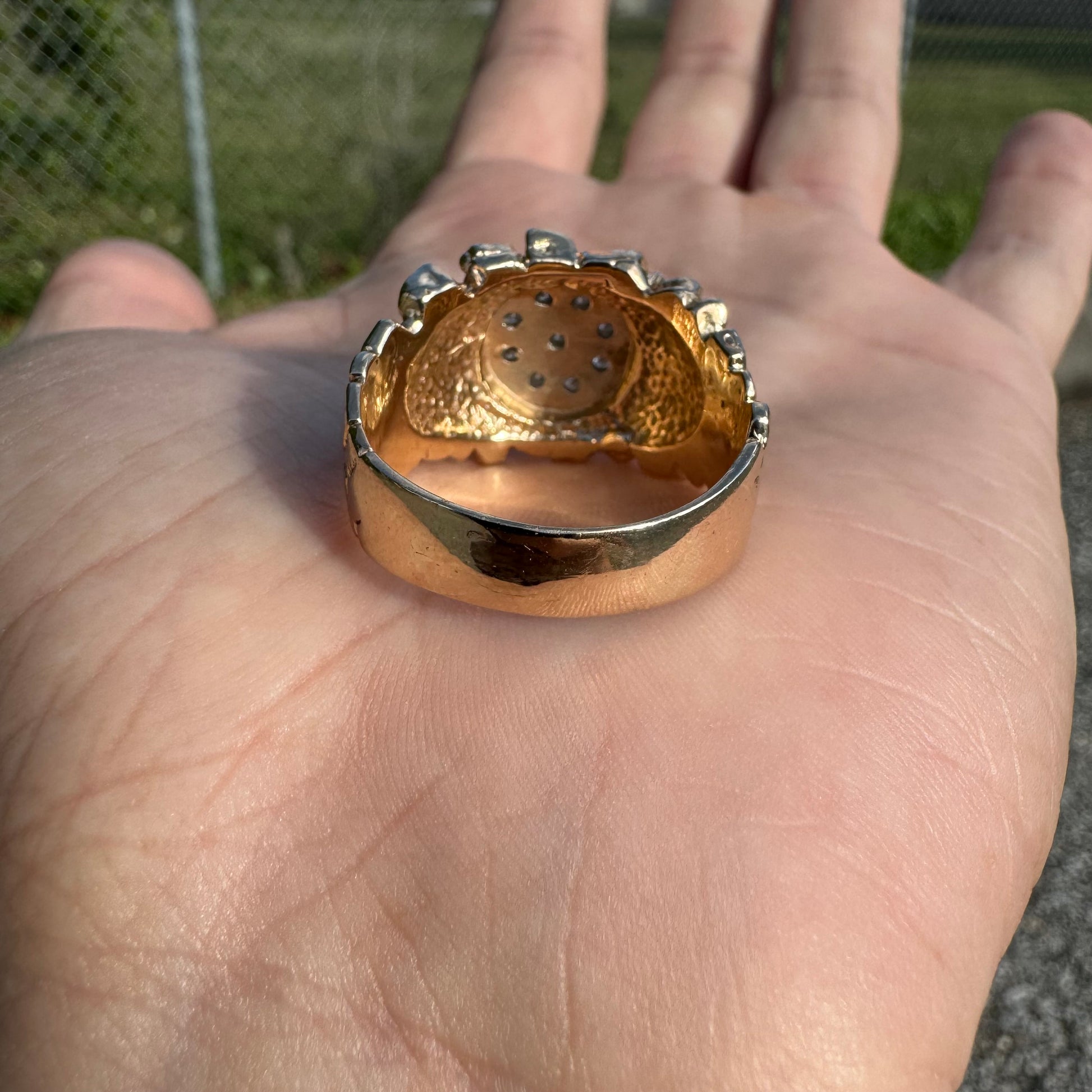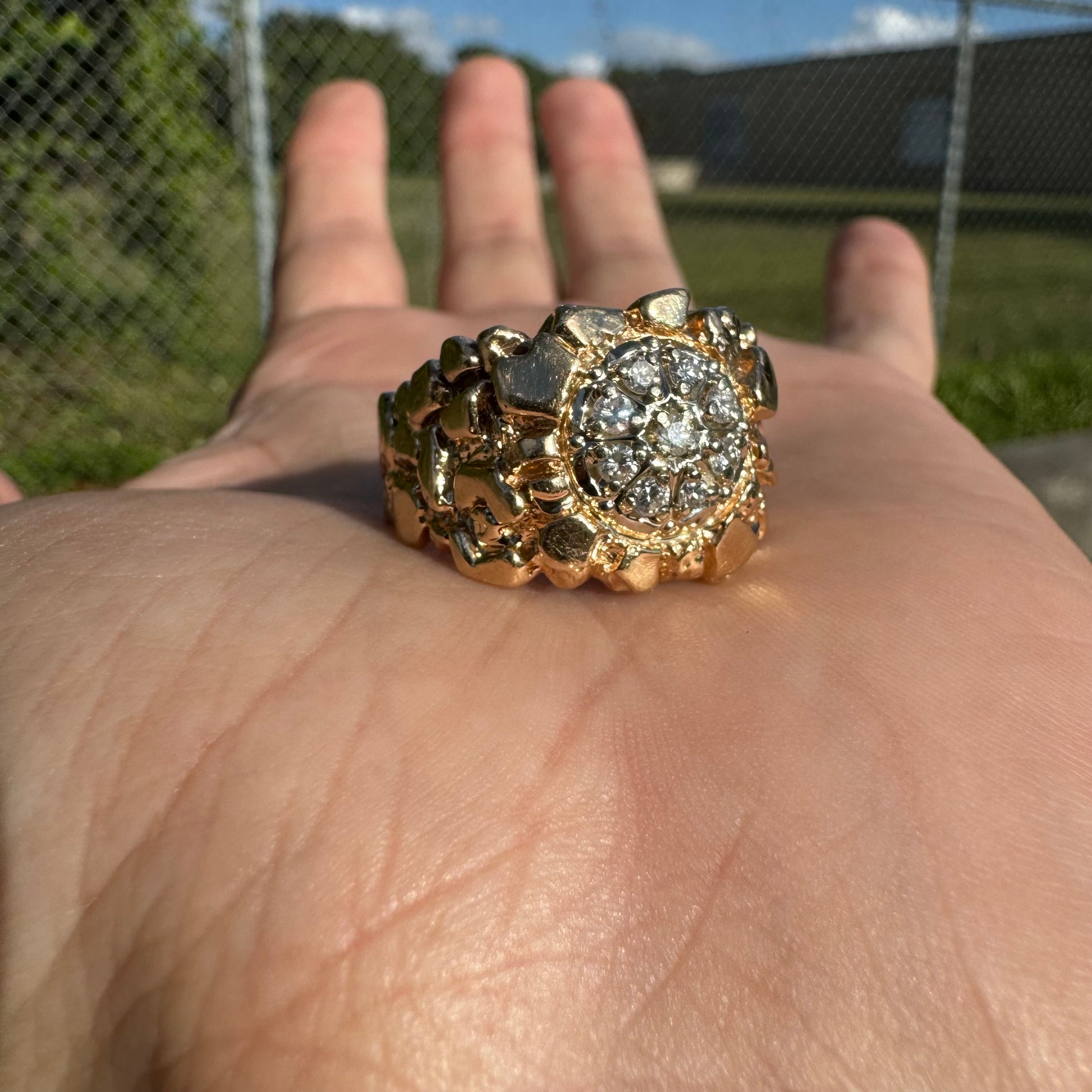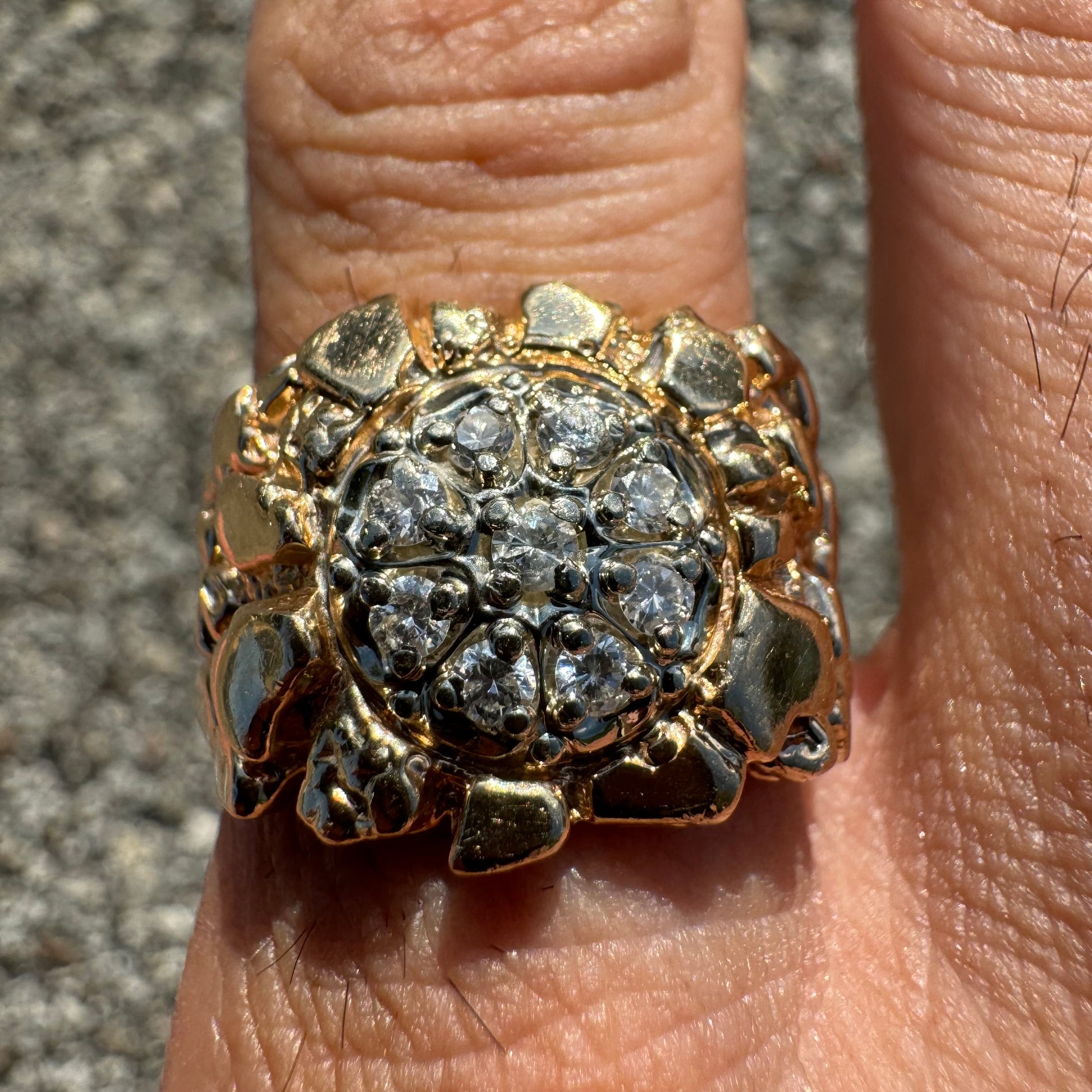 Big, Bad, & Bold this circa 1970’s solid 14k yellow gold nugget ring is a true beast. With 9 damn near perfect VS quality natural clean and clear diamonds totaling approximately .50ctw strongly prong set in the center forming that old school “Kentucky cluster” the top part of the ring swallows up a big part of your knuckle at a whopping 17mm wide. A heavyweight setting at just under 15g and a size:12.75 this is meant for some bigger fingers but can be sized up or down with no problem if need be. If you’re wanting a showstopper that packs a punch this is it.