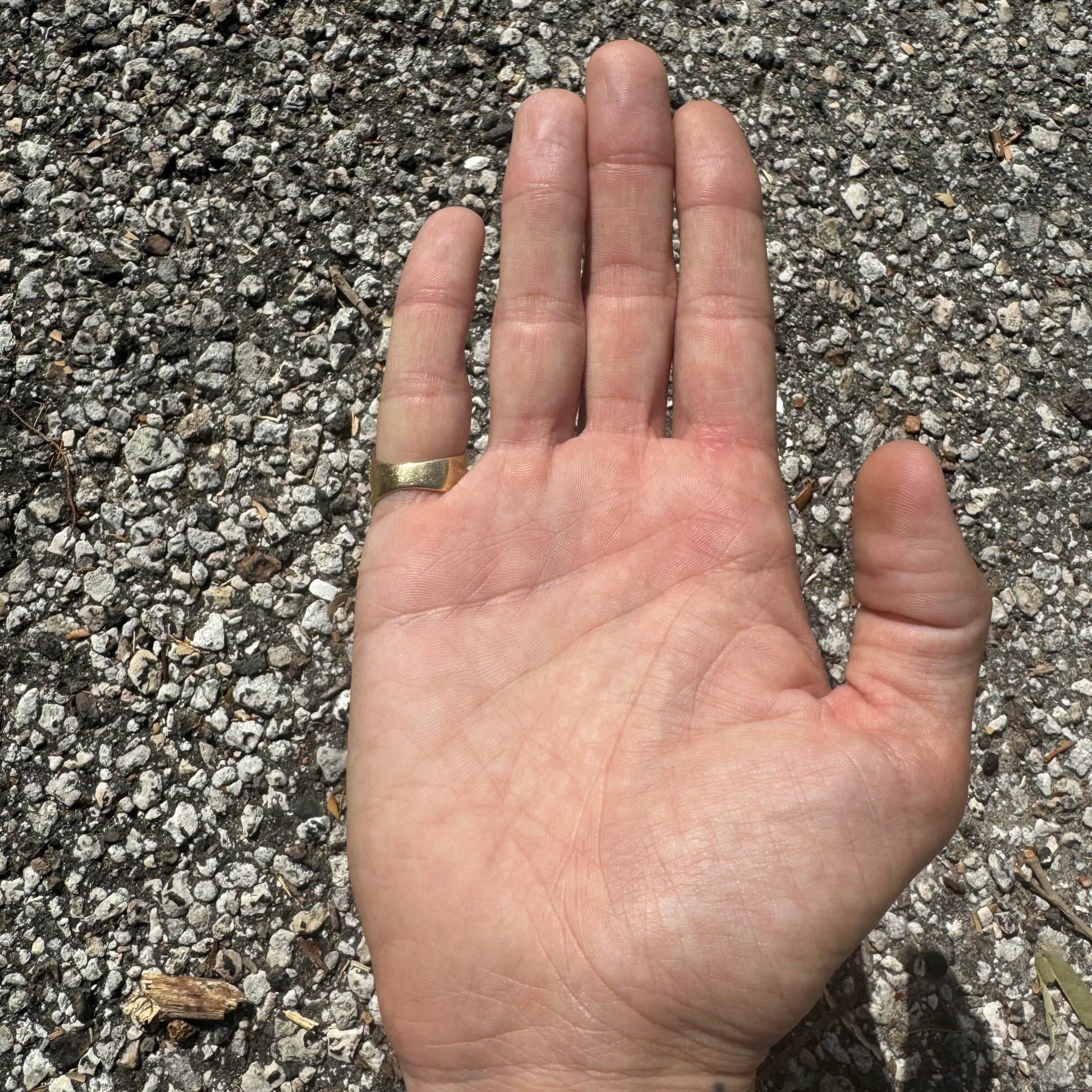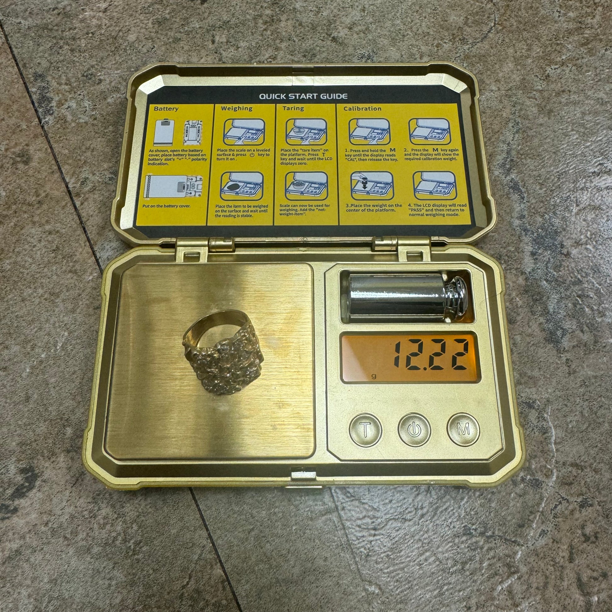 By far one of the nastiest and most rugged looking brutalist Nugget ring I’ve ever had, despite how cozy and comfortable it feels cushioned onto the finger. Taking up the full first part of the knuckle at 22MM x 20mm with a low profile yet thick stature at 12.22g and a size:6.25. Encrusted with approximately .80ctw of natural diamonds each in size from .15ct down to about .03ct this ring looks as if the diamonds had formed into the ring like a natural part of earths process over millions of years as they were all flush set by hand. Crafted out of a solid 14k buttery yellow gold the back underside is all solid backed adding to that cozy and comfortable feel. This ring meets all the criteria at an excellent price point.