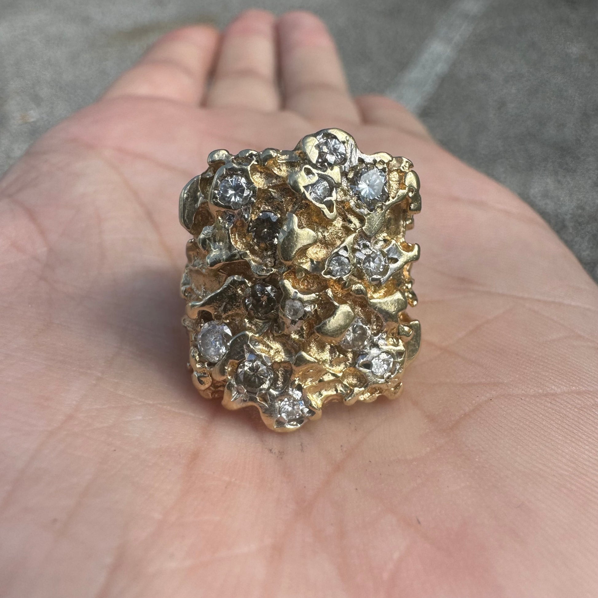 1970’s Solid 14k Yellow Gold .80ctw Natural Diamond Encrusted Brutalist Nugget Ring (6.25)