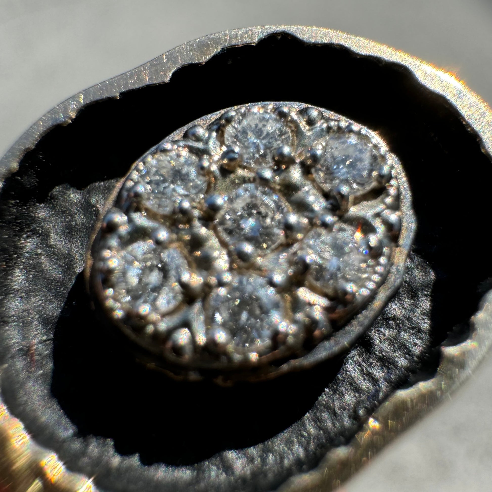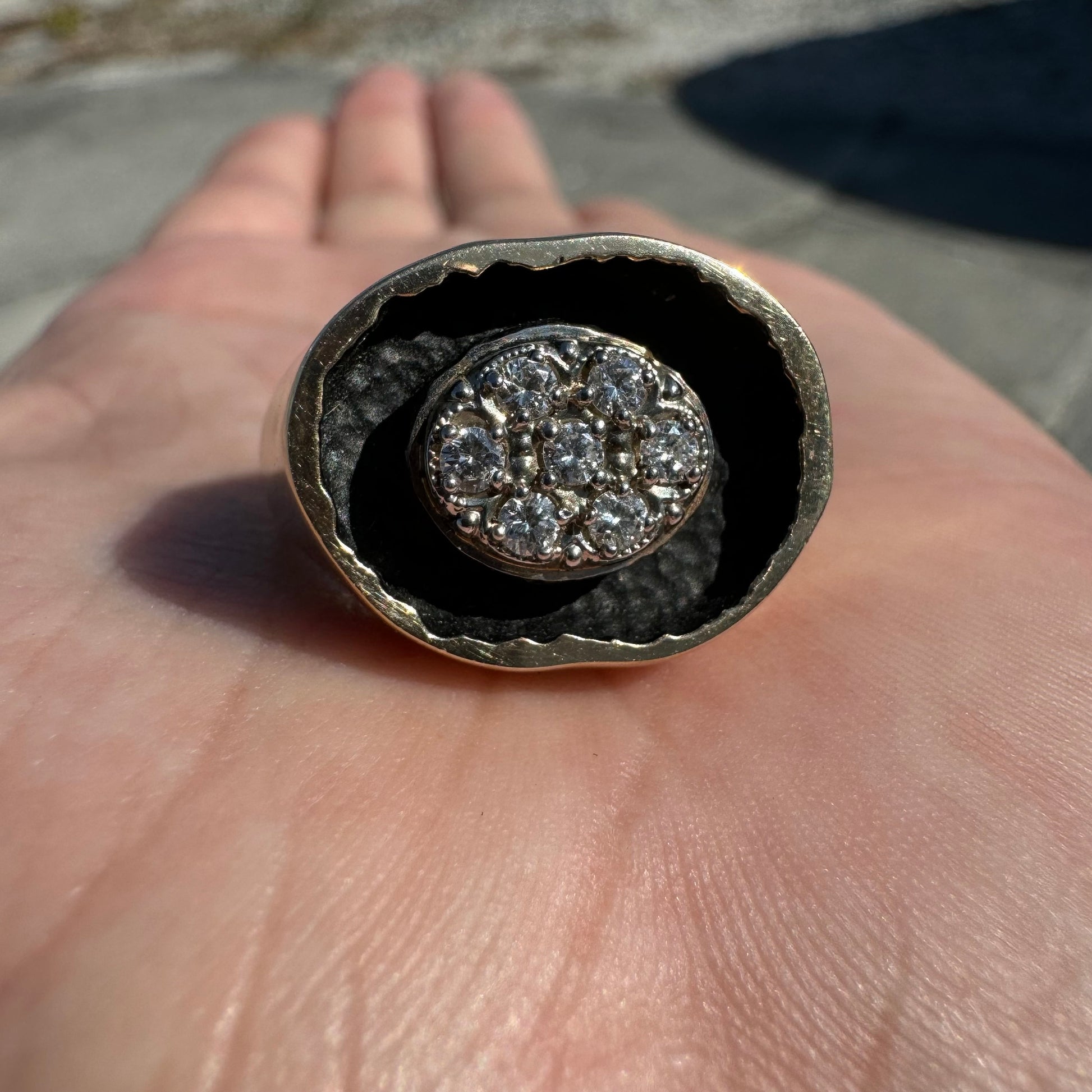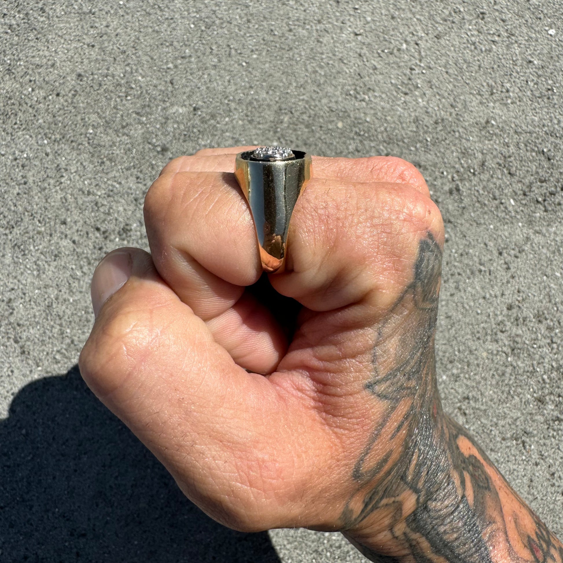 When 2 of my favorite styles of ring combine and form into one; brutalism features and Kentucky cluster set diamonds. Set smack dab in the middle of a matte blacked finish shadow box setting with contrasted pointed edge cut outs is 7 good luck clean natural diamonds approximately .05ct each totaling up to .35ctw. A heavyweight and chunky vibrant 14k yellow gold mirror finish handcrafted in and around the 1970’s the ring takes up a prominent part on the lower knuckle and is extremely cozy and comfortable to wear at a size:10 it measures approximately 16mm x 20mm and weighs in at a heavy and solid 12.66g. A piece from the past you don’t see style like this anymore and those who wore a ring like this back in the day were definitely a bad ass personality type with a bit of an edge yet added style.