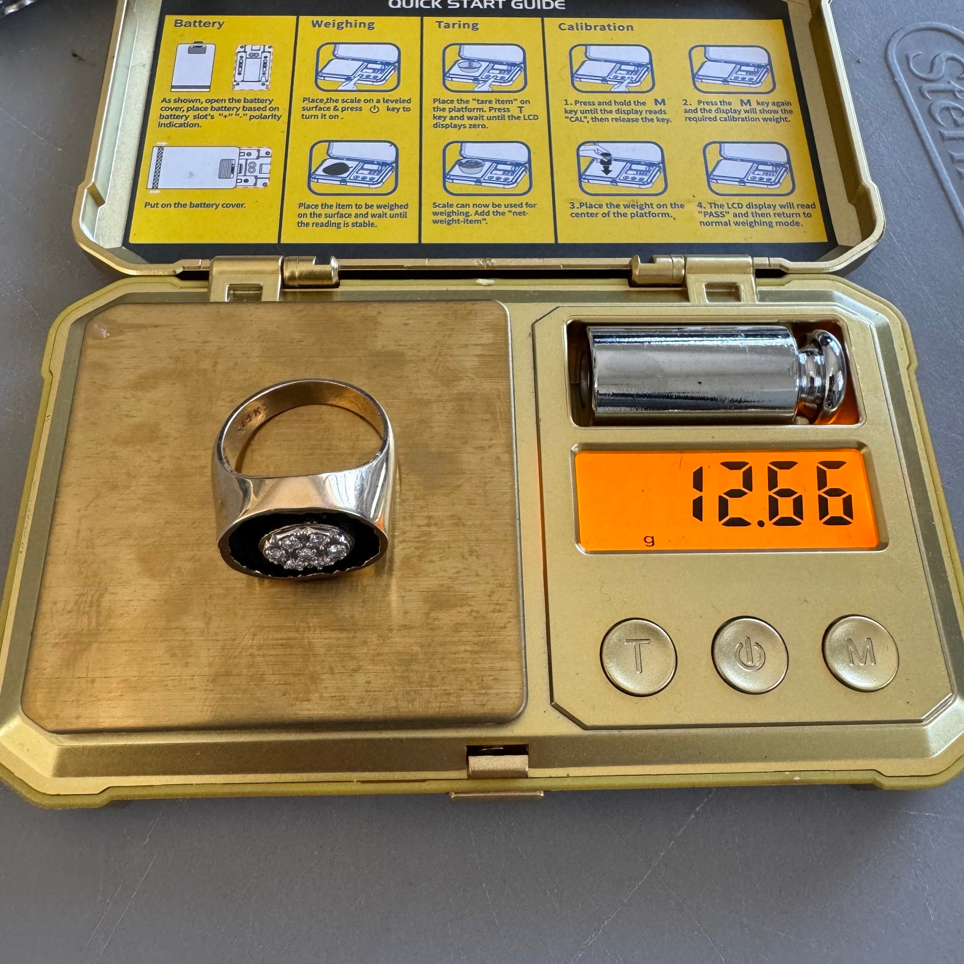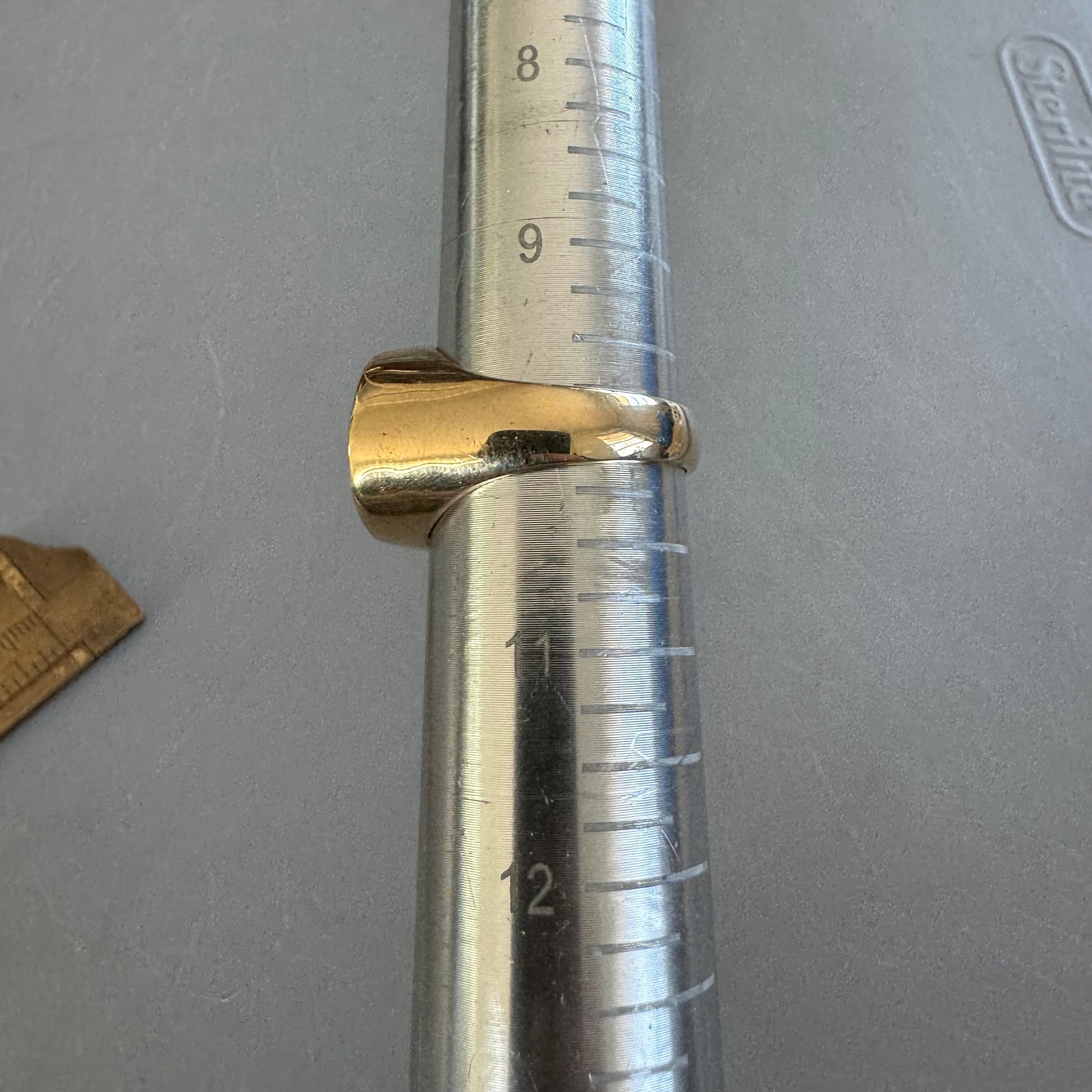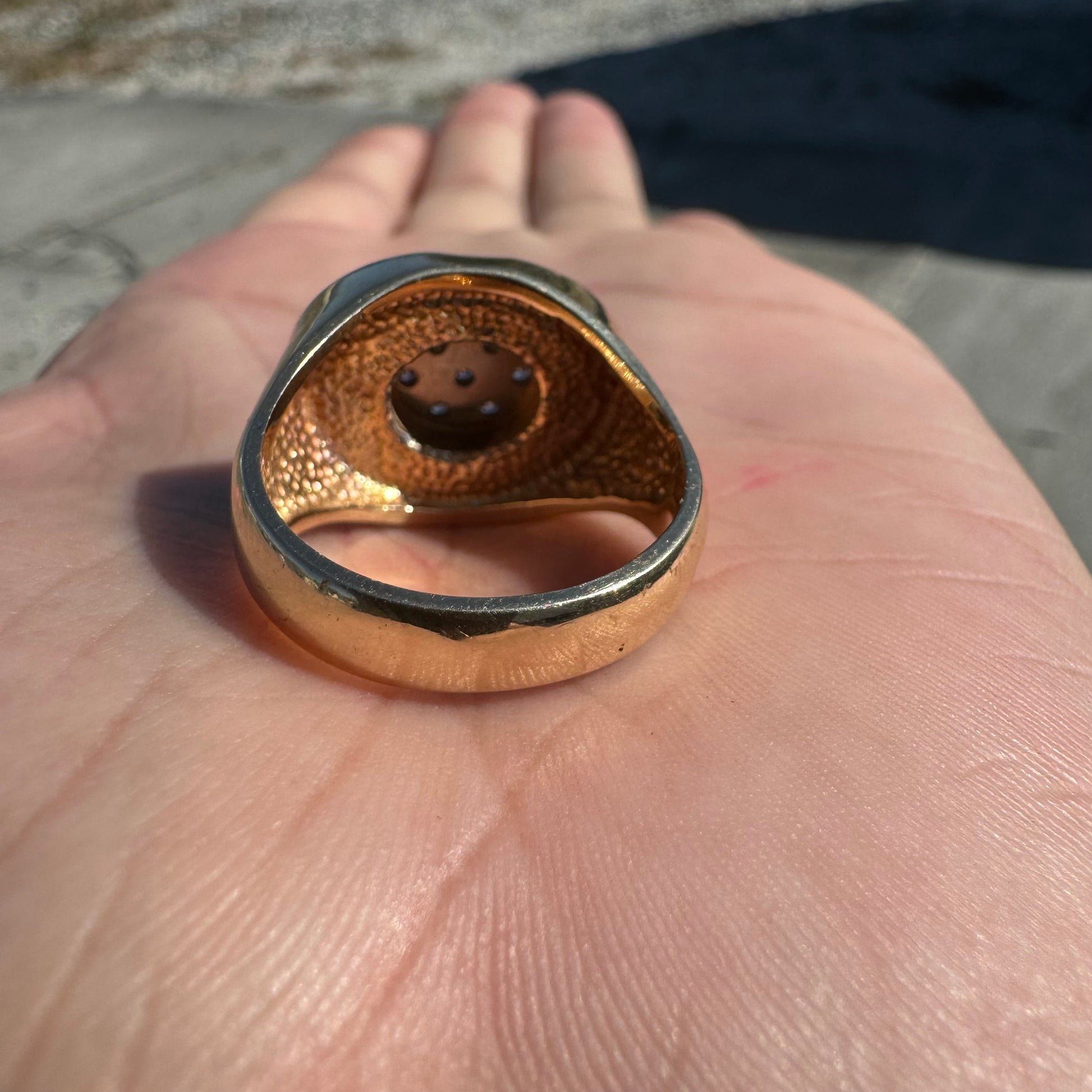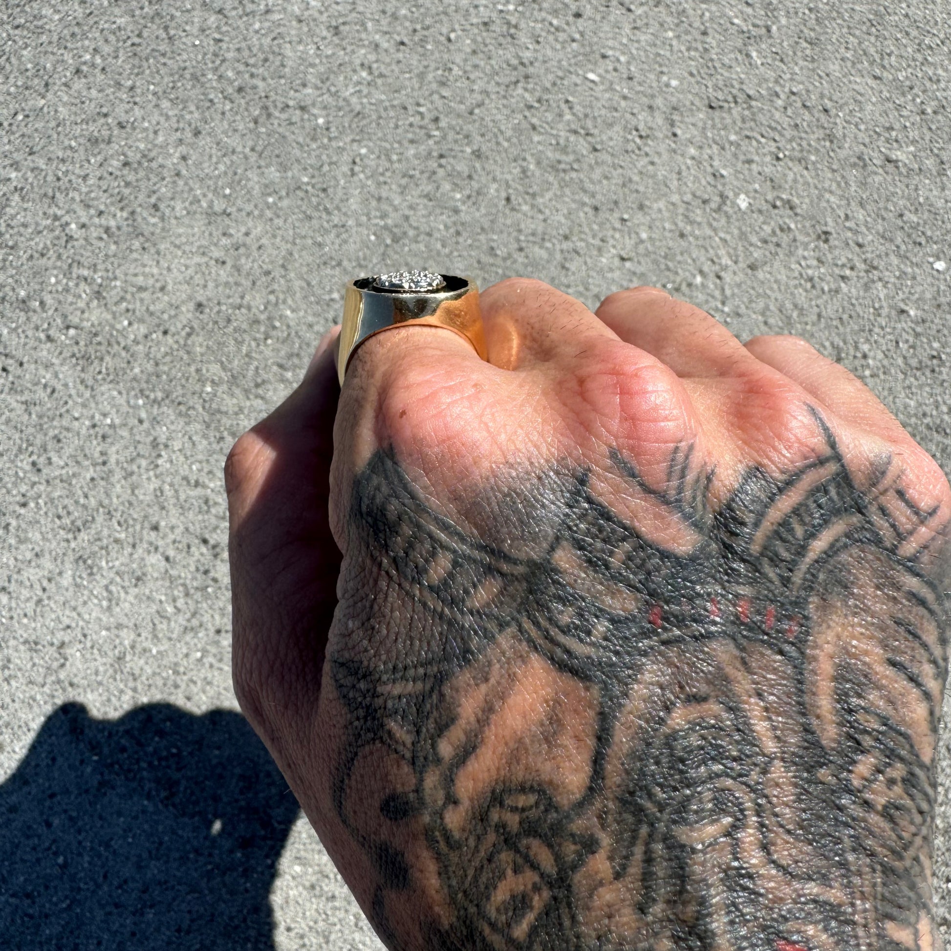When 2 of my favorite styles of ring combine and form into one; brutalism features and Kentucky cluster set diamonds. Set smack dab in the middle of a matte blacked finish shadow box setting with contrasted pointed edge cut outs is 7 good luck clean natural diamonds approximately .05ct each totaling up to .35ctw. A heavyweight and chunky vibrant 14k yellow gold mirror finish handcrafted in and around the 1970’s the ring takes up a prominent part on the lower knuckle and is extremely cozy and comfortable to wear at a size:10 it measures approximately 16mm x 20mm and weighs in at a heavy and solid 12.66g. A piece from the past you don’t see style like this anymore and those who wore a ring like this back in the day were definitely a bad ass personality type with a bit of an edge yet added style.
