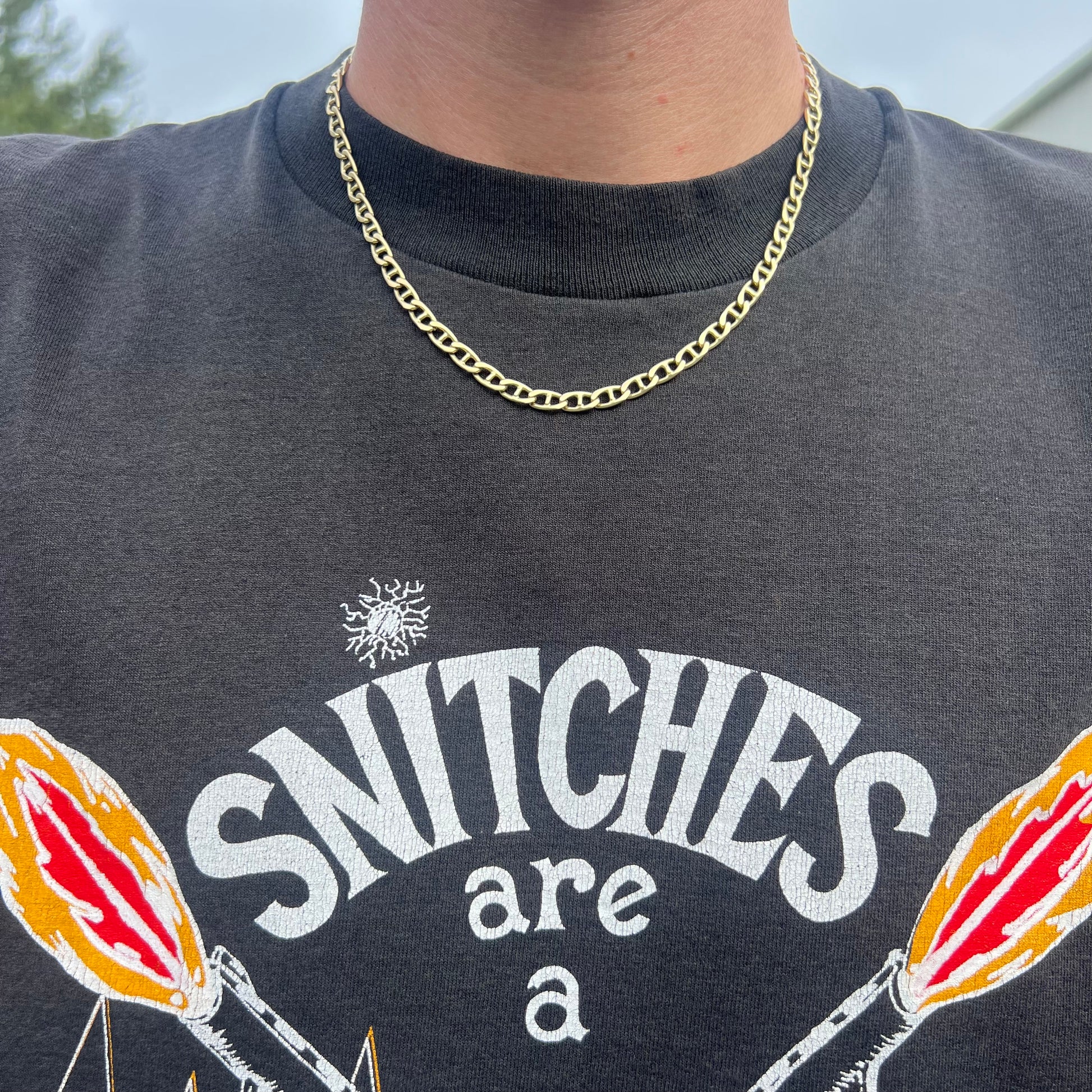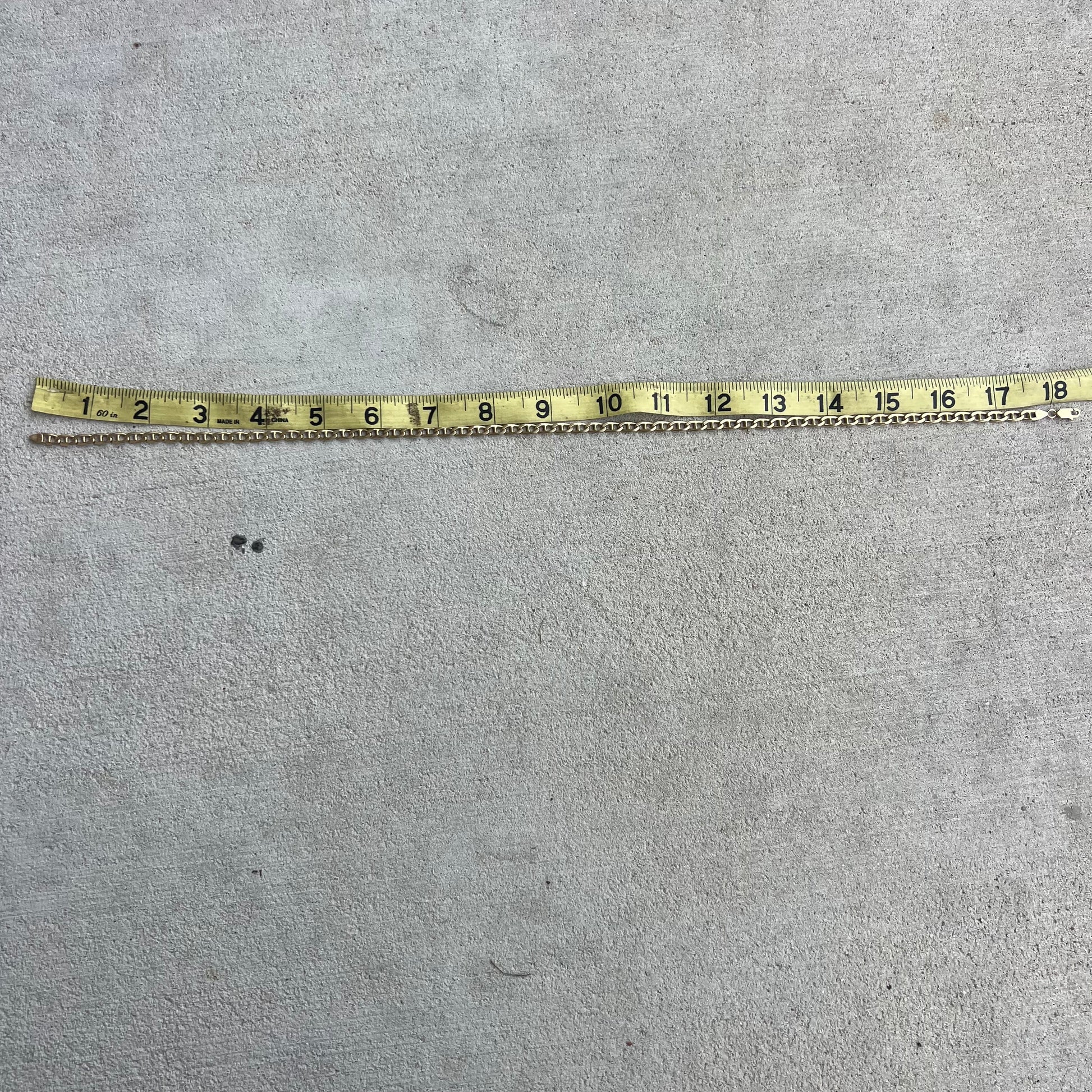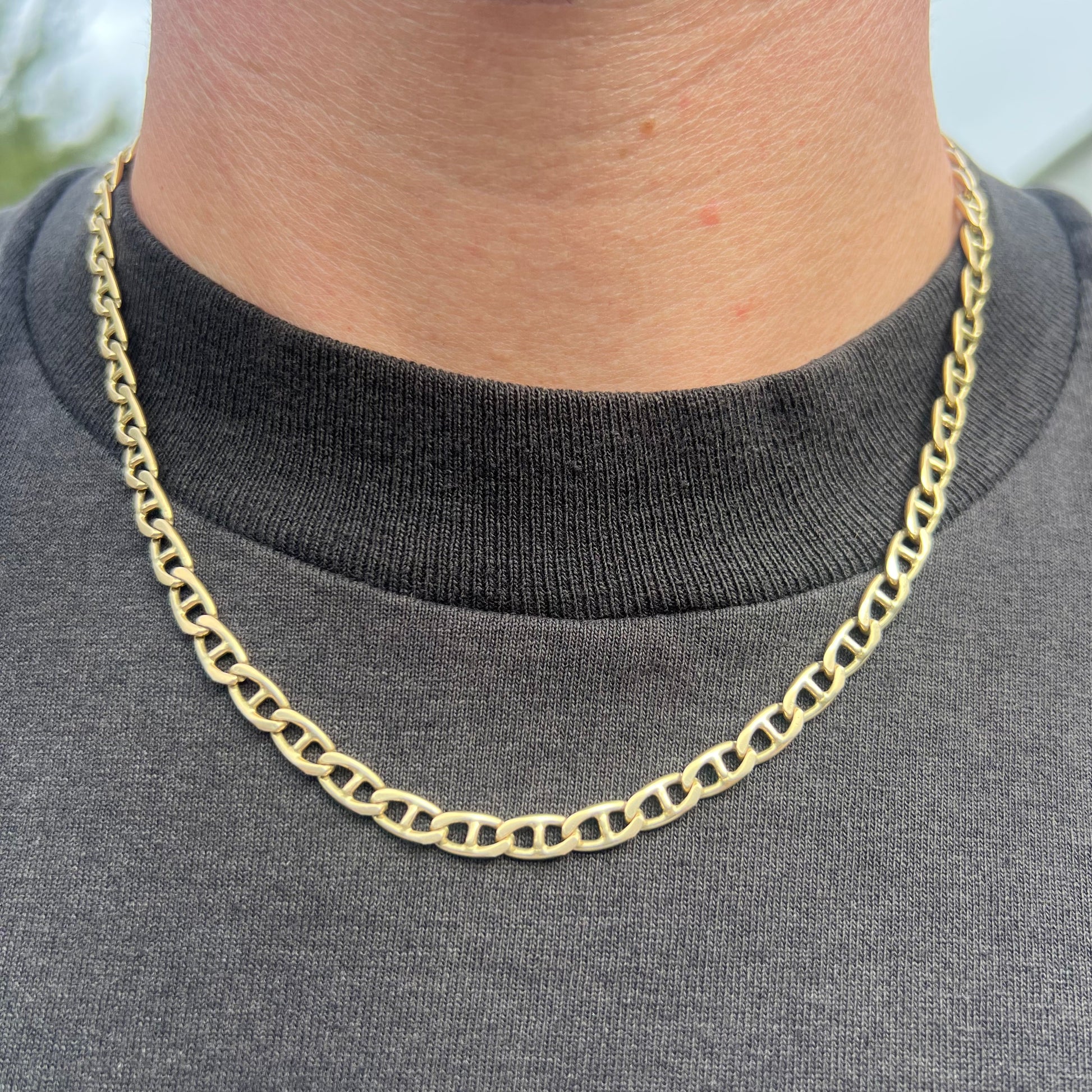 Have you ever looked at two different necklaces, both are stamped 14k gold, yet one is a lighter yellow while the other is a dark yellow? Your eyes aren’t playing tricks on you, they really do have the same content percentage of gold in them. The difference is the amount of other mixed metal content within the grouping whether it be silver, copper, nickel, iron, etc. To get a lighter look of the yellow more silver alloy is mixed, to get a rosier appearance more copper is mixed in, and so on. It all boils down to a personal preference of matching golds tones and this chain has a lighter yellow tone to it which many people prefer over a deeper gold appearance as it looks more “real”. As far as the different styles of mariner link this is the original style. Based on the mariner link chains used in shipyards to dock large boats. It measures 18.5” in length by 5MM wide and weighs a heavy 21g.