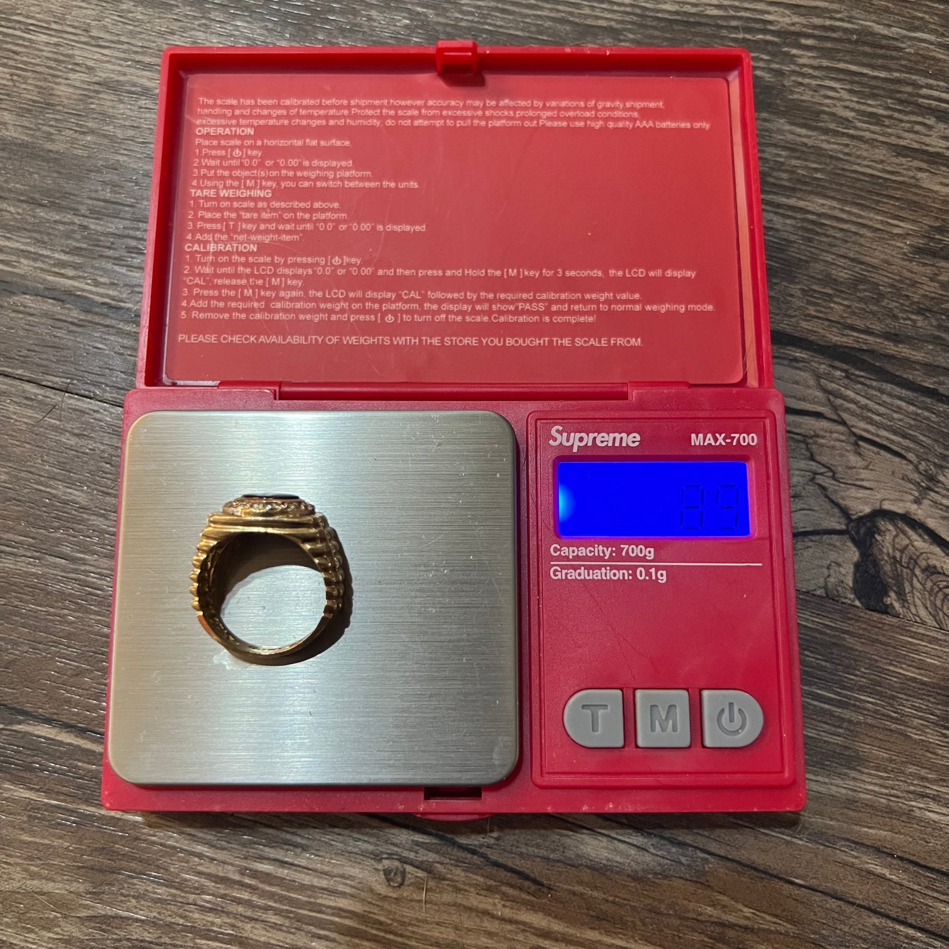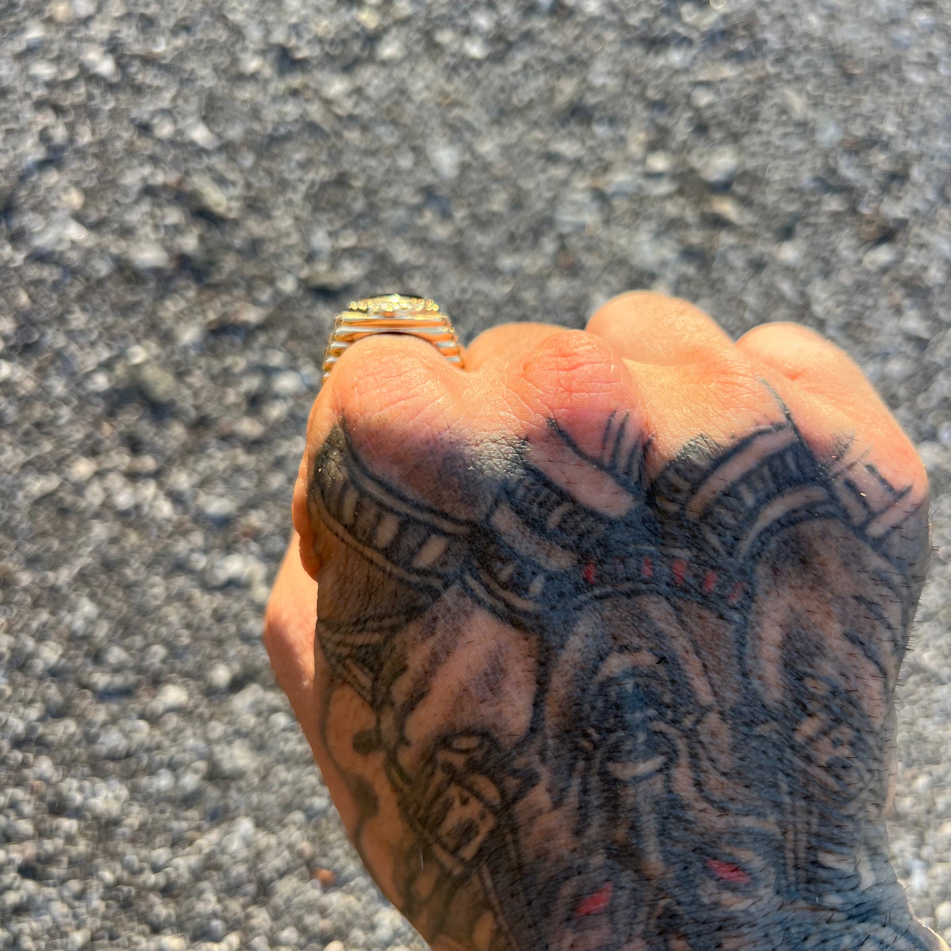 Consisting of one large solitaire black onyx stone in the center surrounded by a halo of 21 natural Diamonds (approximately .50ctw) set in a 14kt yellow gold Rolex style ring. Size:9 (9g)