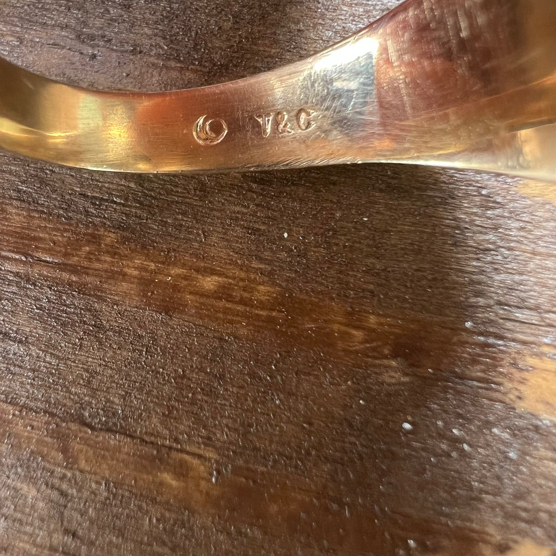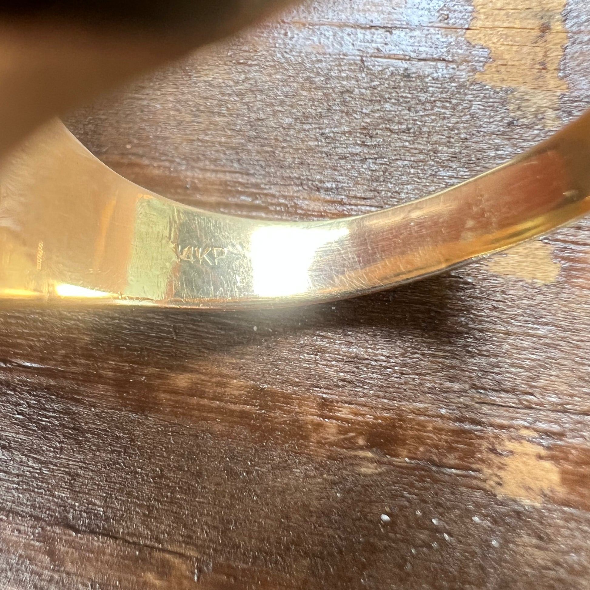 At first when you see the hallmarking of T & C you might think this is a Tiffany and Co. ring. This finely crafted 1980’s 14k plumb black onyx signet is actually Town and Country Jewelry Mfg. Co. A well know jewelry company that started out in Massachusetts in 1955. Made up of 5 natural .03ct diamonds totaling .15CTW and a comfort fit rounded shank. The yellow gold is high Yeild 14k “plumb” making it at 14.0 or higher. A very masculine and highly sought after look Size:11.5 and 8.5g