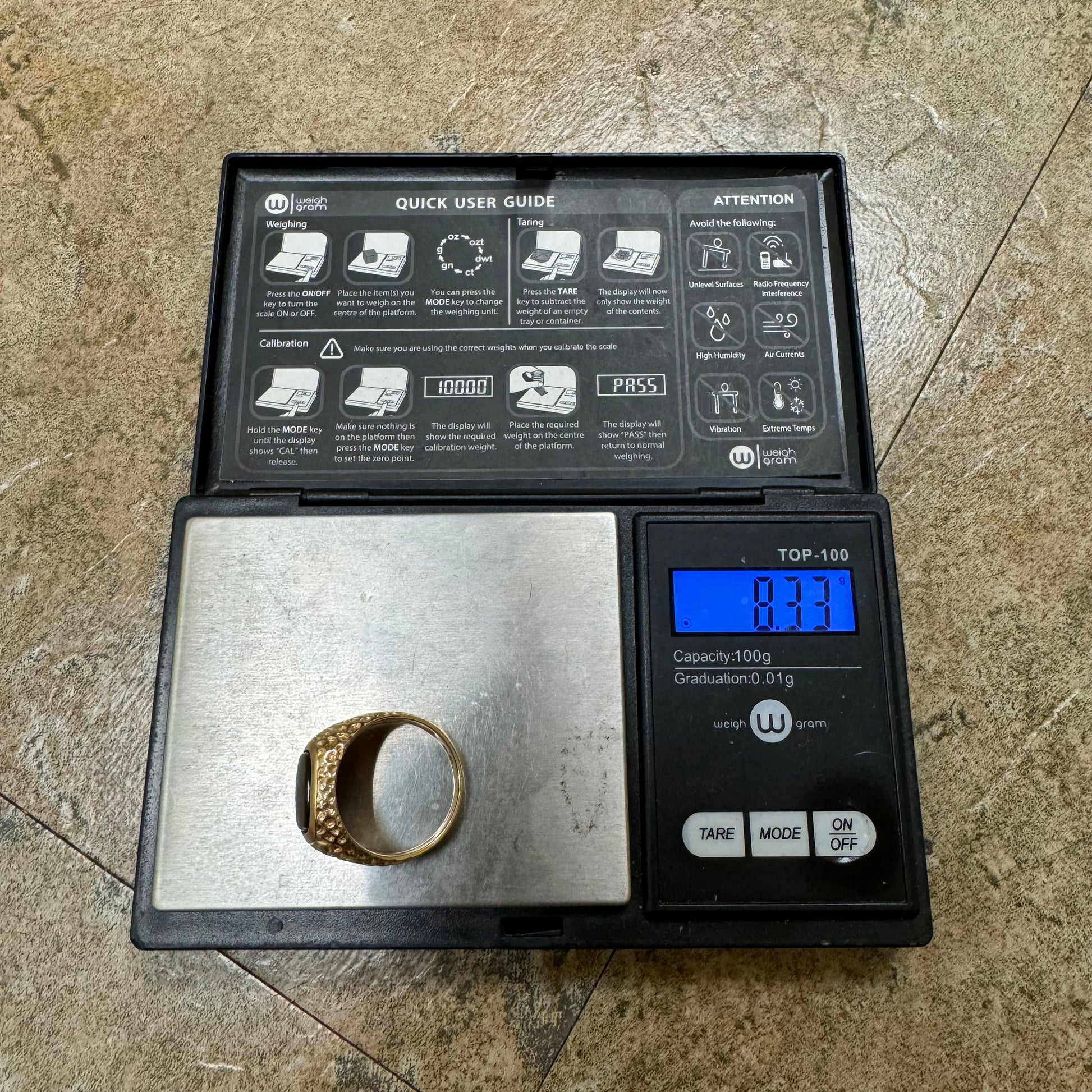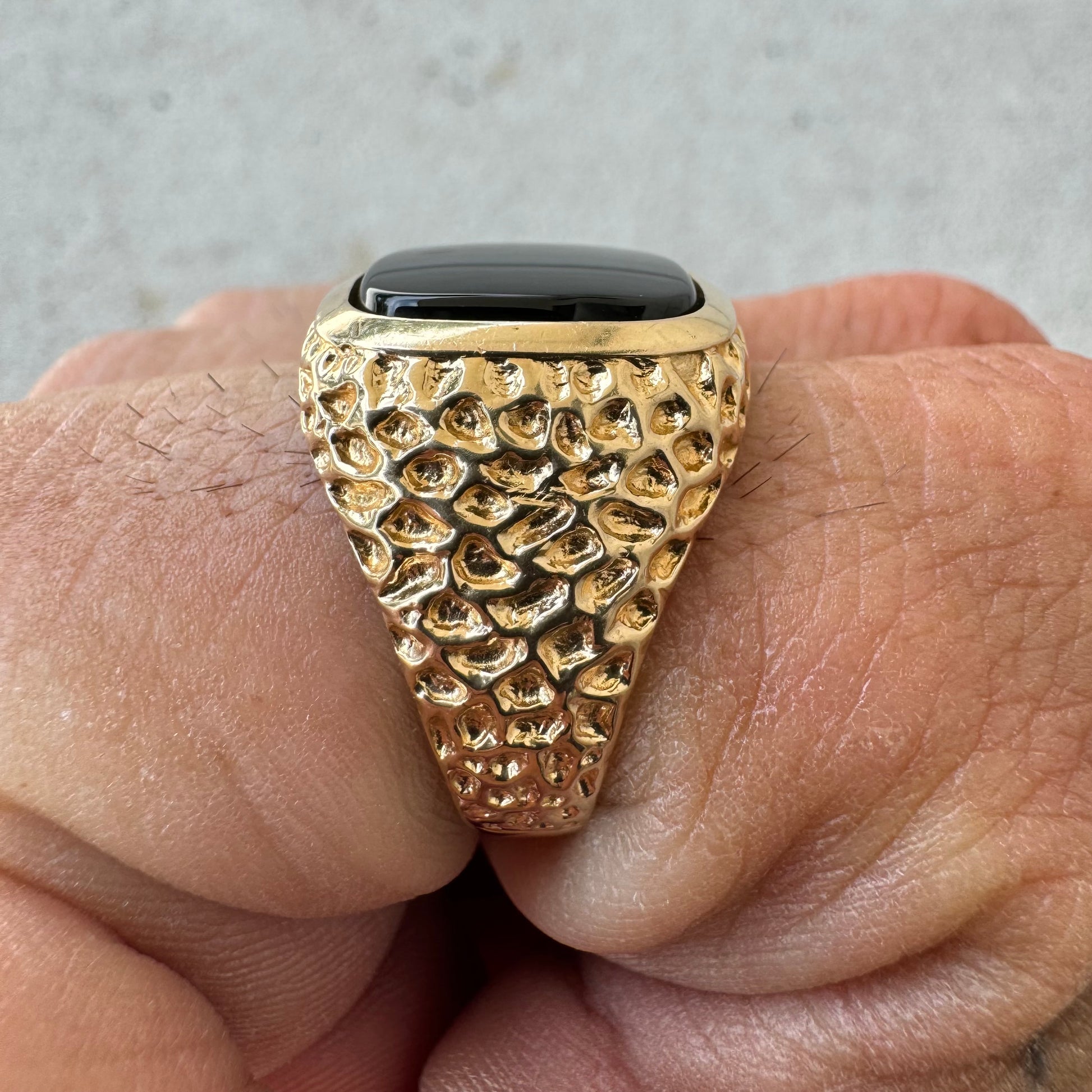 2 things I love to find in all rings and that’s black onyx and nugget pieces, This covers both aspects. Strongly set and super clean and slick black onyx stone in 14k yellow gold nugget style signet ring. Size:10.5 and weighing 8.33g this has that bad ass rough look with added class.