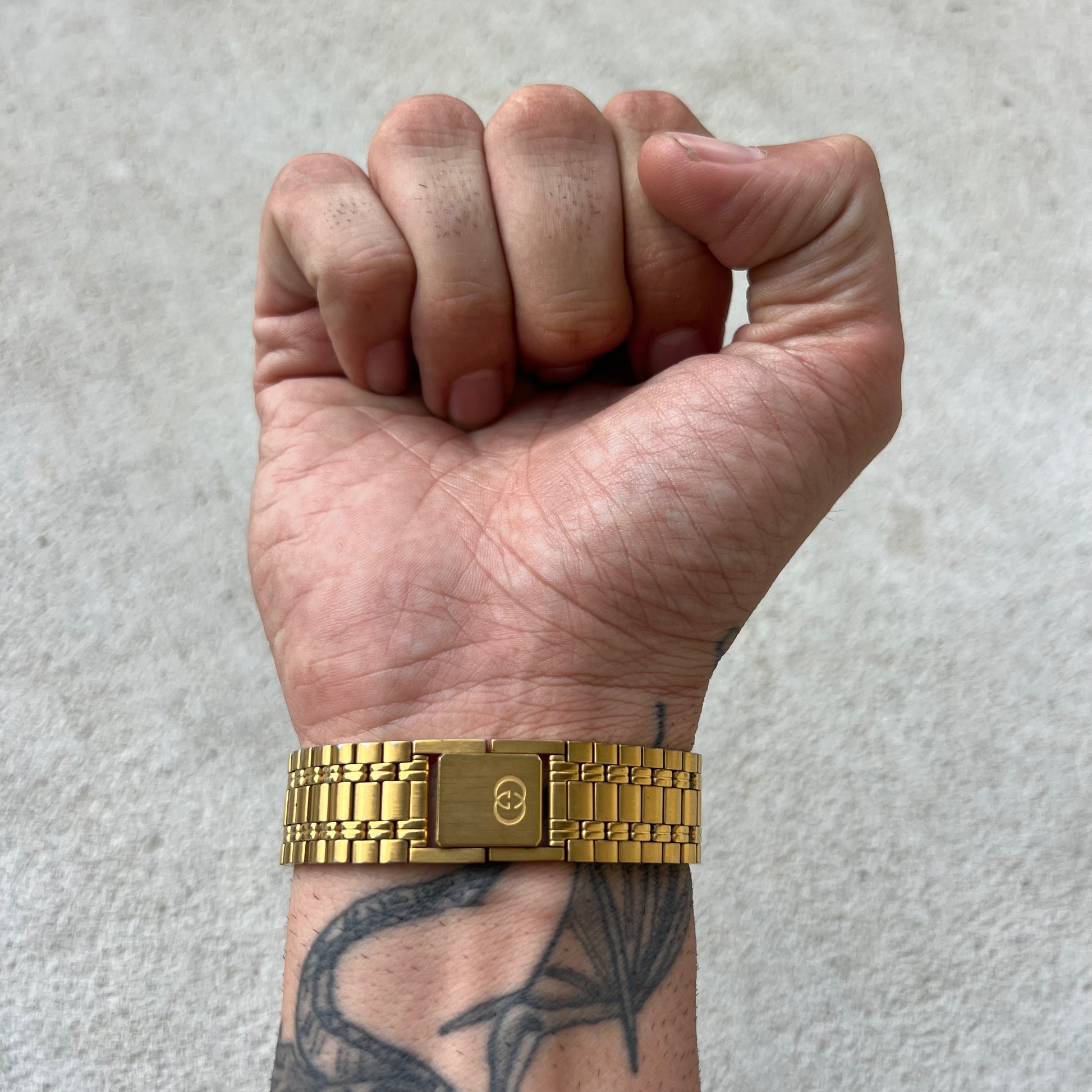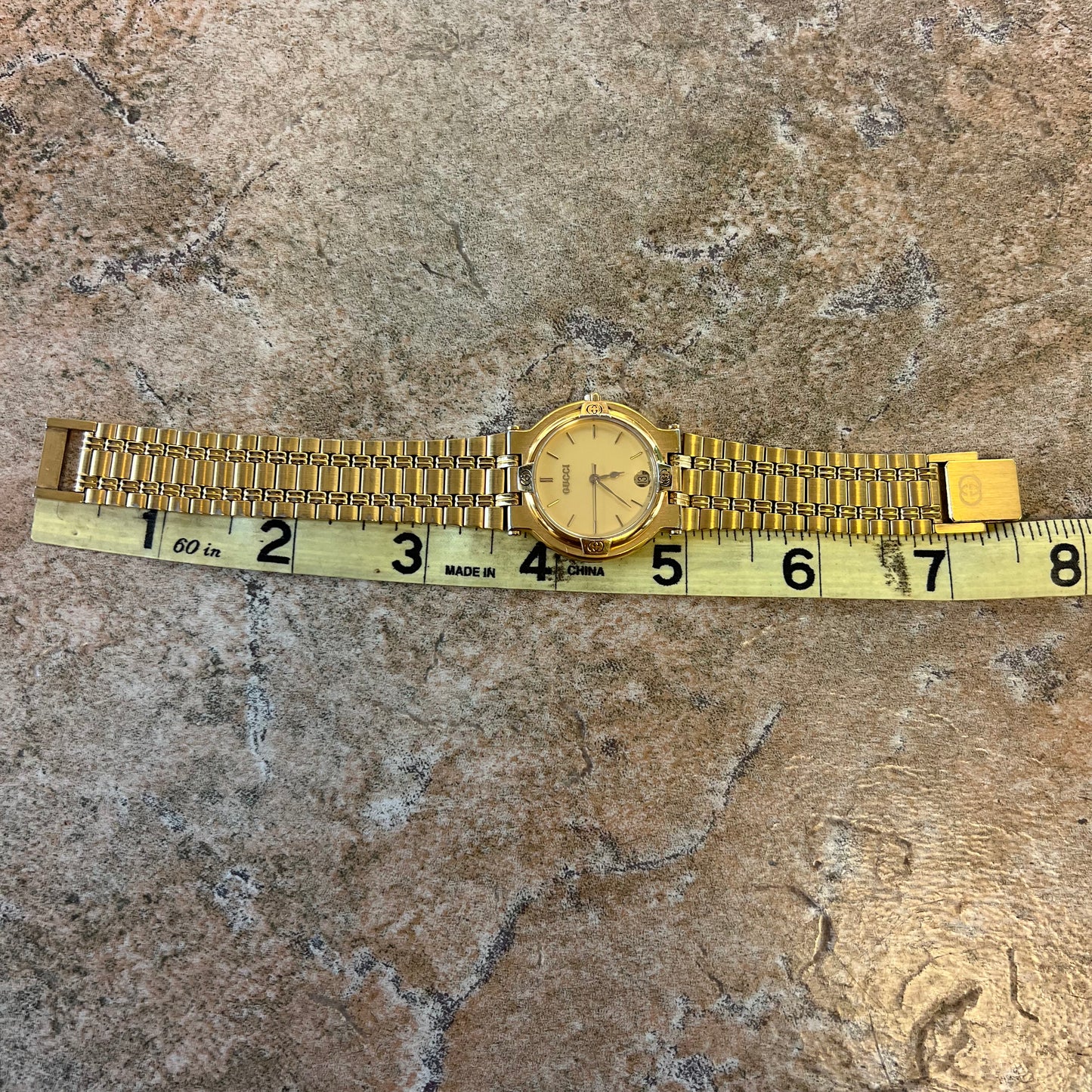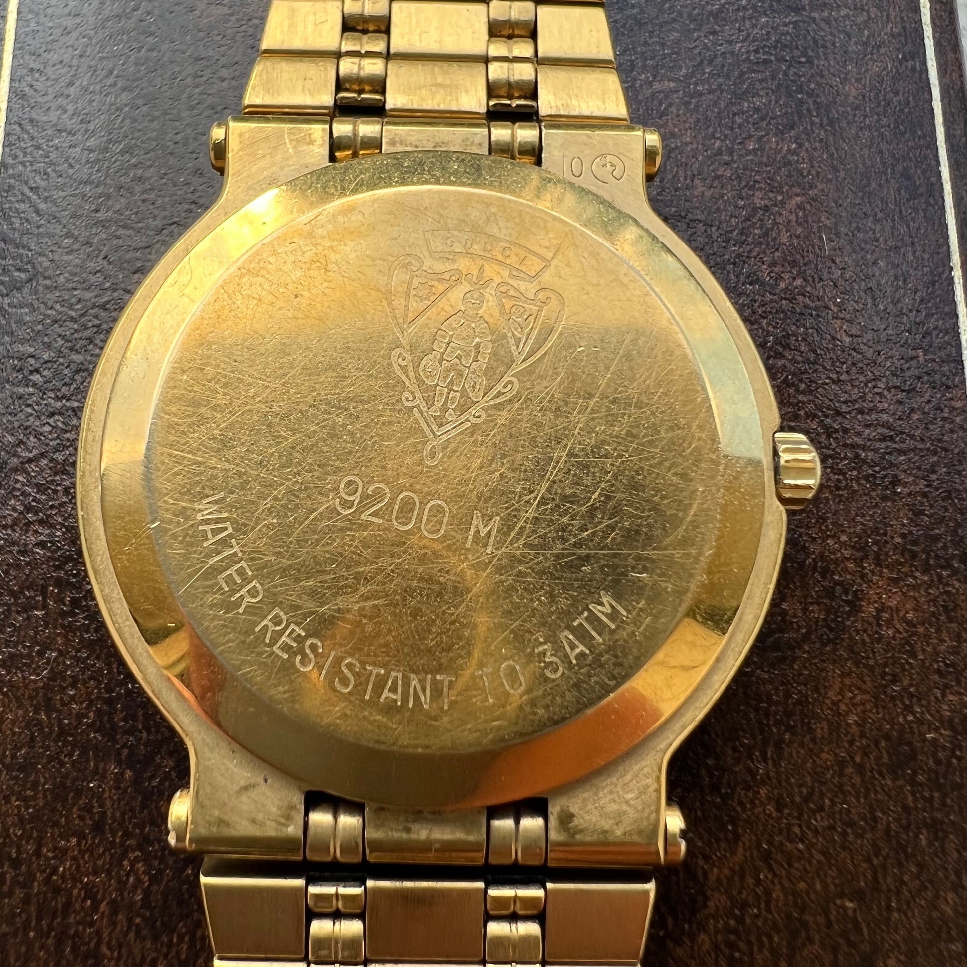 In great condition is this sleek looking all gold Gucci 9200m wrist watch from the 1980’s still with its original box. No scratches or scuffs on the glass crystal or face some very minor wear on one left side of the band where some of the gold tone has slightly rubbed. These are one of my hottest sellers. Measures 7.5” in length but links can be removed for smaller size wrists.