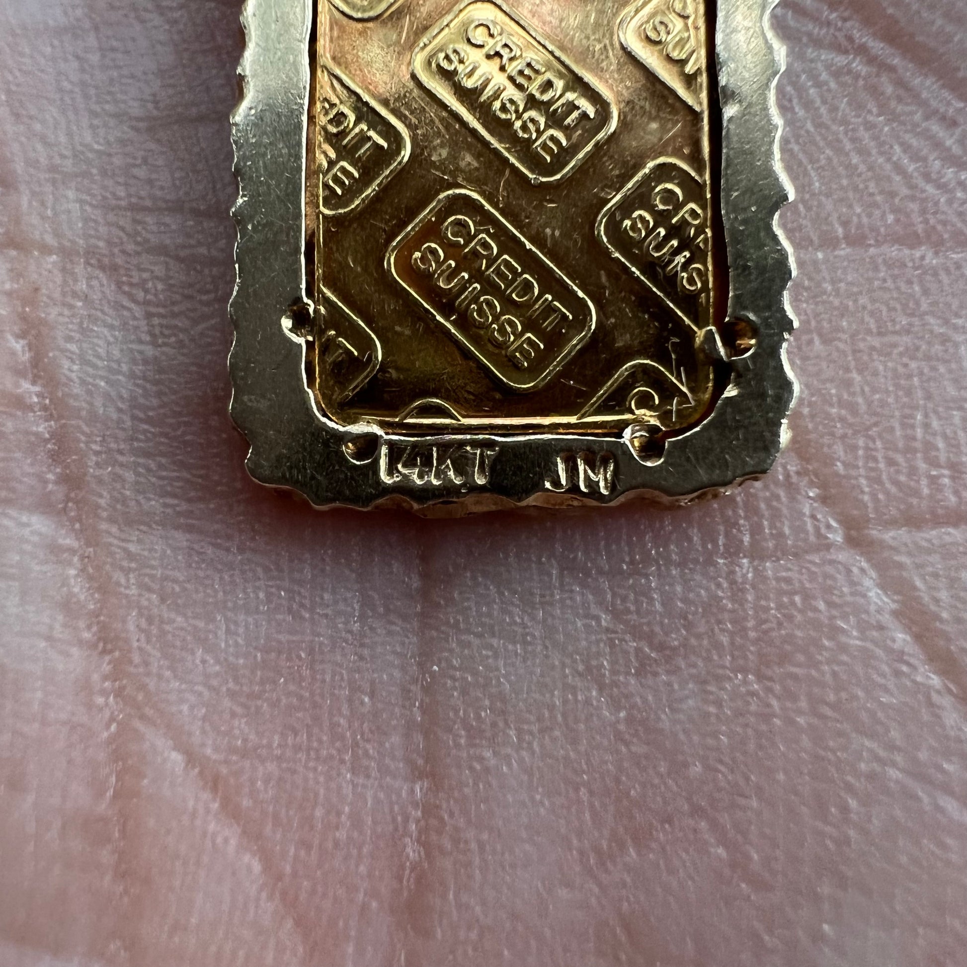 Custom crafted solid 14k yellow gold nugget bezel pendant custom made to size special for this 1980’s pure .999 fine gold (1g) credit suisse bar. Total weight of both bar and pendant is 3.26g so you’re making a great investment at this price for this piece.