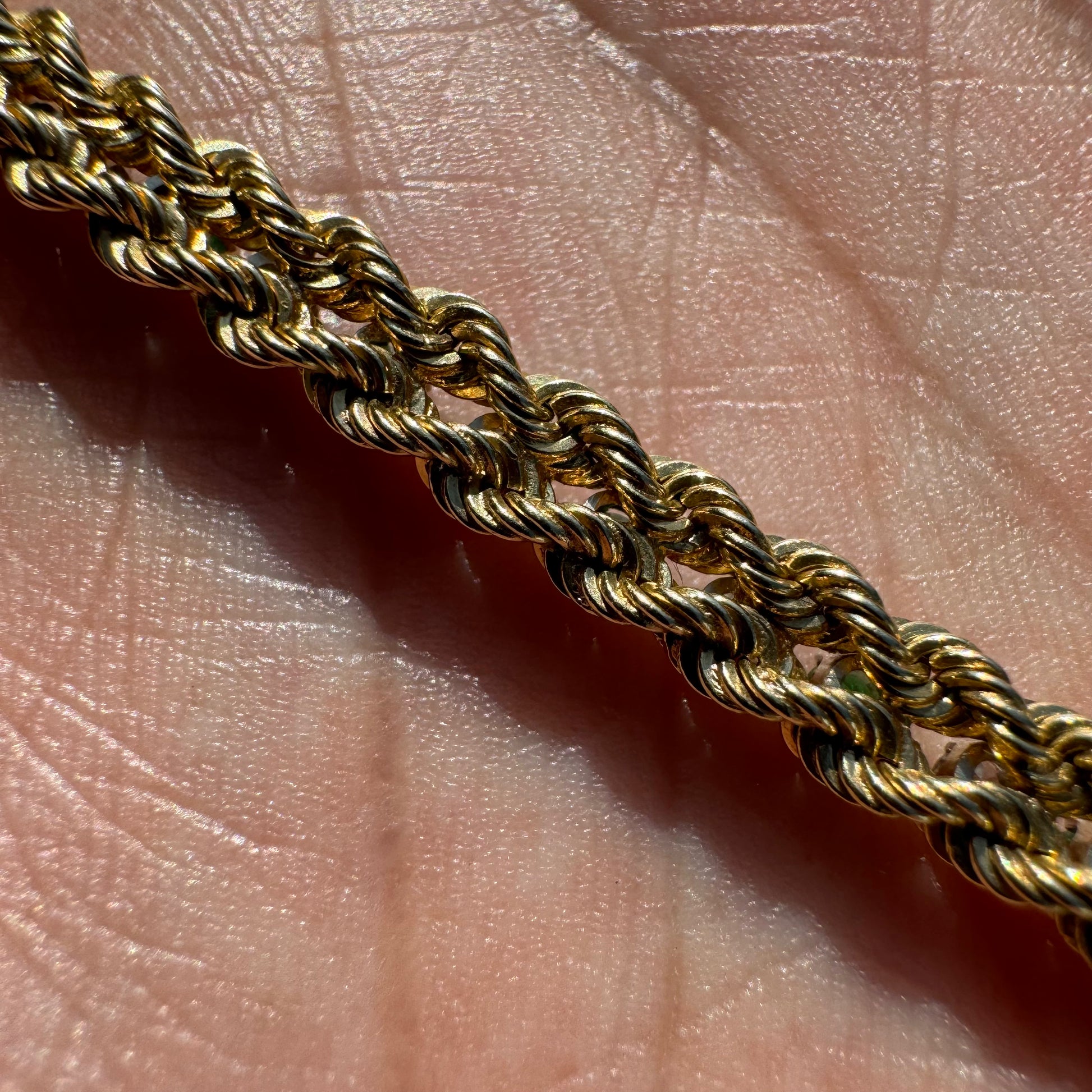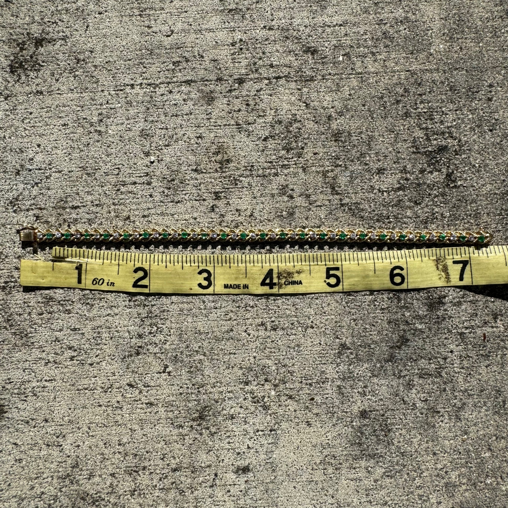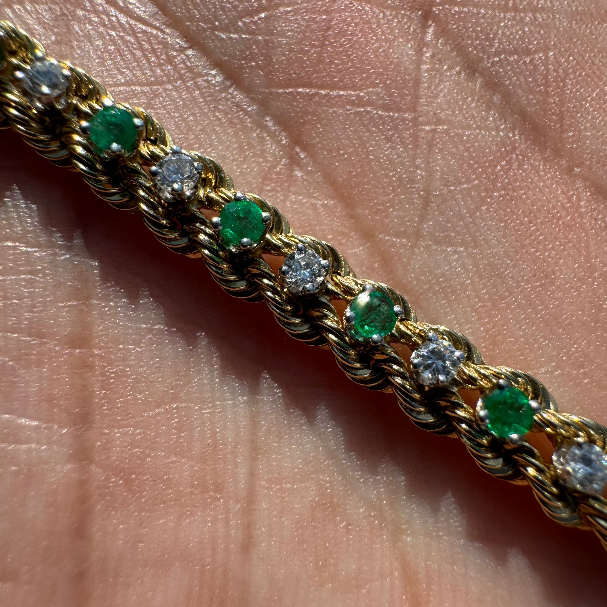 Clean is understatement when it comes to this bracelet. The 23 natural diamonds of VS quality and D color at approximately .035-.04ct each (.90ctw) are exquisite and really set off the tone of this bracelet when paired next to the other 23 extremely clean natural emeralds also ranging about the same size just a tad larger totaling around 1.0ctw. The approximately 2.0ctw of combined stones are all prong set on top of a solid 14k yellow gold double rope bracelet measuring 7” in length and 5mm wide weighing in at 11.5g.