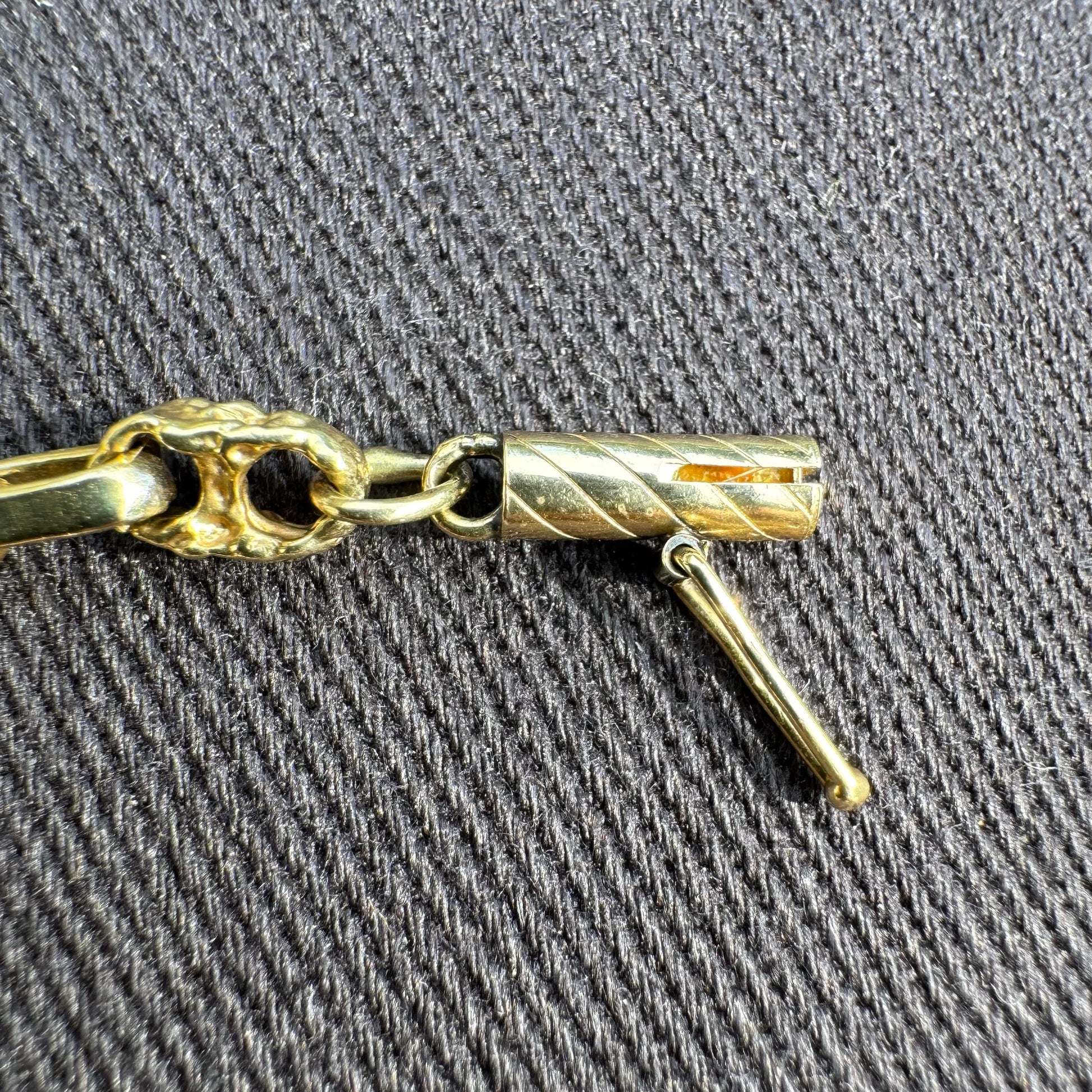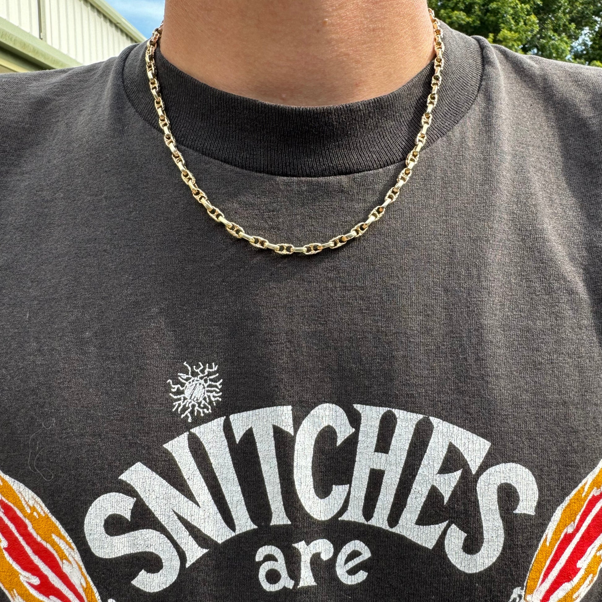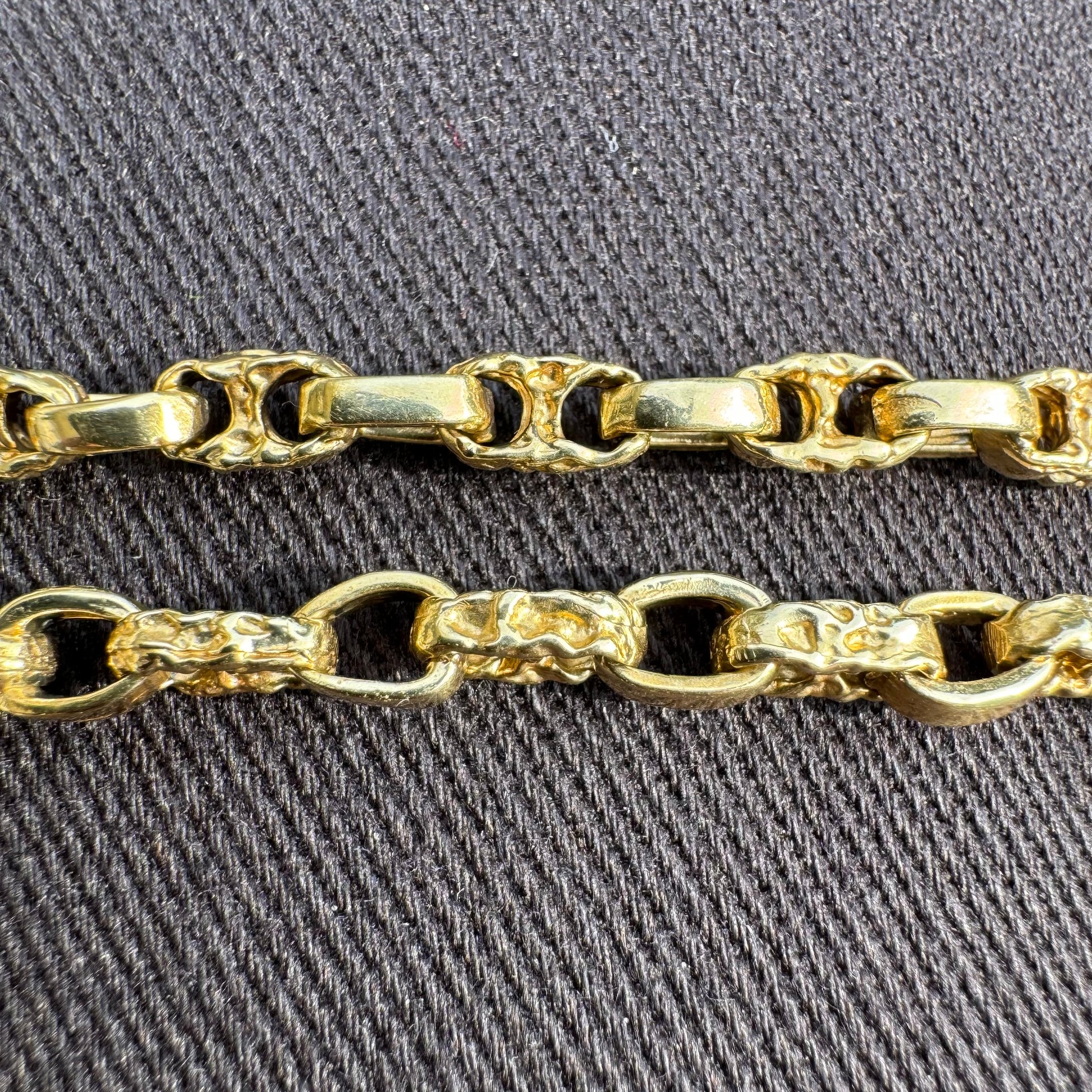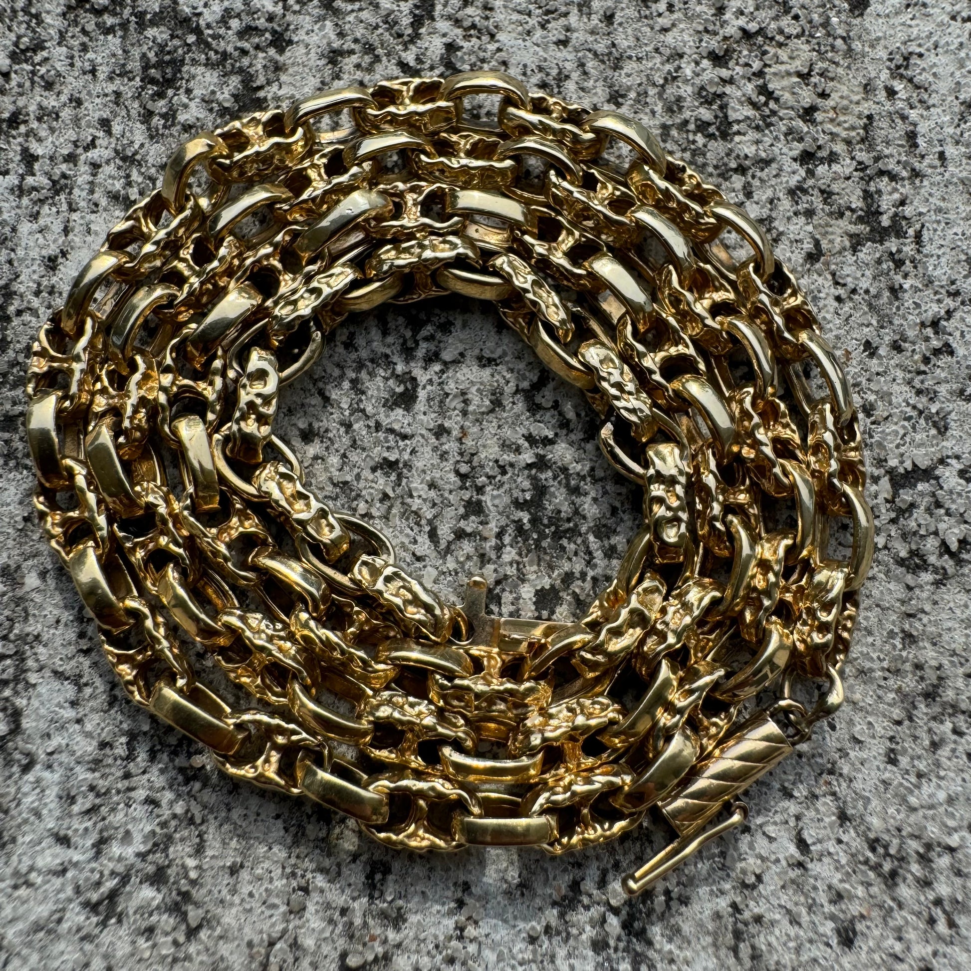 One of the hardest link styles to come across no matter what type of finish but add the extra needle in the haystack for it being a brutalist solid Nugget style format. I kid you not when I tell you besides my bracelet of this same style, that I am also selling, you will not find another one of these even if you take the whole week to search high and low. It took me 3 years apart from eachother to finally find this necklace after I had the bracelet and that’s why I’m deciding to just sell them both. Handcrafted in the 1980’s where each Link is unique to eachother and none are exactly the same the necklace measures to a fitting 18.5” in length at 4mm in circumference and weighing a stacked 26.5g of solid 14k yellow gold with old school style barrel lock clasp.