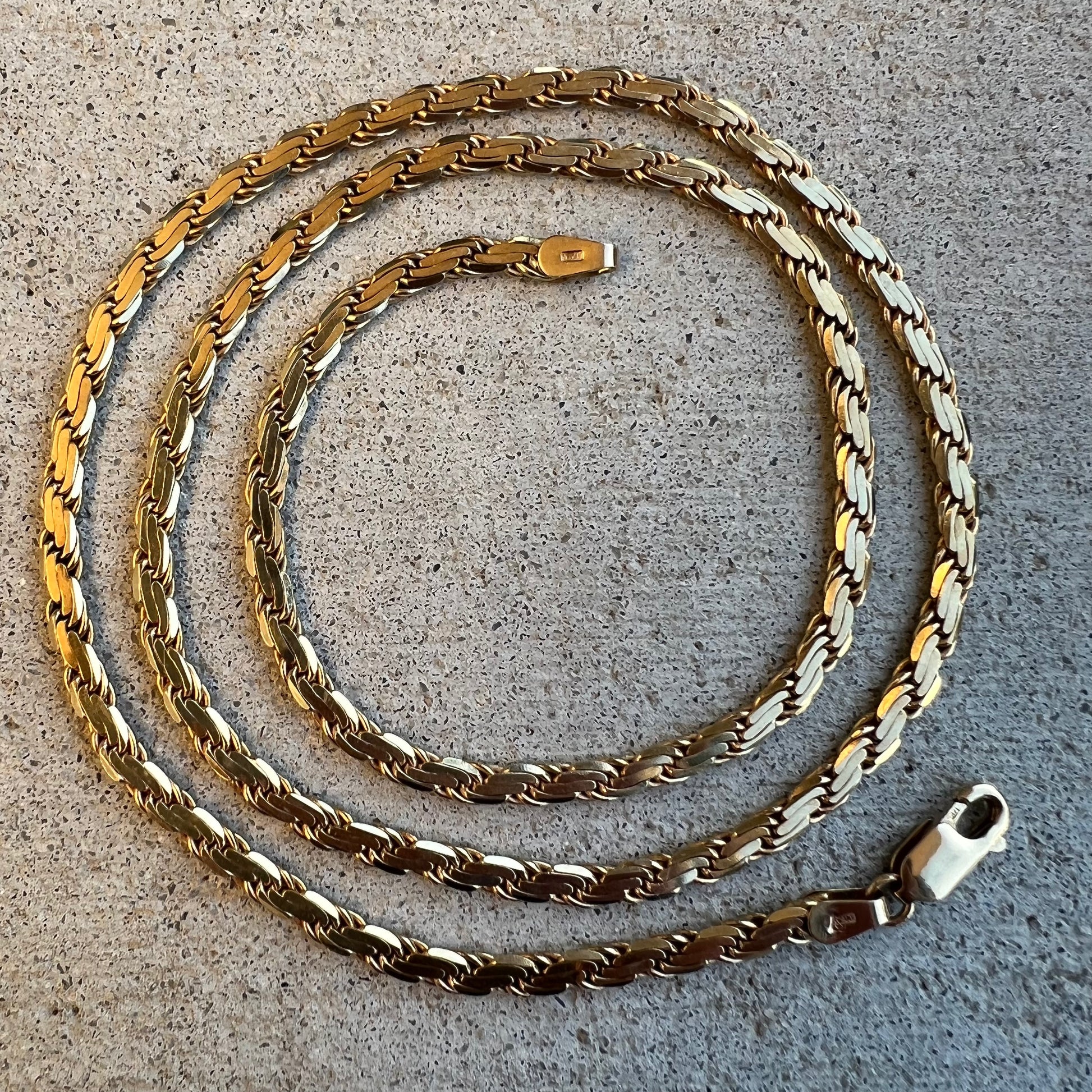 Looking for a heavyweight and Heavyduty necklace that looks good to wear with or without a pendant? This is the chain. Built with Italian quality sometime around the 1980’s is a solid 14k yellow gold Diamondcut braided rope chain, this is not just the average rope chain. This is flat lay. Imagine a regular diamomdcut rope necklace but 3Dimensionally flat at 1.5MM and that is what you have here. A super clean clean look this piece is in excellent condition with flash points around every edge giving off a burst of flames. You don’t come across this one often. 20” in length and 3.5MM wide at just about 20g.