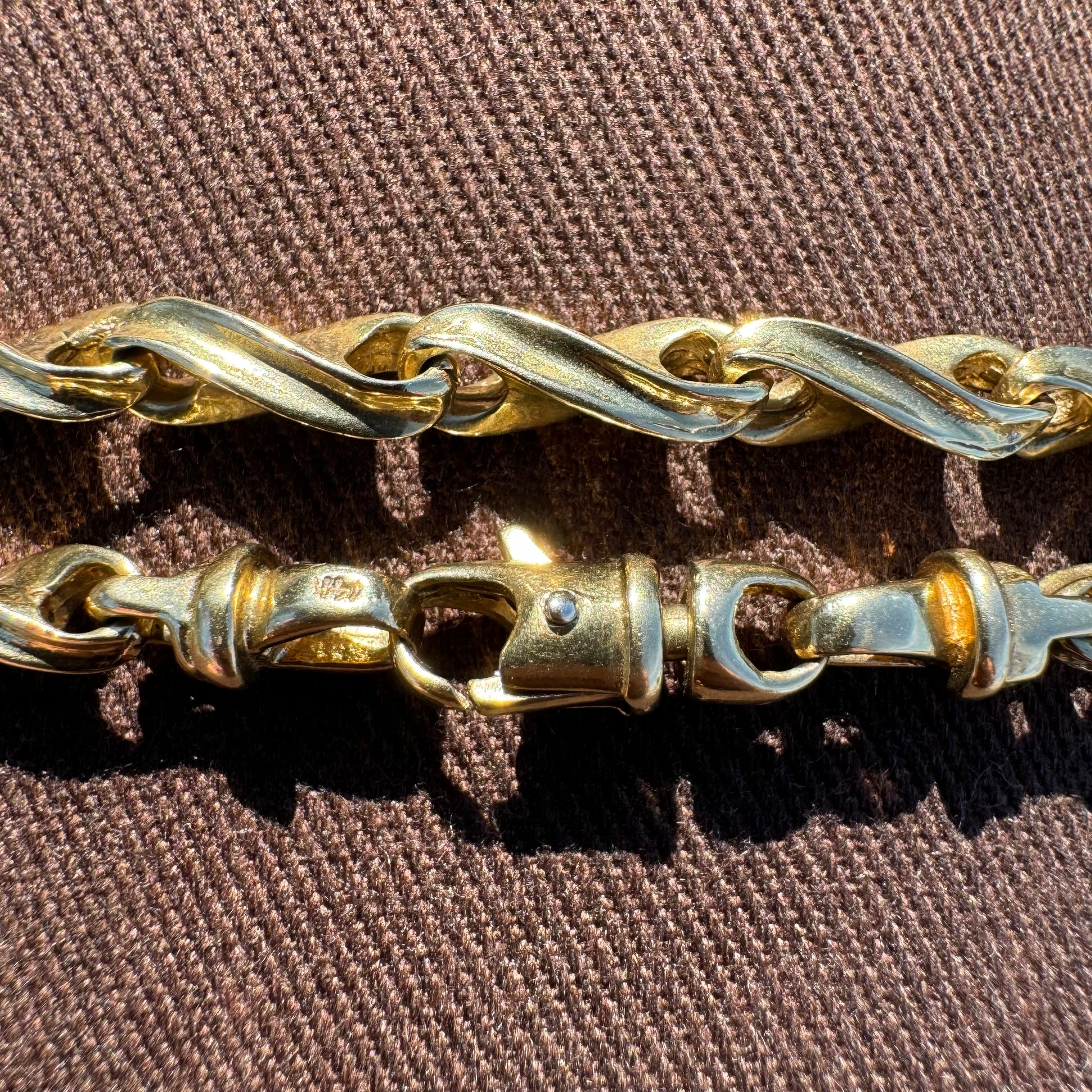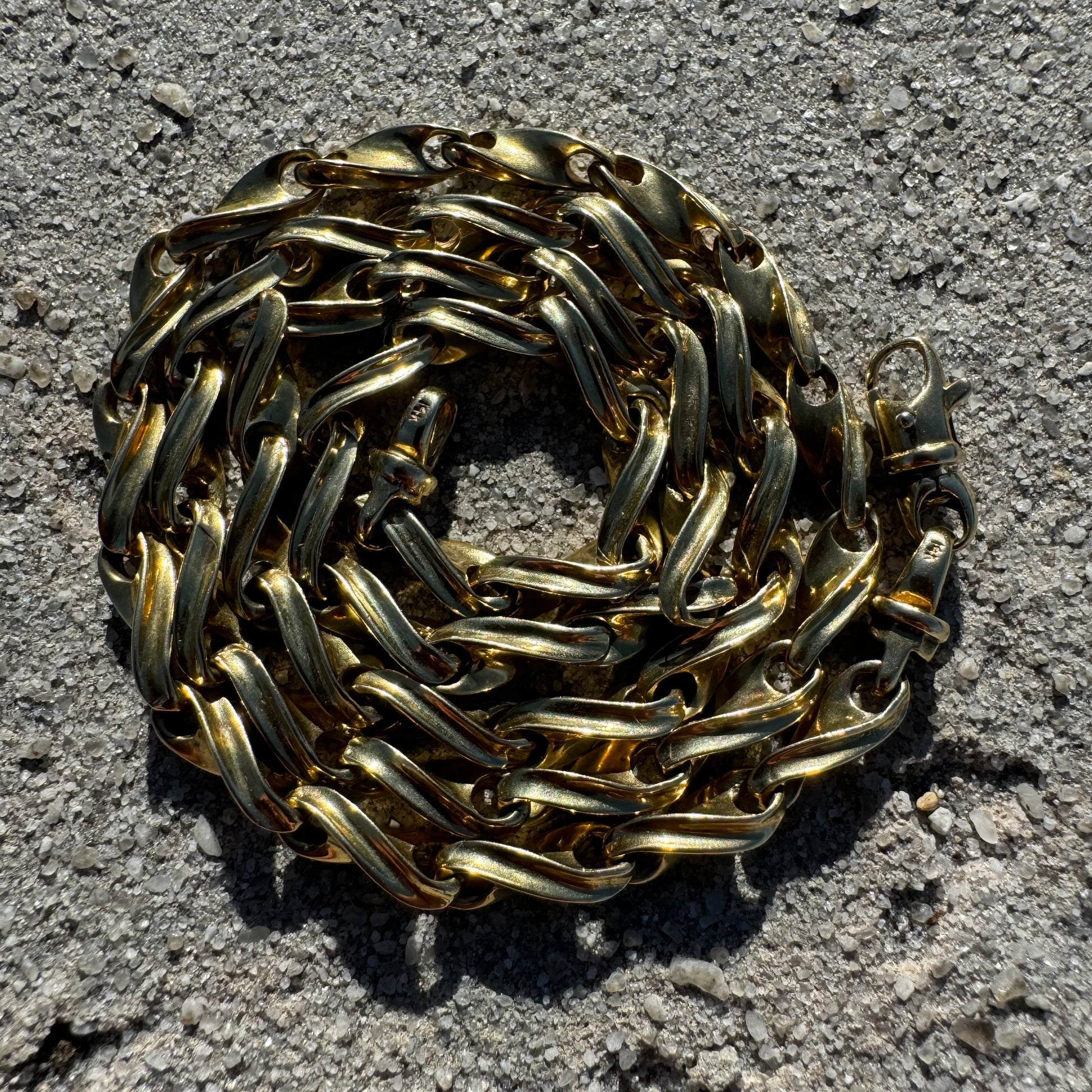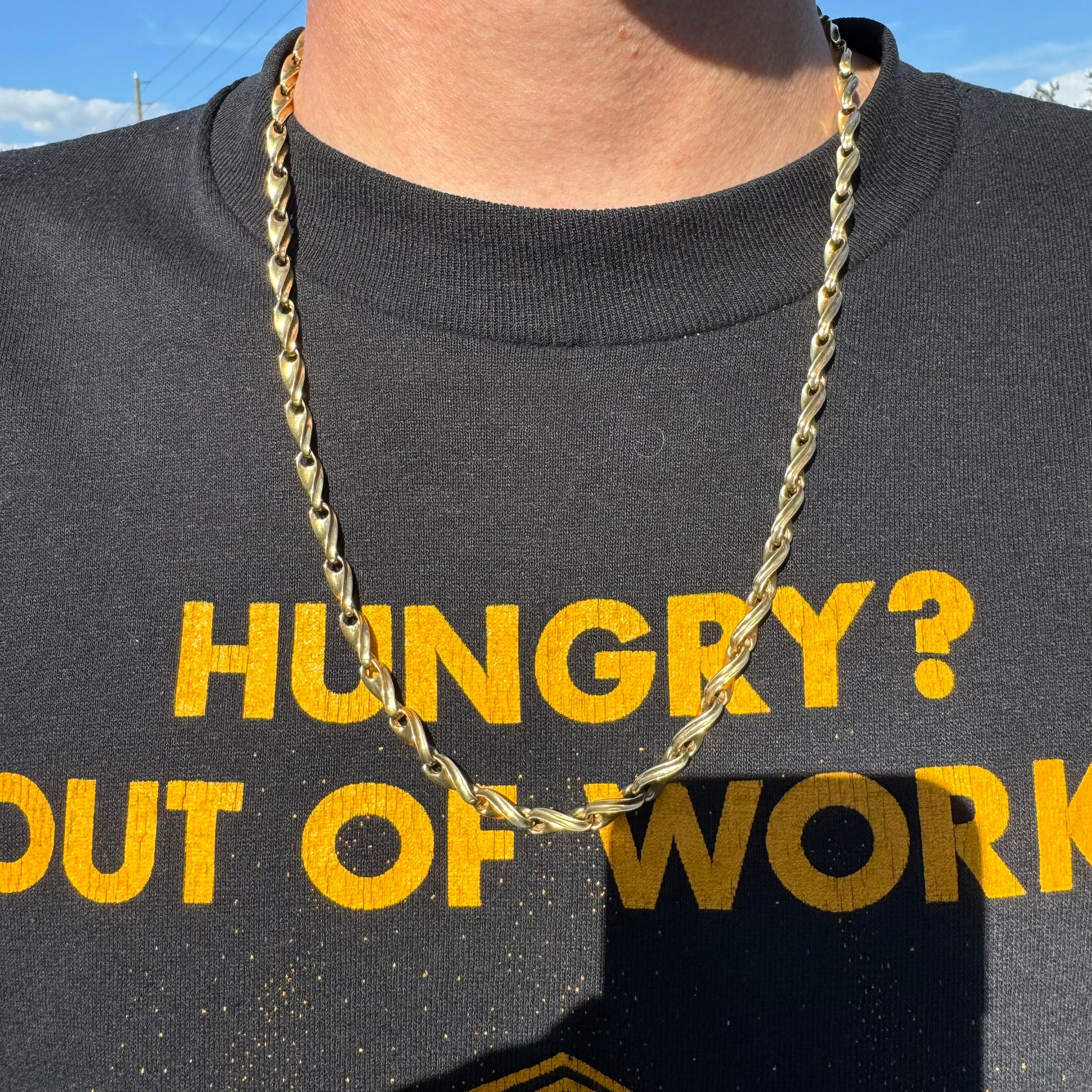 Design, craftsmanship, and ingenuity at its finest with this extremely unique all solid 14k yellow gold heavyweight fancy spiral link necklace. Fully equipped with Heavyduty strong terminal ends and a fully 360 degree spinning chunky lobster clasp this chain is designed to never kink up or twist as you’re wearing it. A heavyweight of 48.42g with each twisted link measuring just over 5mm in circumference and interconnecting one to another measuring at 23” in wearable length not only is this a fancy and well designed piece of jewelry from the past but at this price point with the amount of gold it’s a very strong and safe investment.