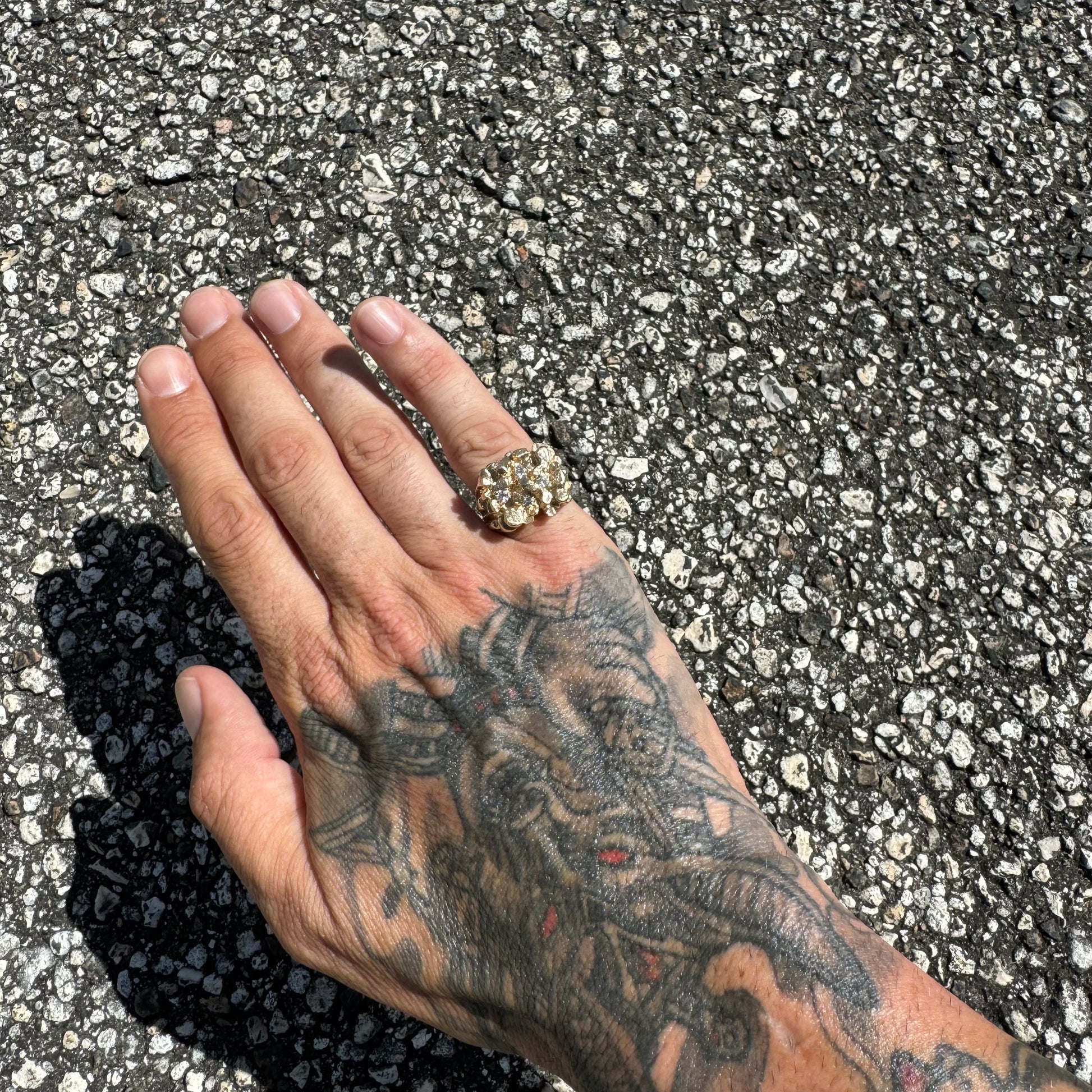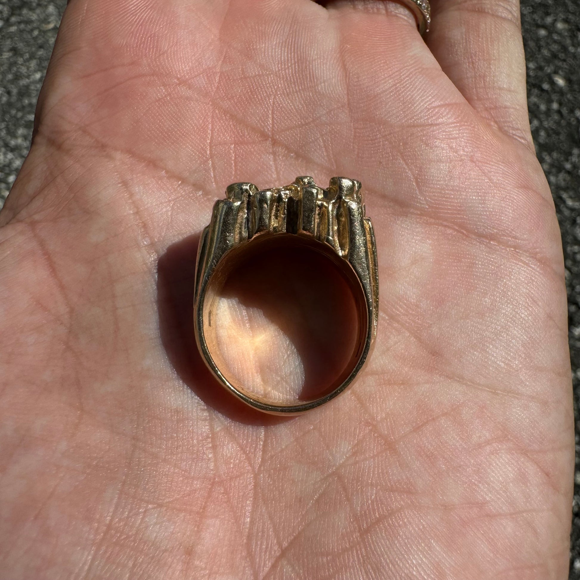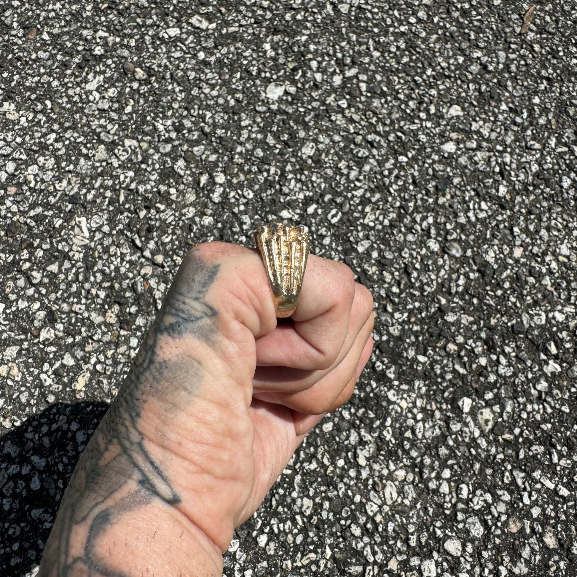 This piece is like dropping a bomb. Super heavyweight and a solid brick of 14k yellow gold weighing 26.1g. Not only can this ring take anytype of abuse or interaction that your hands and rings go through on a daily basis but this is an investment piece that will continue to grow in value and last lifetime after lifetime. With 4 super clean natural diamonds totaling approximately .35ctw precisely encrusted into the ring bet securely it gives that added dazzle to a rough and bad ass look. Approximately a size:8.25 to 8.5 on my mandrel this ring will look good on any finger as it’s sits very broadly on the knuckle at 19.5mm x 17mm.