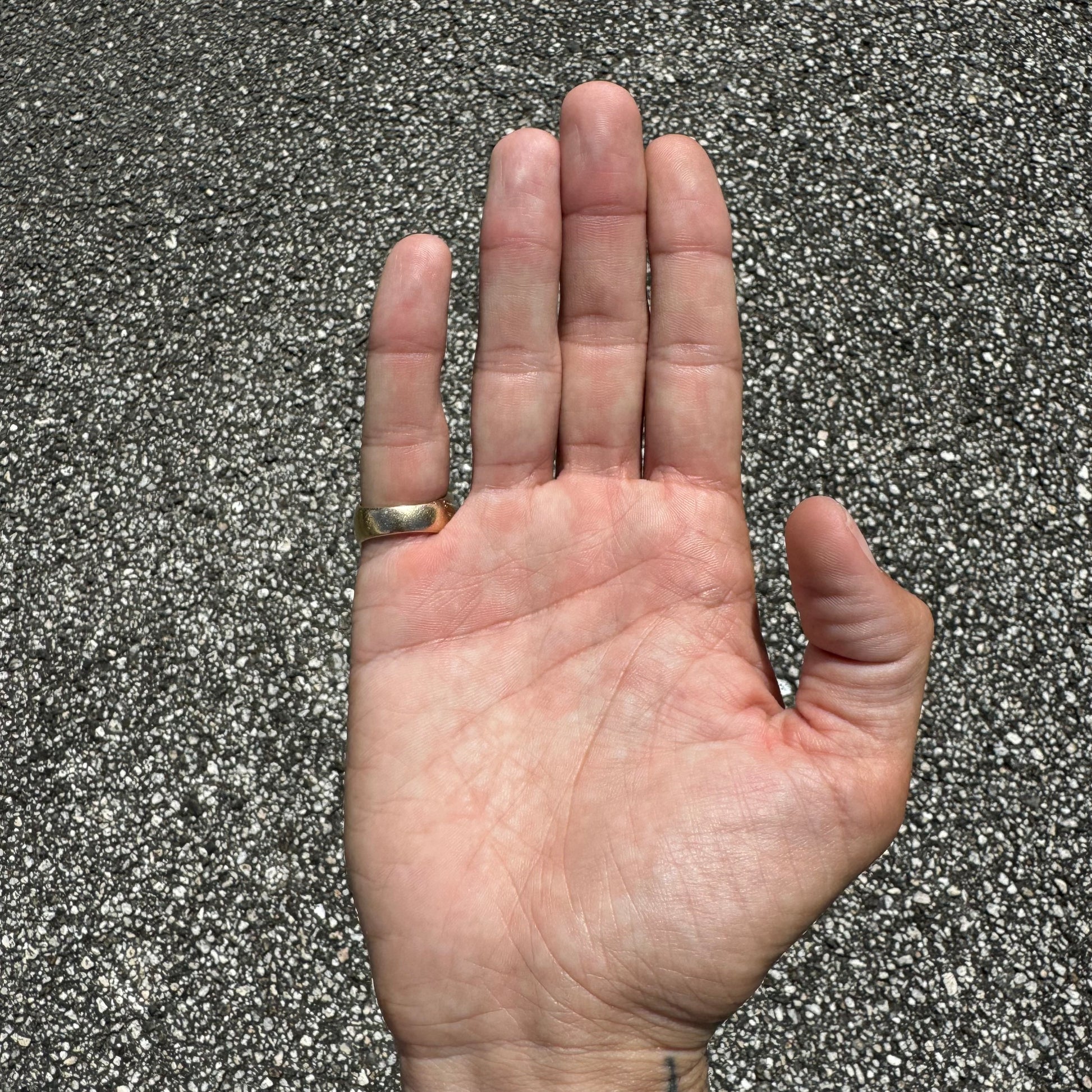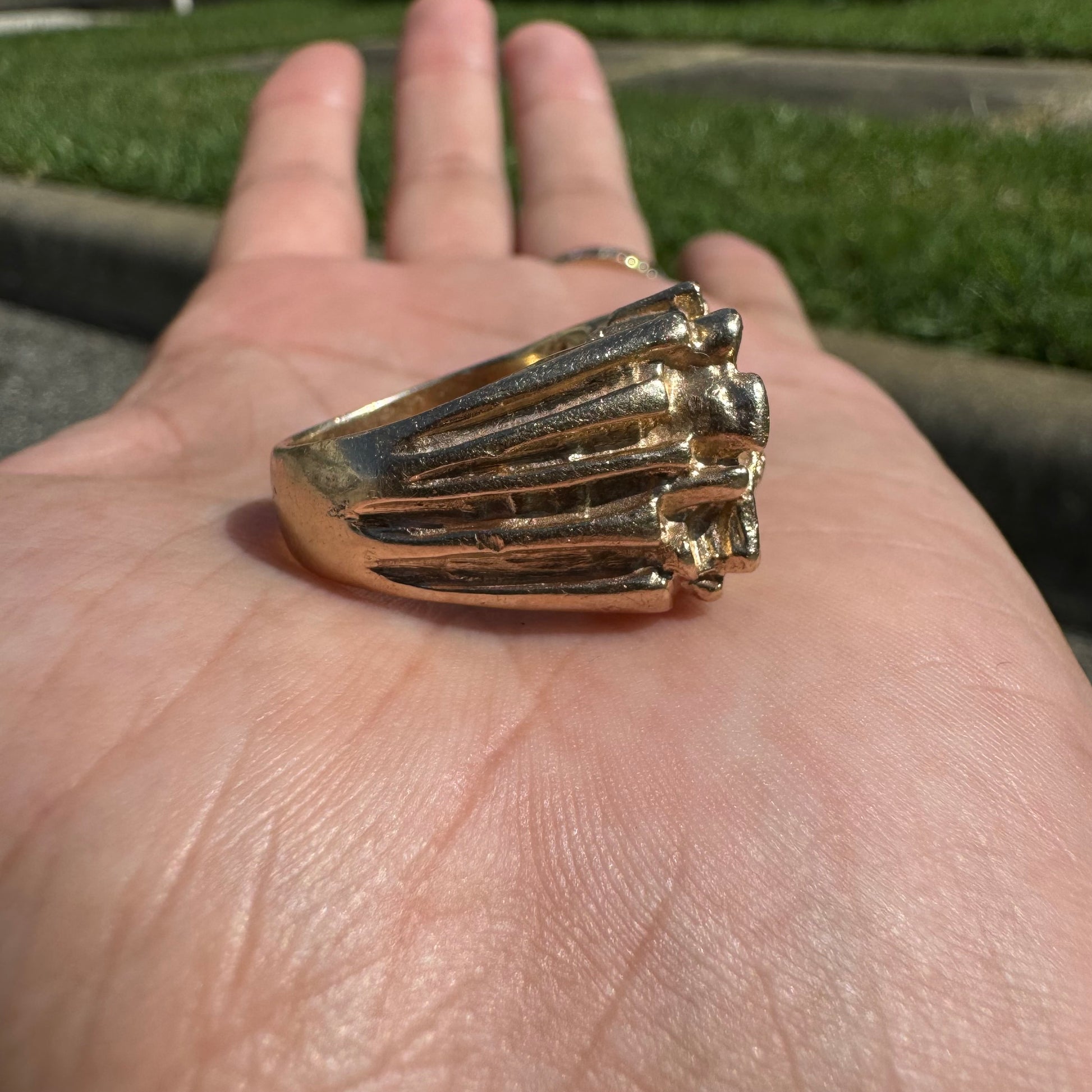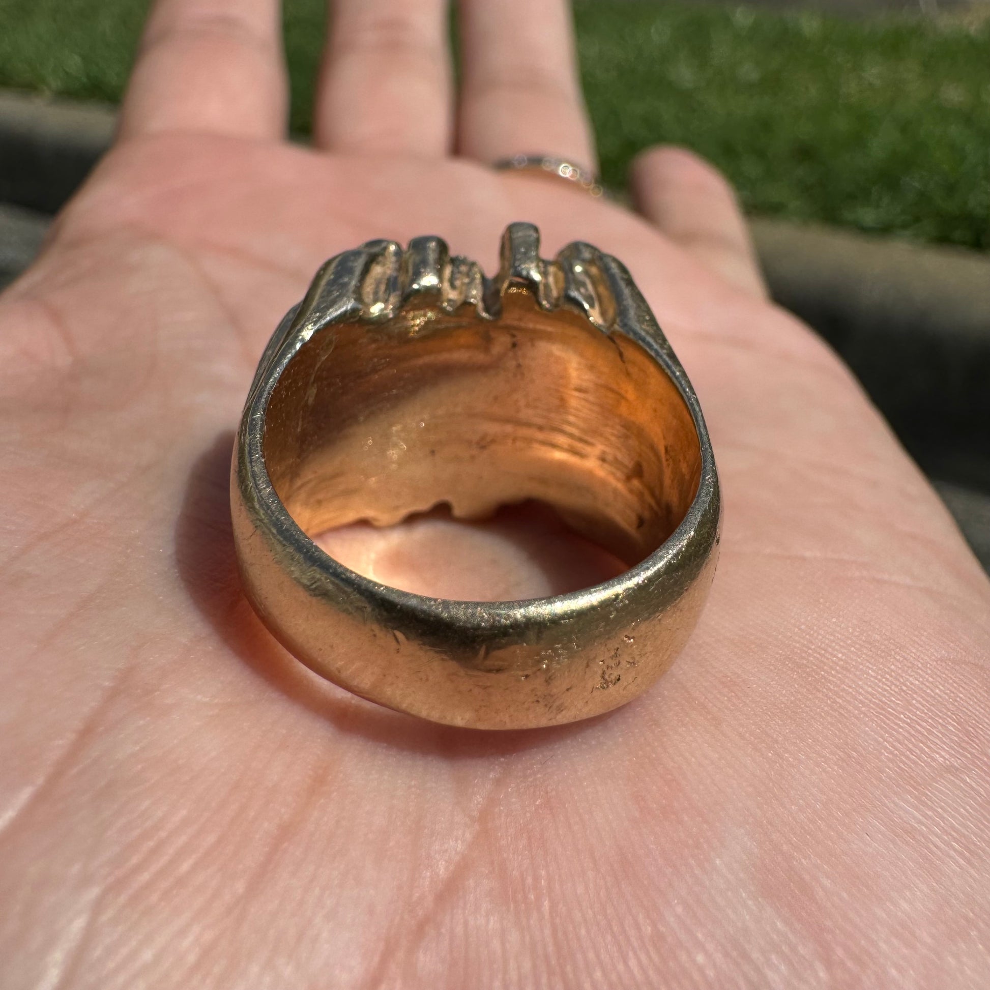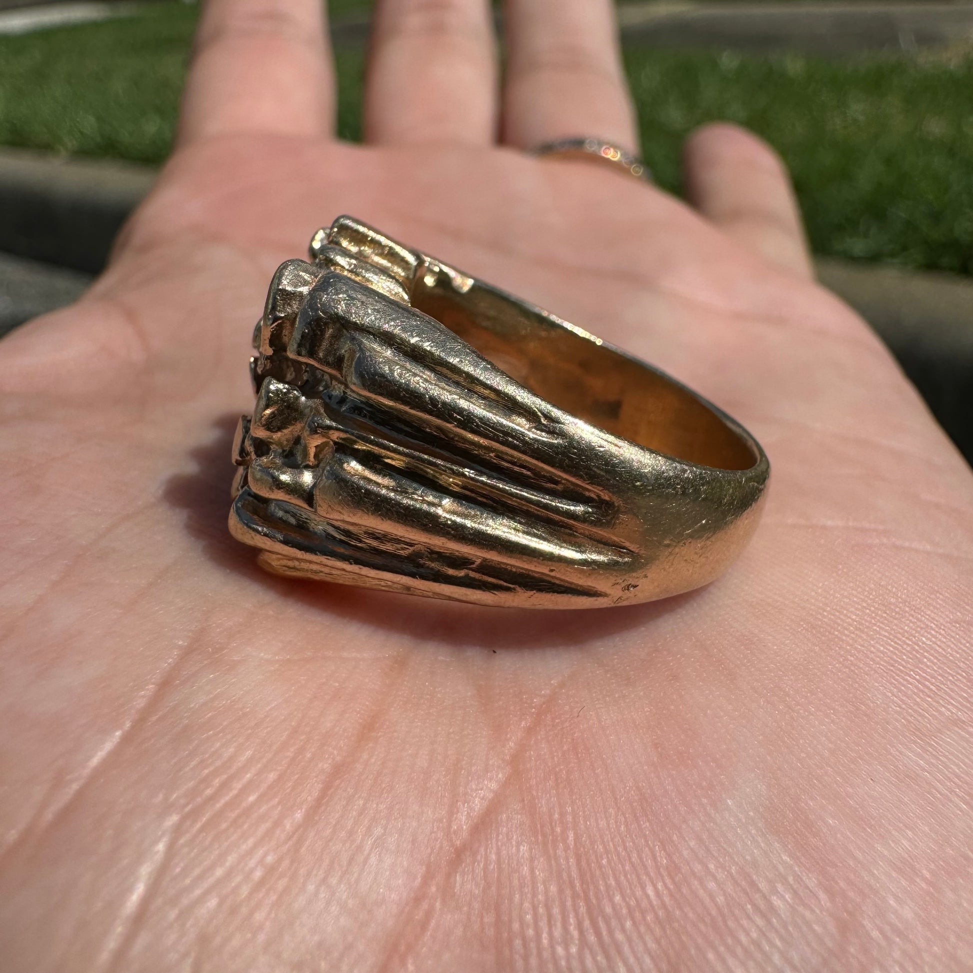 This piece is like dropping a bomb. Super heavyweight and a solid brick of 14k yellow gold weighing 26.1g. Not only can this ring take anytype of abuse or interaction that your hands and rings go through on a daily basis but this is an investment piece that will continue to grow in value and last lifetime after lifetime. With 4 super clean natural diamonds totaling approximately .35ctw precisely encrusted into the ring bet securely it gives that added dazzle to a rough and bad ass look. Approximately a size:8.25 to 8.5 on my mandrel this ring will look good on any finger as it’s sits very broadly on the knuckle at 19.5mm x 17mm.