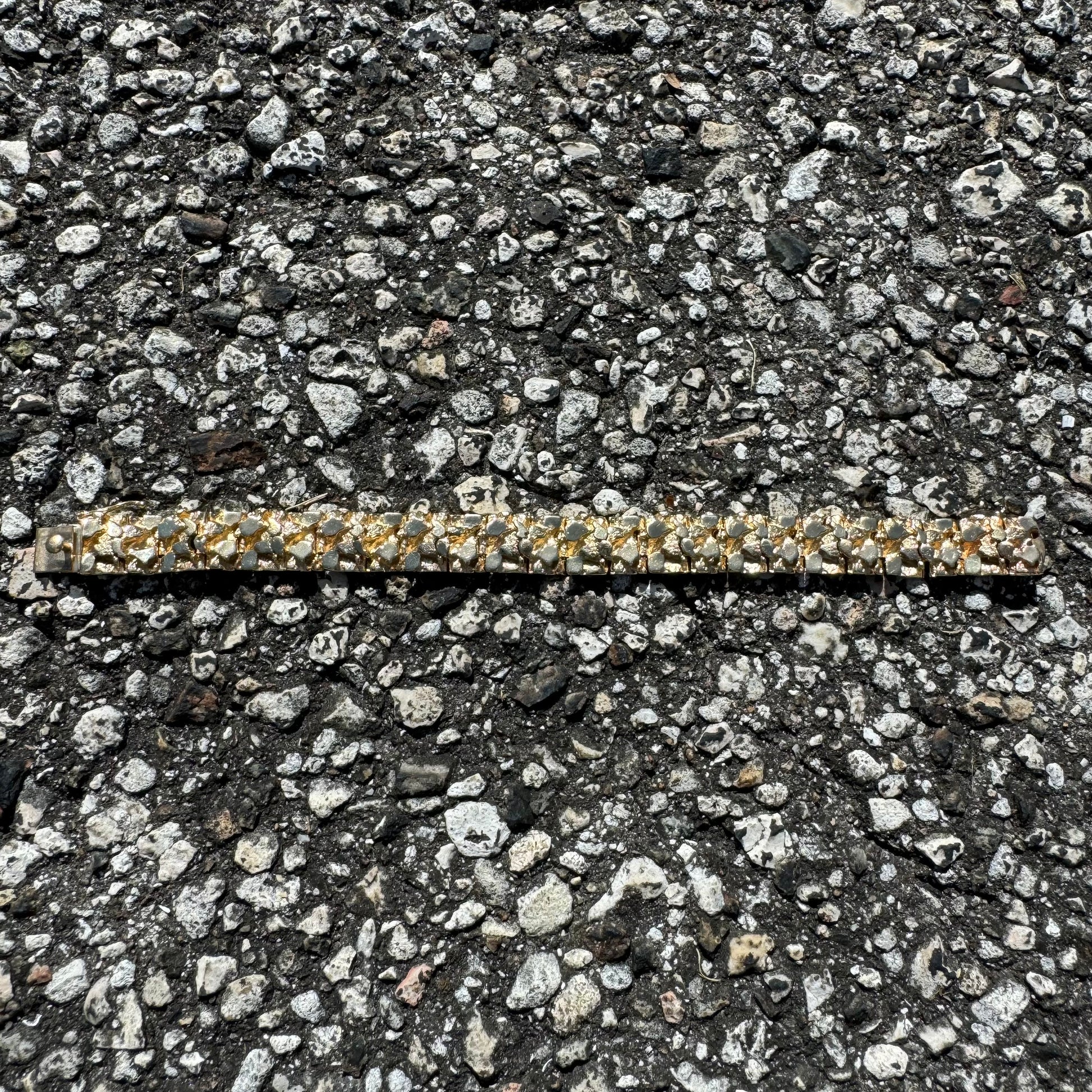 The epitome of 1980’s/90’s street jewelery, the Nugget. Whether in ring, necklace, or bracelet form the Nugget style played a huge role in the fashion of street jewelry from that time frame. Look at any hustler, rapper, or street role model from then and you’ll see them flossed up and bricked down in Nugget jewelry. Giving off that rough and tough look with elegance this bracelet is solid 14k yellow gold weighing just under 45g making it extremely heavy duty, you won’t have to worry about damaging this bracelet ever no matter what type of activities you’re into. Measuring at a wearable length of 7.25” with a width and thickness of 11MM x 4.5mm the bracelet is secured by a box lock with extra safety side latch.