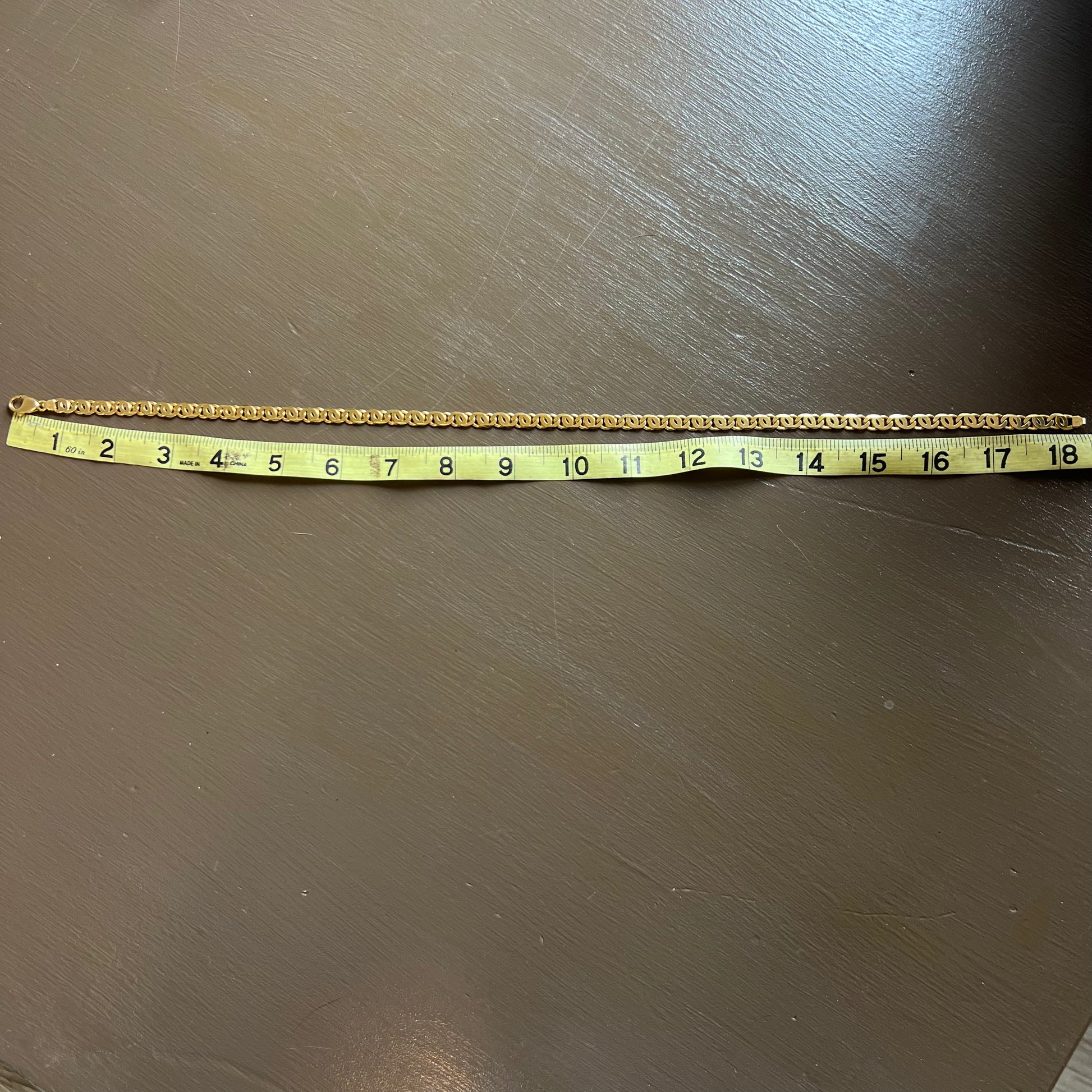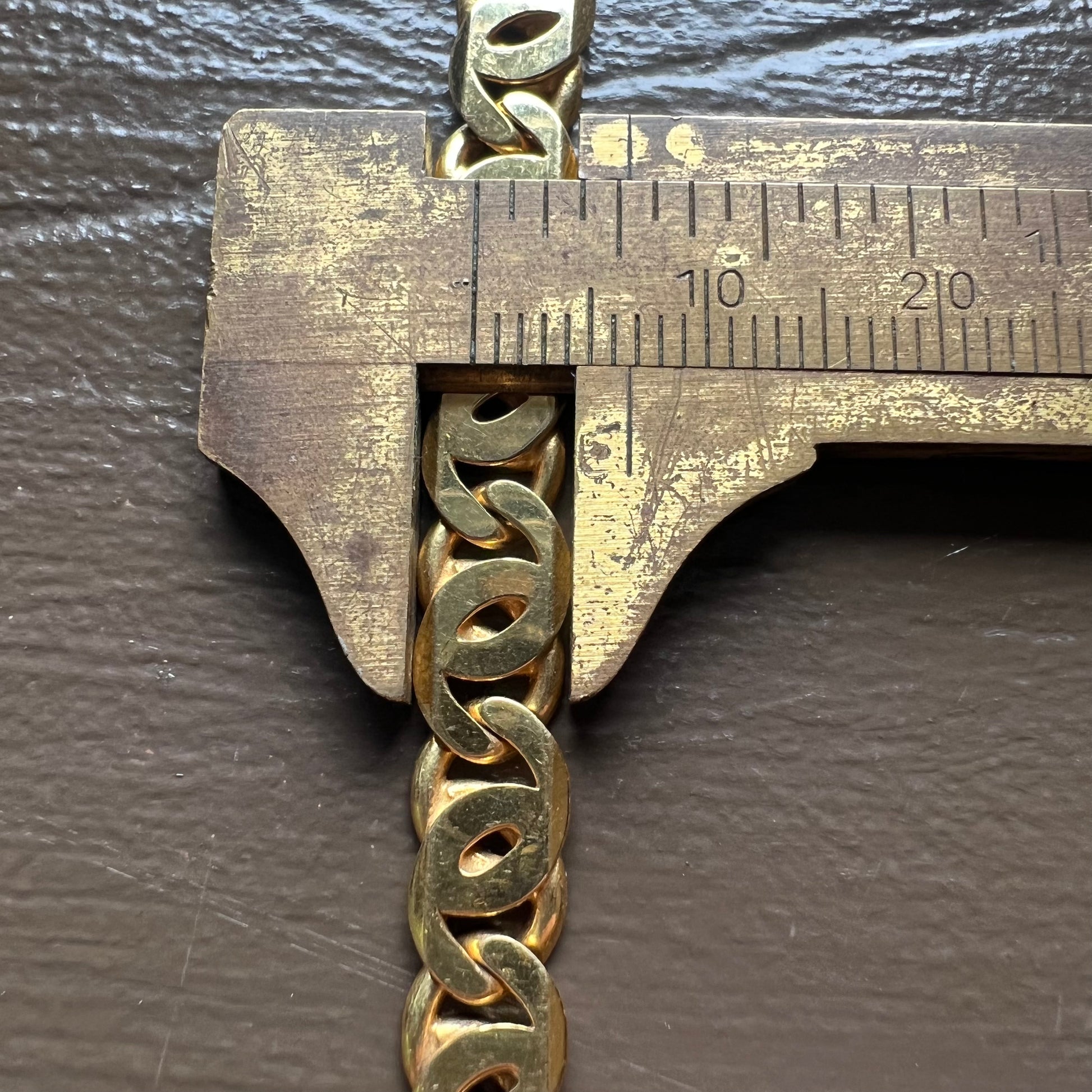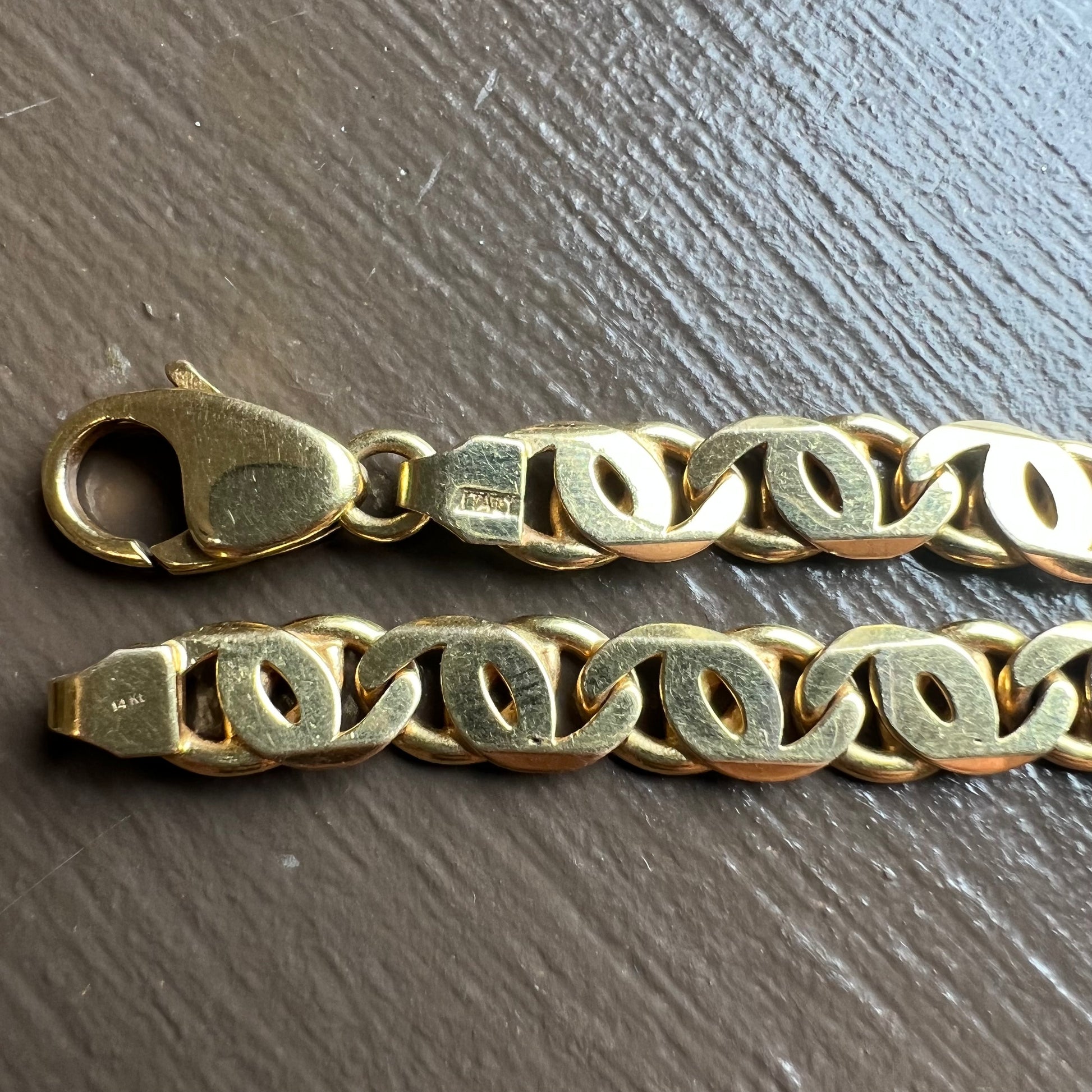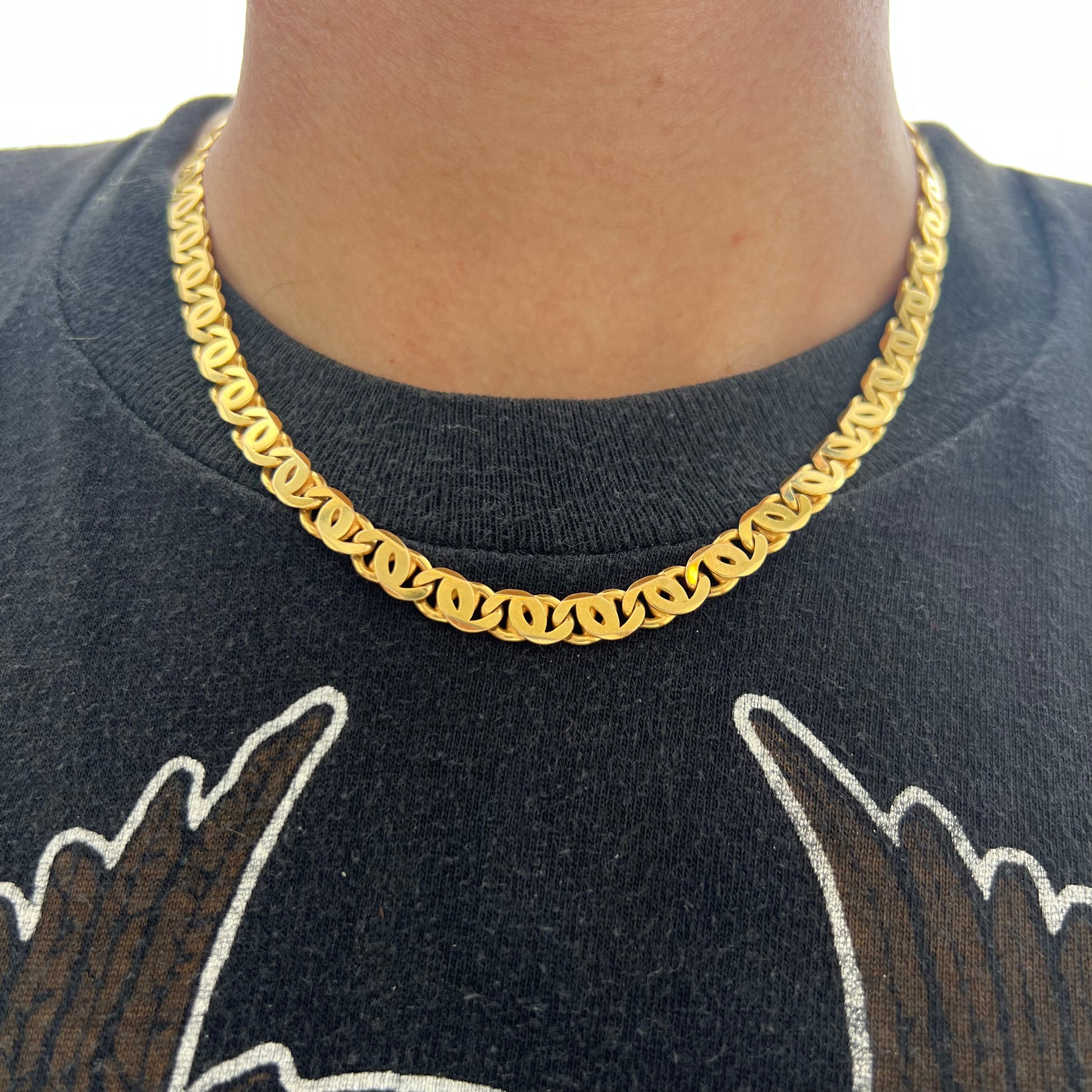If you’re reading this you’re looking at my favorite chain available on the site right now. Quality, looks, weight, this chain has everything you want going for it. A chunky vibrant solid 14k yellow gold, made in Italy, weighing in at a hefty 38.5g and measuring 18.25” at 7mm in width by 2MM thick. This is called a Tigers Eye Chain, the name just sounds fierce and looks go right with the name but it’s better known as a “Chanel Link” for its double C look after the Parisian fashion house. This is the one.
