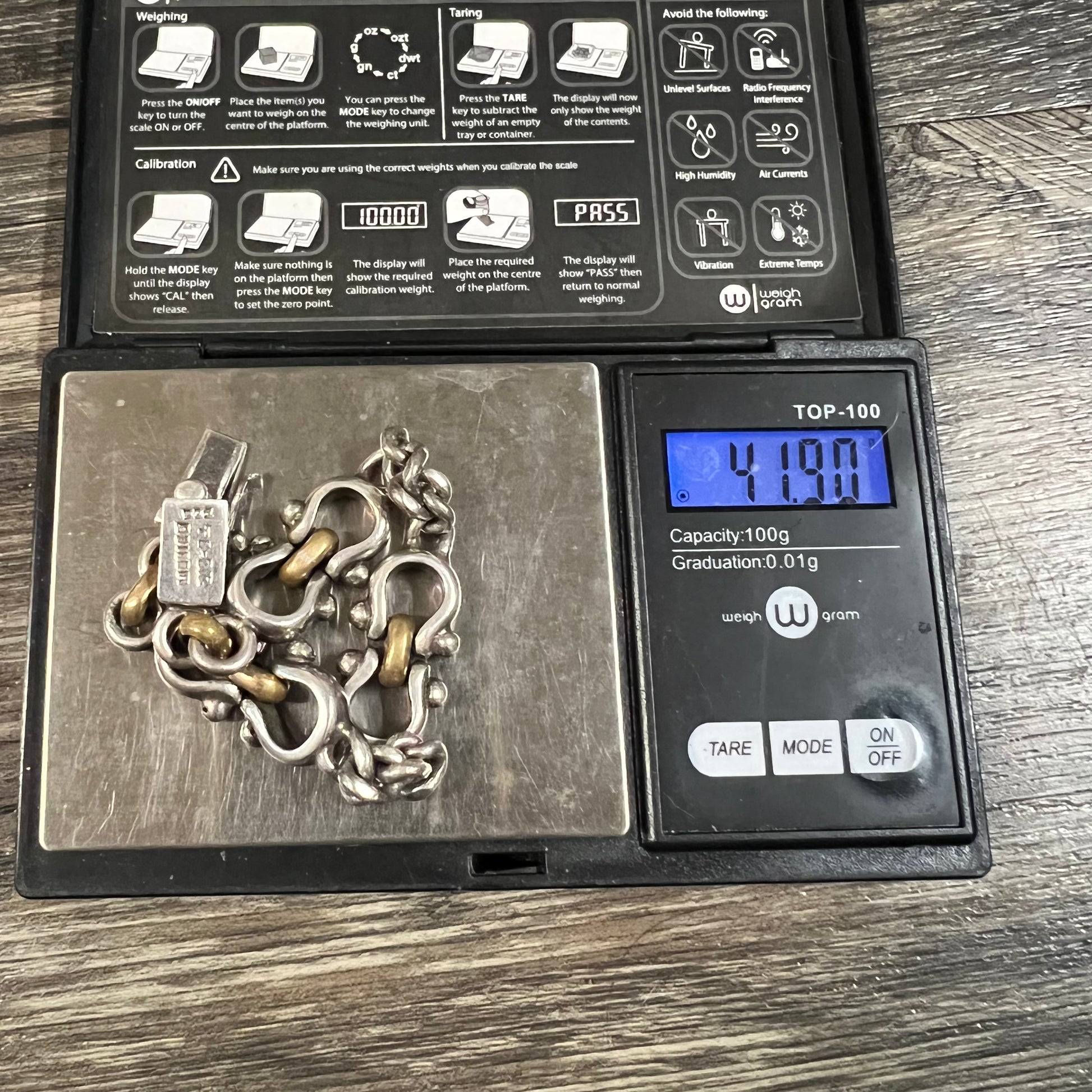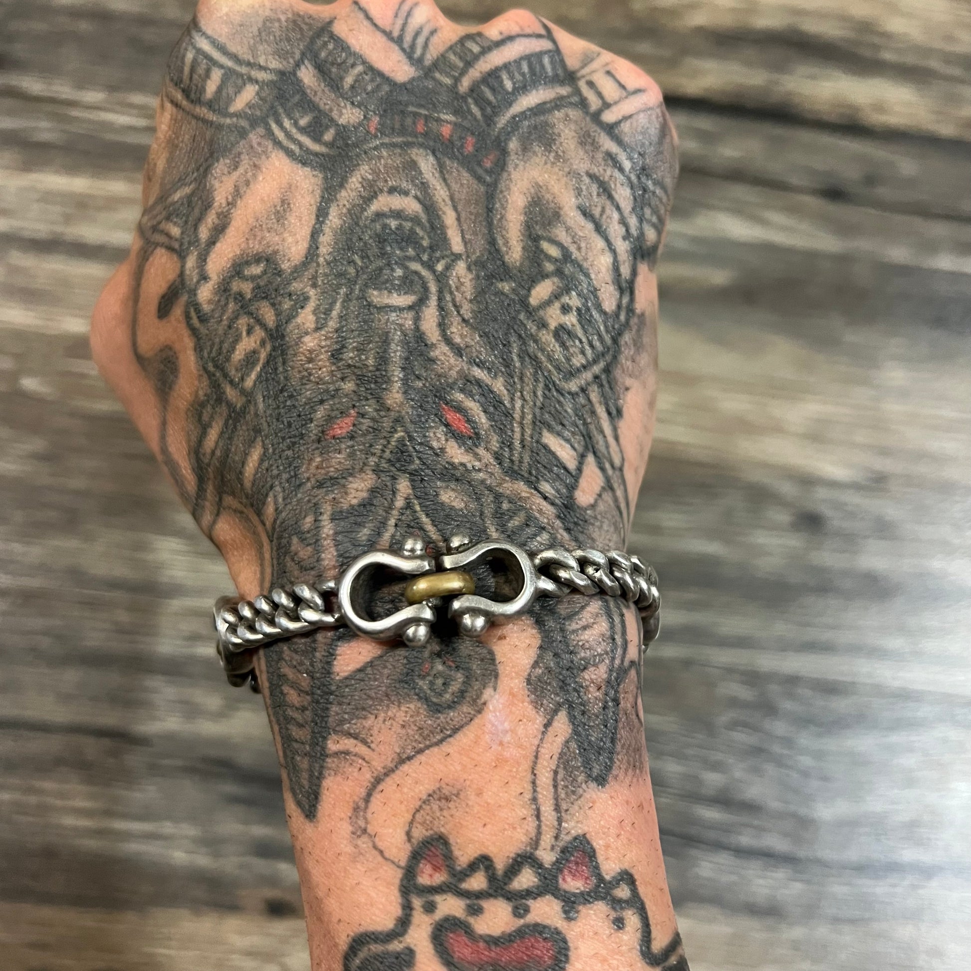 Very unique all handmade solid heavyweight TAXCO cuban link sterling/.925 silver bracelet. This modernist style piece has chunky Cuban links leading up to one of a kind back to back shackle style links. Measuring 7.5” with a chunky width of 7 to 15MM and weighing in at a hefty 42g.