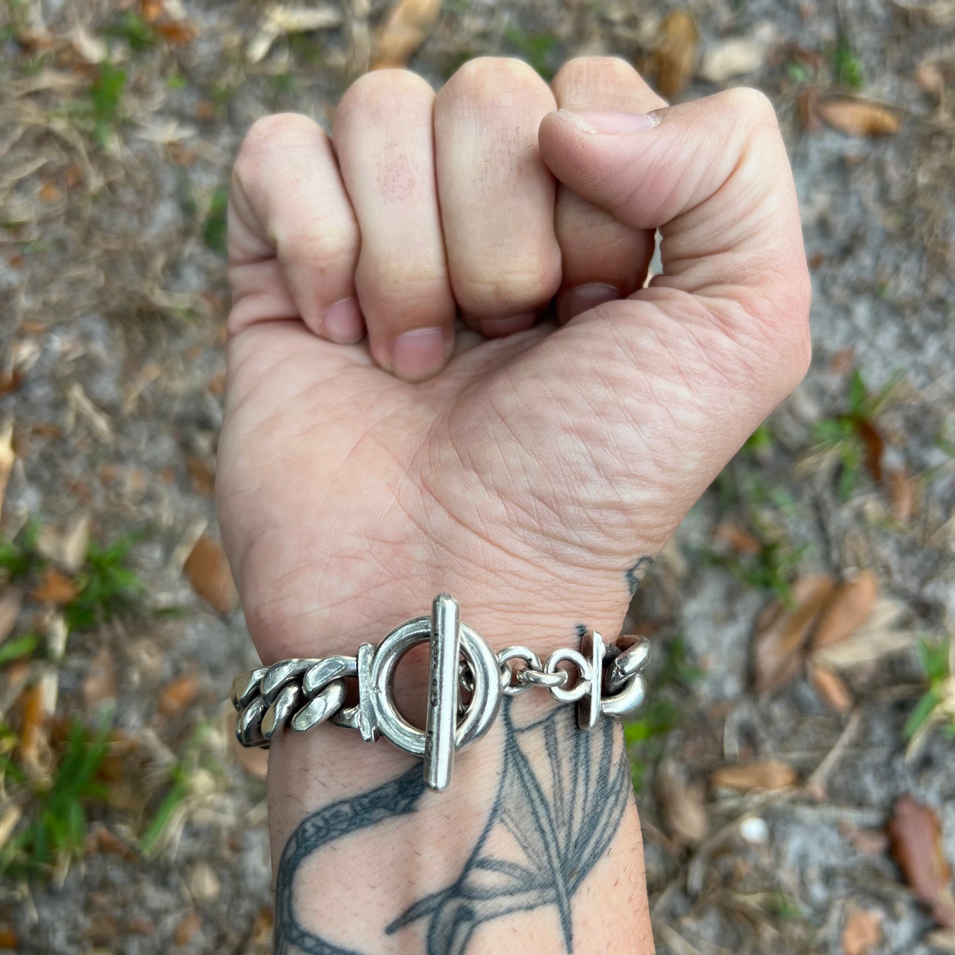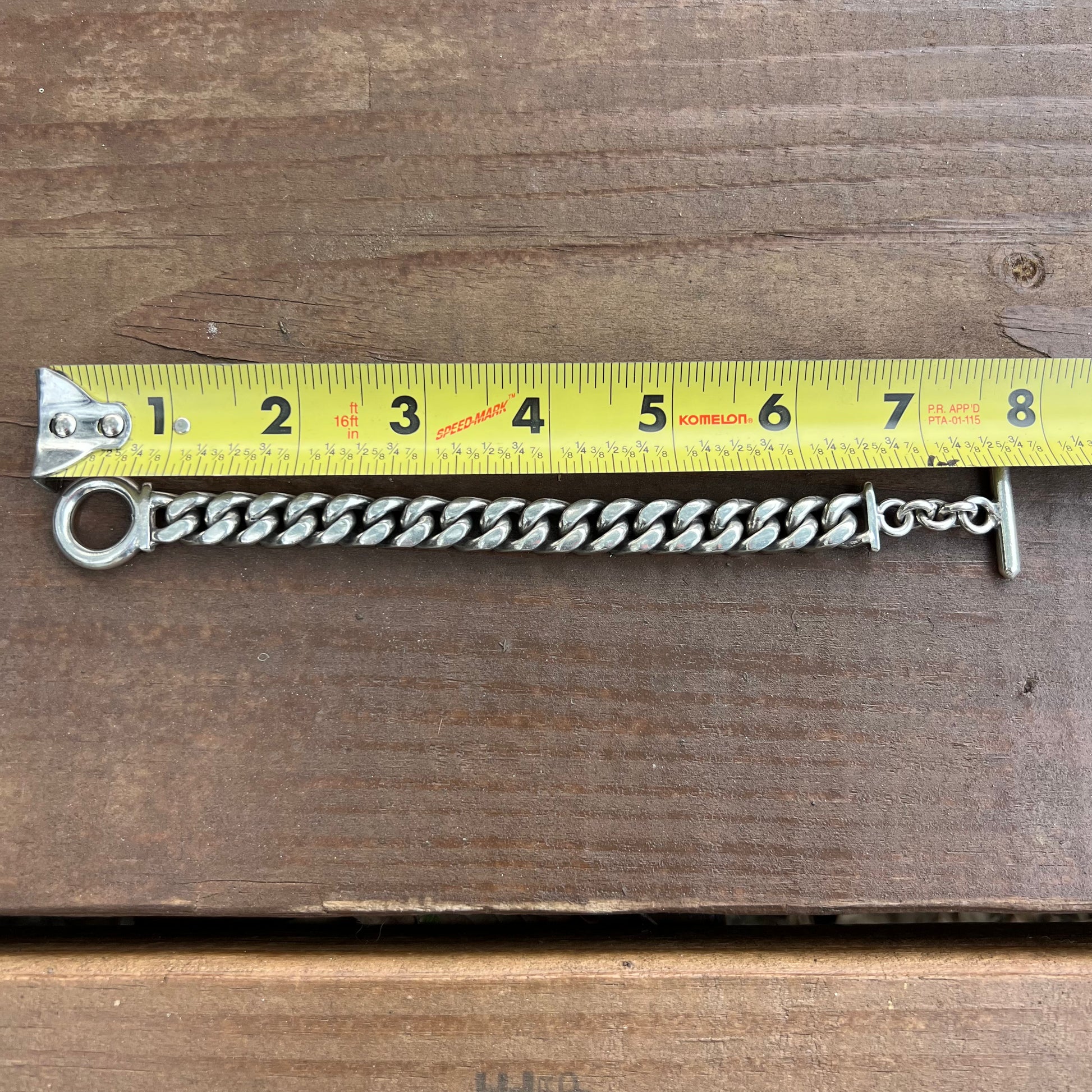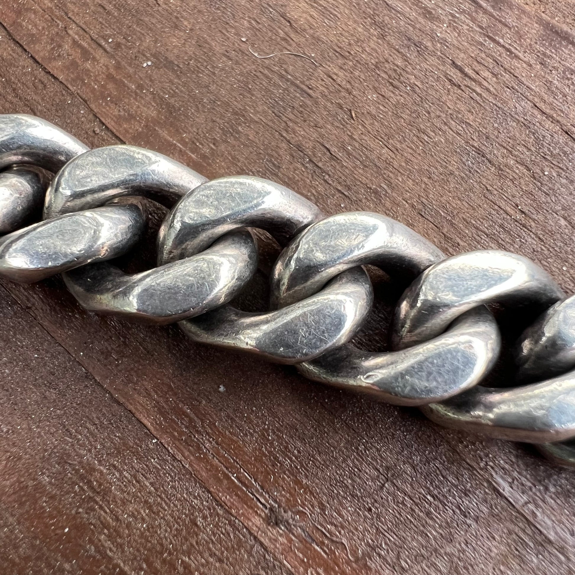 One of the best quality silver bracelets I’ve had in a long time. This Taxco piece is all handcrafted and super heavy for a bracelet at 73g of solid sterling/.925 silver. Maximum chunky effect without being too overbearing this one is 11MM wide with 6MM sidewall profiles and though it measures 7.75” end to end because of its thickness and due to the toggle clasp it fits best up to 7.25” but a perfect wrist would be about a 7”. This is very cheap for this caliber of old school.