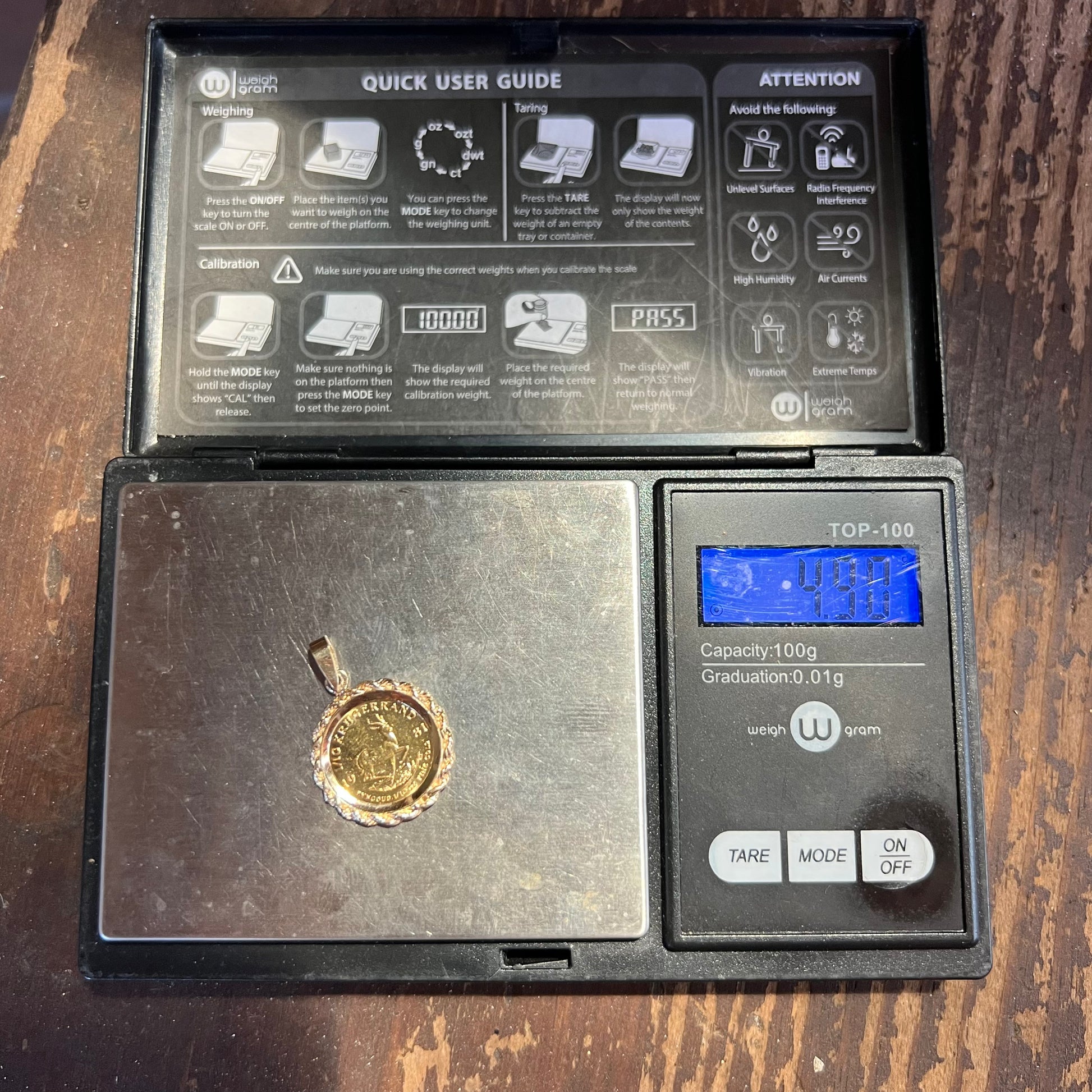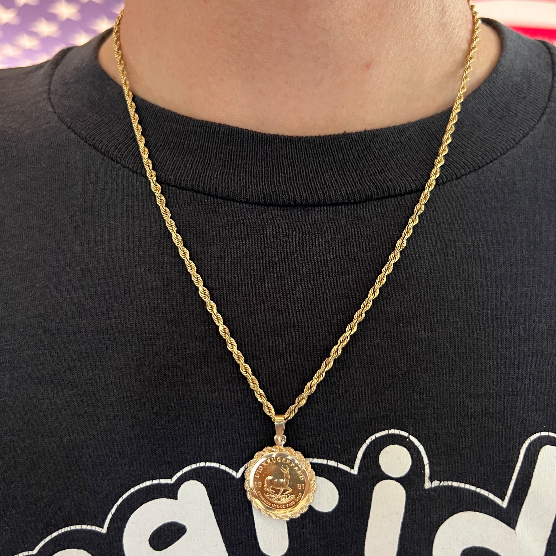 The high quality solid rope bezel and bail is crafted out of 14k plumb yellow gold and weighs approximately 1.5g and was set together with the coin in the 1980’s. The coin itself is a 1981 South African krugerrand and if it were to get graded would fetch a high grade for how great of shape this coin is. It weighs 3.39g and is crafted out of pure 22k gold which in essence makes 1/10 of an oZ of pure .999 gold. One of the most collected gold coins on the market this is an investment piece while having a bad ass piece of jewelry hanging from your neck.