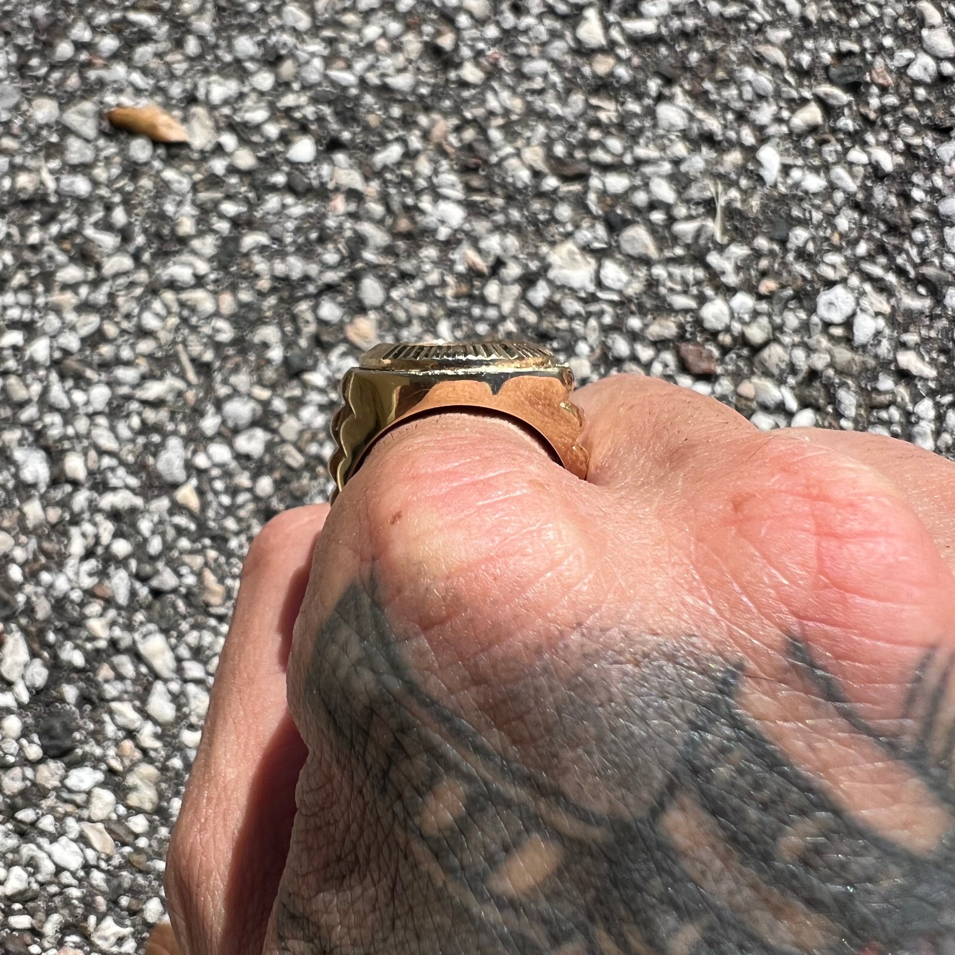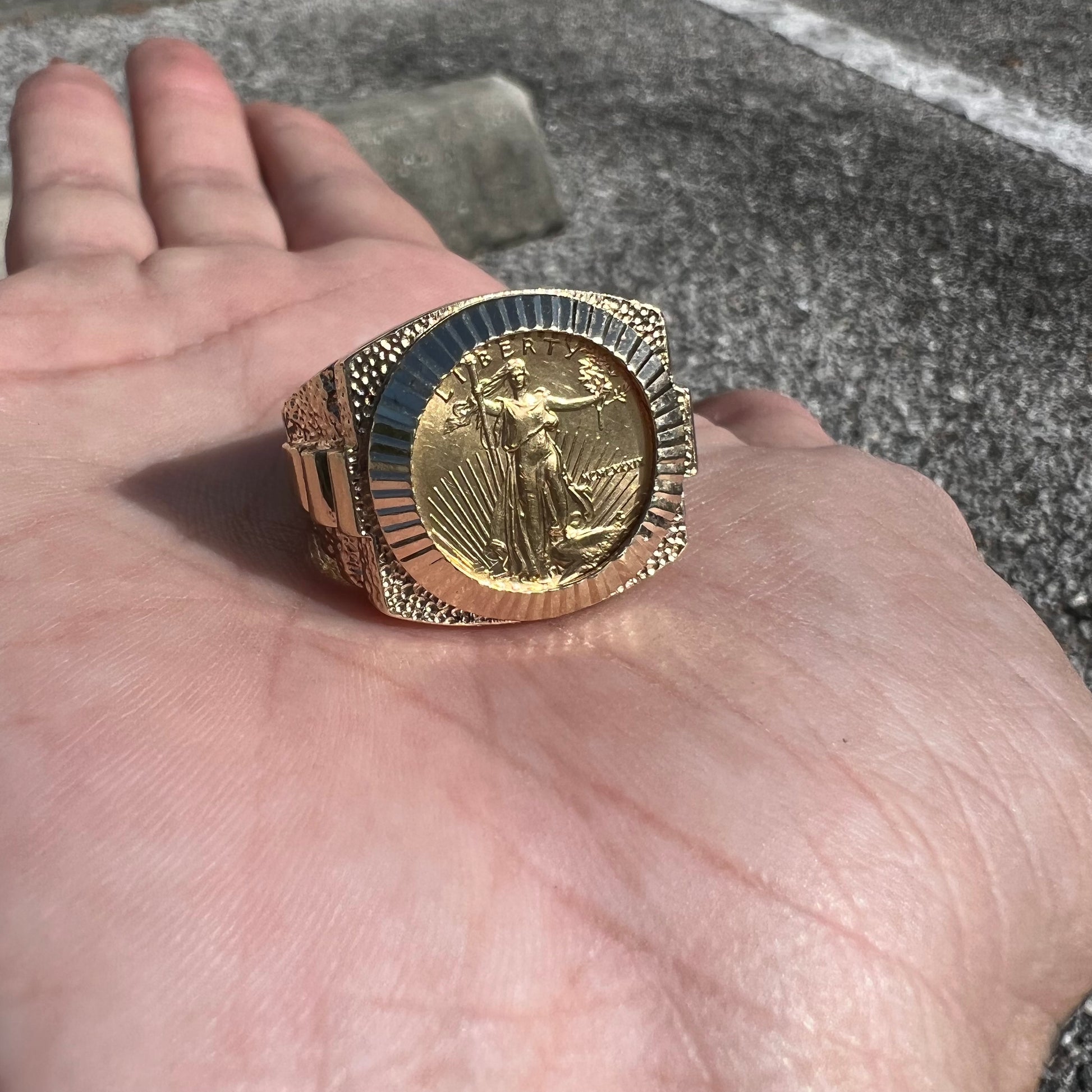 1989 (Roman numeral) walking Liberty pure .999 gold 1/10 oz ($5) coin set meticulously inside of a quality crafted heavy 14k ROLEX style ring. This coin is still in near mint shape it was not harmed one bit when they set the coin into the ring with perfect precision. If this coin was taken out and graded it would fetch one of the highest grades you can get. This is a large ring of the utmost quality I left the original sticker price on it (shown in the last picture) of the jeweler before me who had it for sale and they were selling it for $1500 which is actually a bit below market price and a pretty good deal. So you’re really getting it for an unbeatable steal with me and at this price. The value will only go up on this ring. Though it’s a great flashy look it’s an investment piece and really shows the type of strong person you are. It Weighs just under 16.3g with the coin weighing 3.93g of 91.67% gold and a Size:11.5
