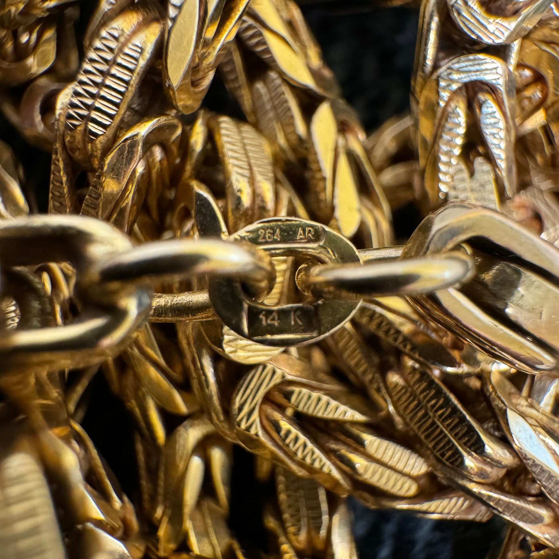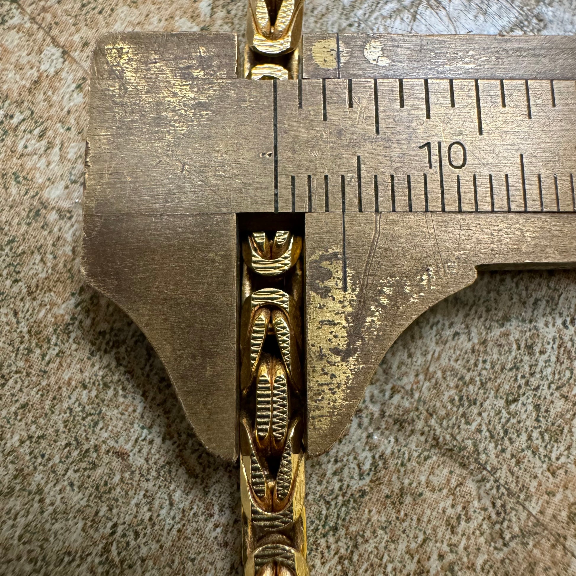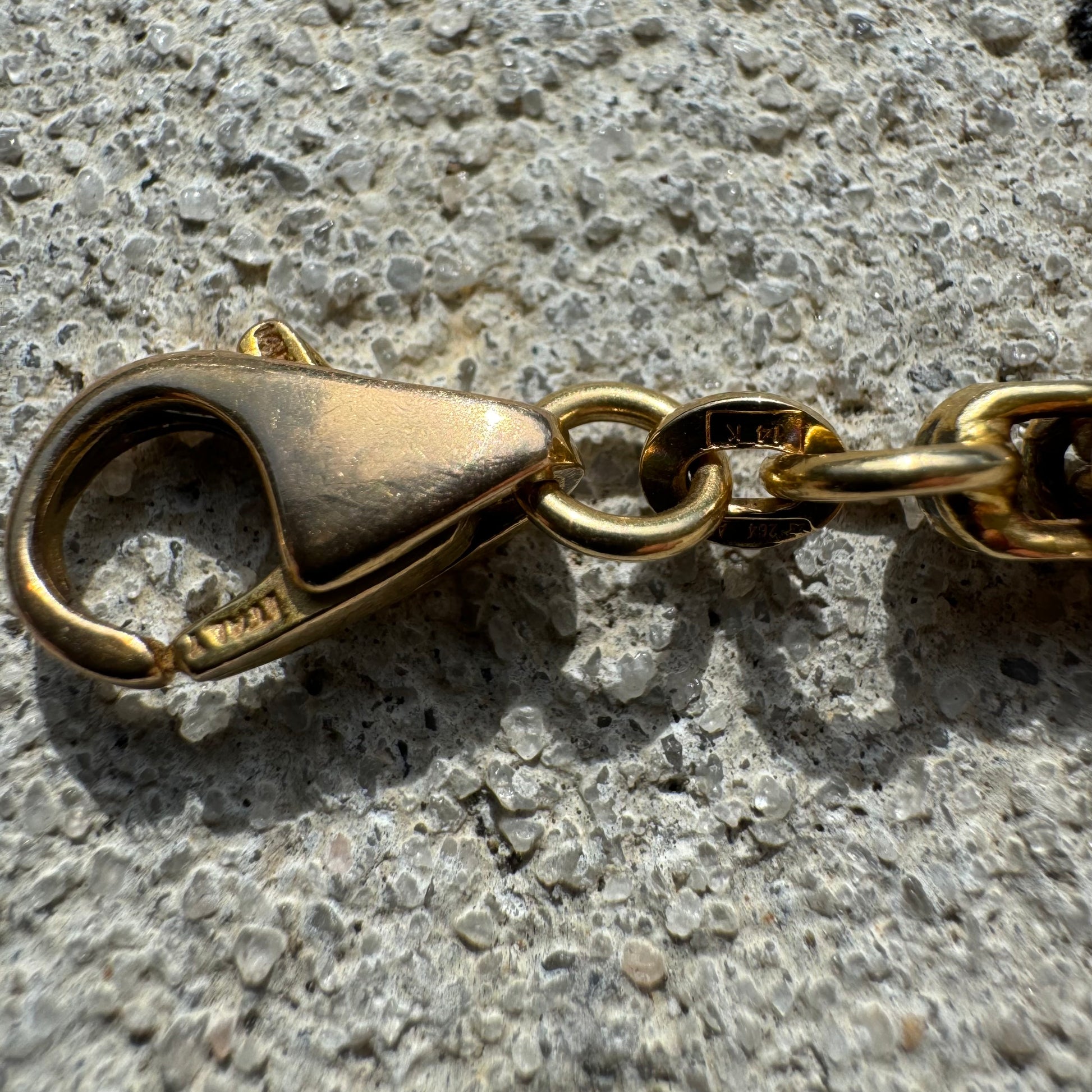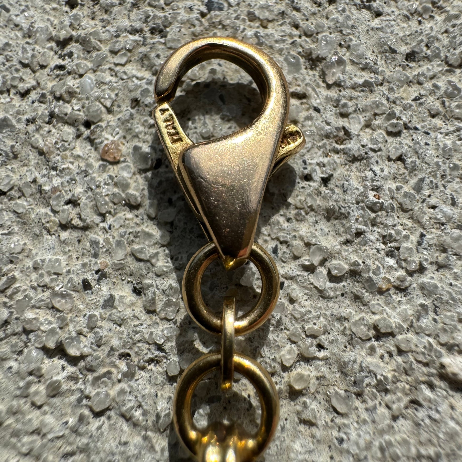 In my opinion this is the best necklace available site wide. It hits all the checkmarks and is one of my most sought after link styles when I’m sourcing my inventory. The Byzantine link is the hardest and least cost effective link for any jeweler to make and one that is not often made anymore because of this. Due to this fact you don’t see them unless looking at older estate jewelry and when you find them they have higher premiums than any other link style. This piece was crafted out of all solid 14k yellow gold sone time around the 1990’s in Arezzo, Italy with beautiful hallmarks and an oversized lobster clasp stating such. At an even more hard to find 21.5” length at 4mm x 4mm thick and weighing in a heavyweight of just under 52g. The double whammy of it all is the double sided finish as it has your high mirror polished finish on one side while the other side is ribbed which is something I have never came across out of all the pieces of jewelry I source on a daily basis. This one stands the test of time, is in excellent condition now and will continue to stay in excellent condition as you pass it down from family member to family memeber and watch it grow in value exponentially.