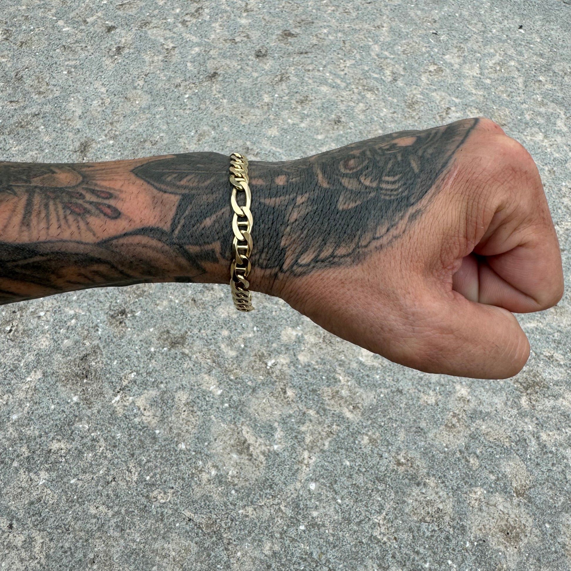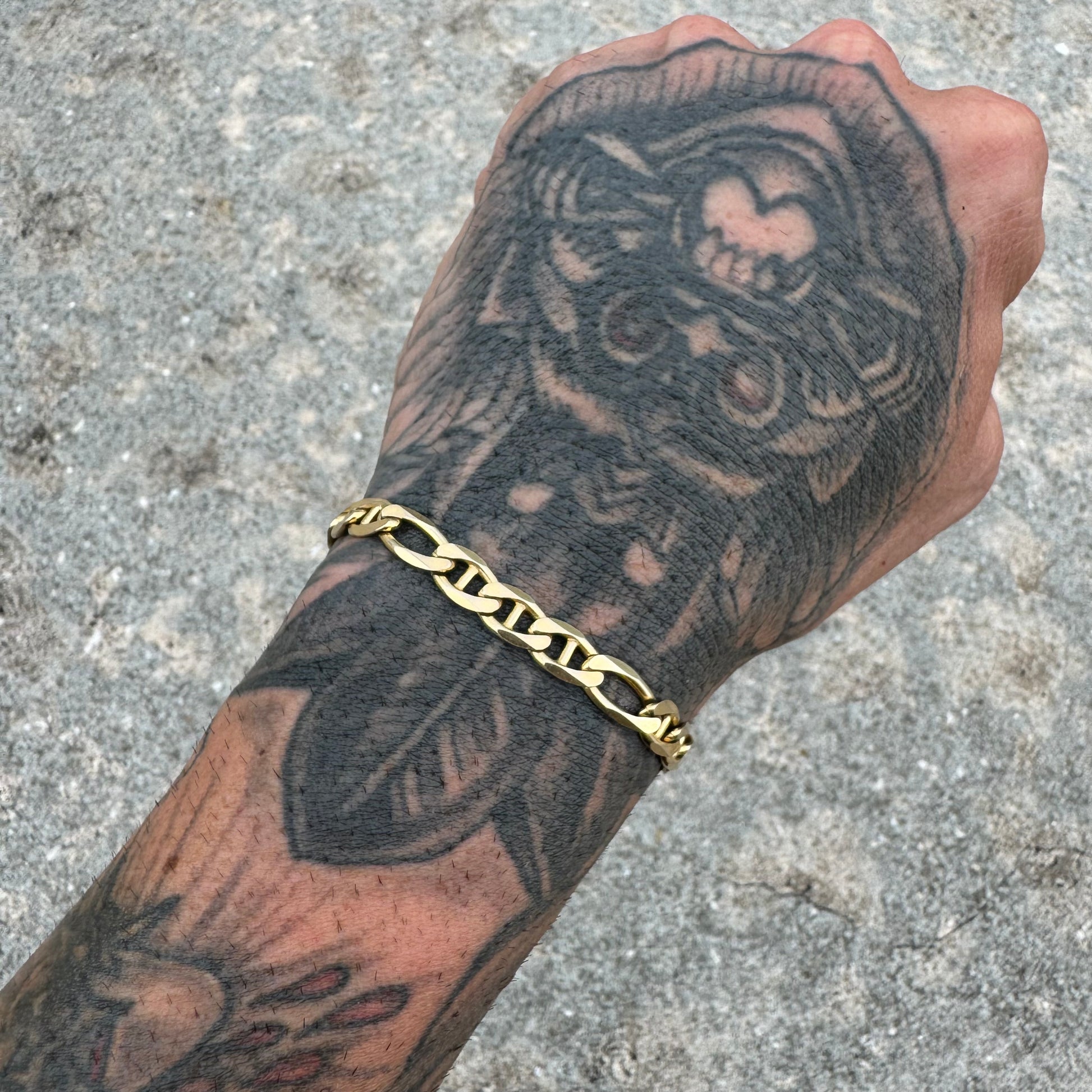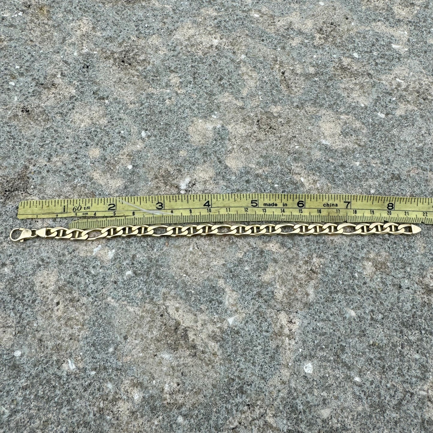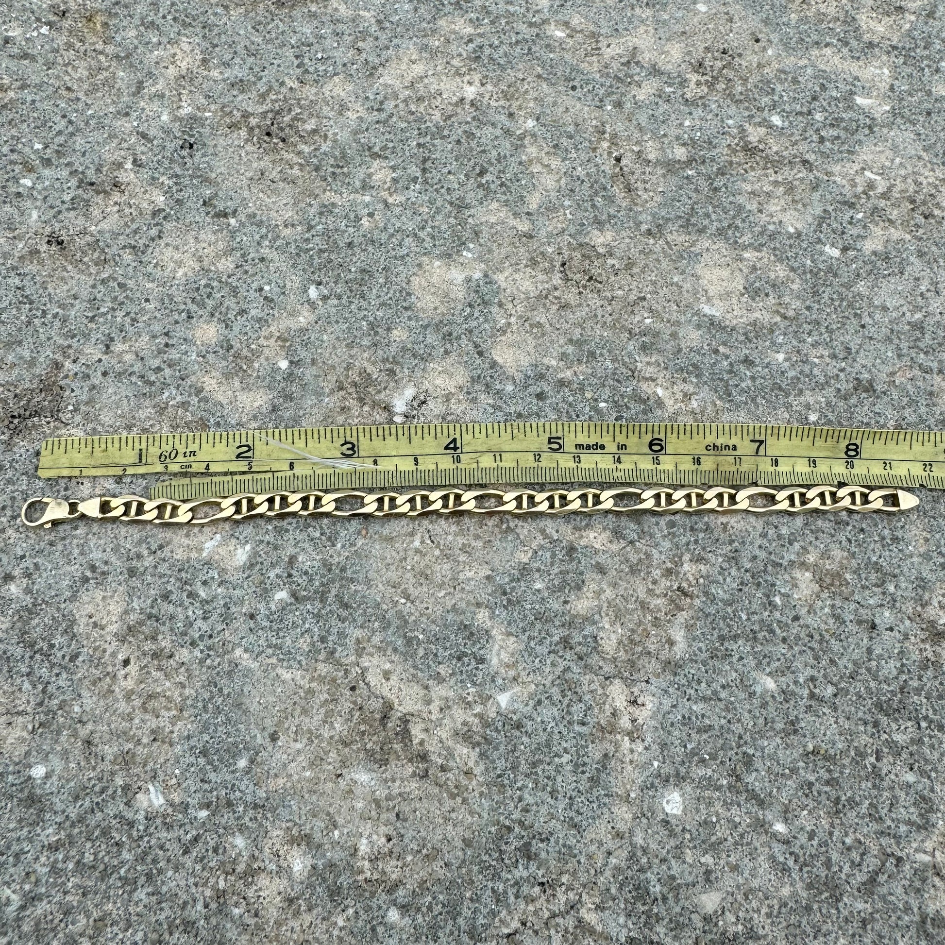 All crafted out of solid 14k Italian yellow gold sometime around the 1990’s this is a heavy chain that means business. A hybrid style link the mixture of 2 different types of chains in one as it combines a mariner style along with a figaro link giving it a smooth knife-edged (diamondcut) links that lay flat with a soft overall feeling that you won’t even notice is on your wrist even though it has a solid build weighing 17.86g. Heavy duty, sturdy, and secure bubble but style lobster clasp this bracelet measures 8.25” in length and 7mm wide by 2mm thick. Flex on em with this one as the sharp cuts give off a flash and shine anyway the bracelet turns while in movement.