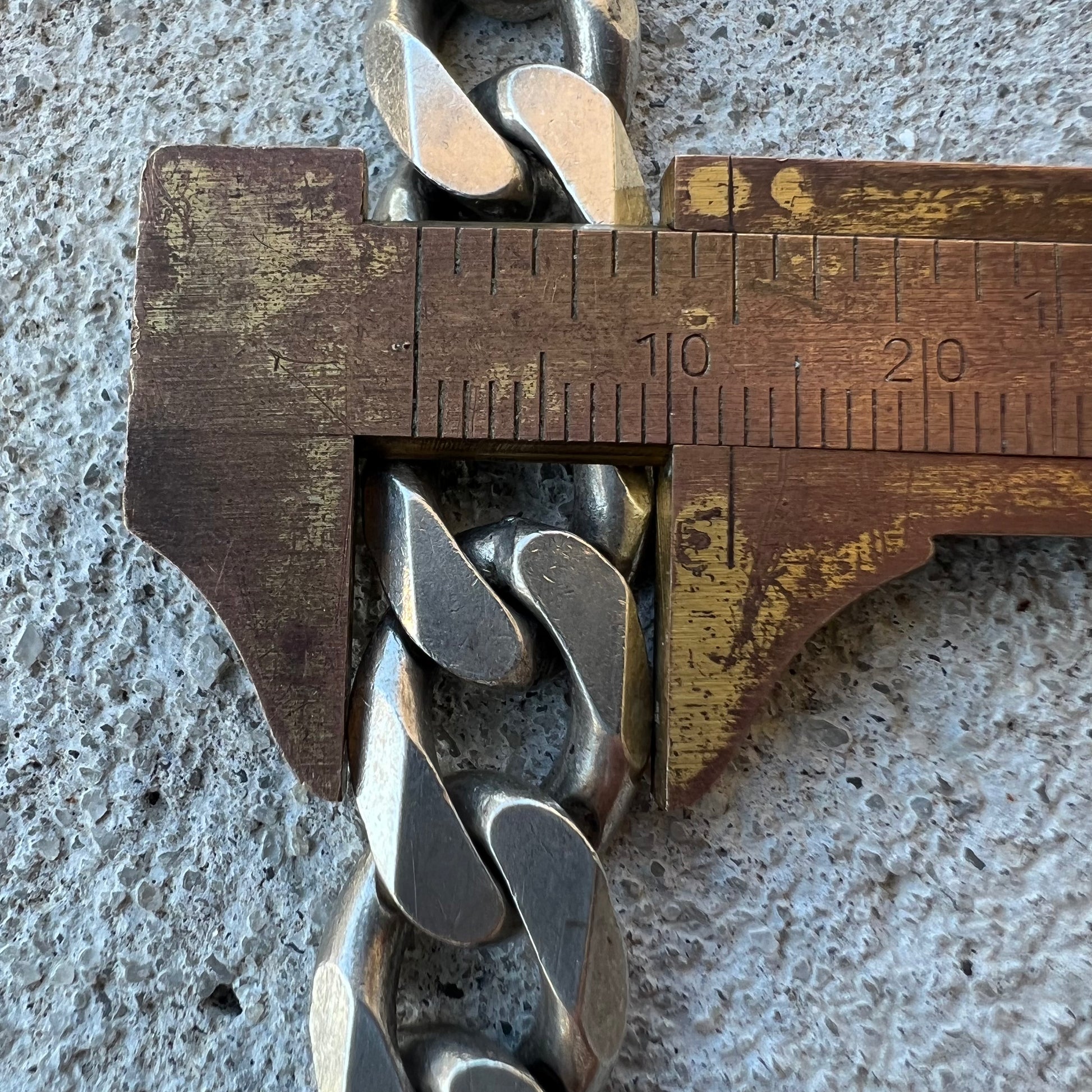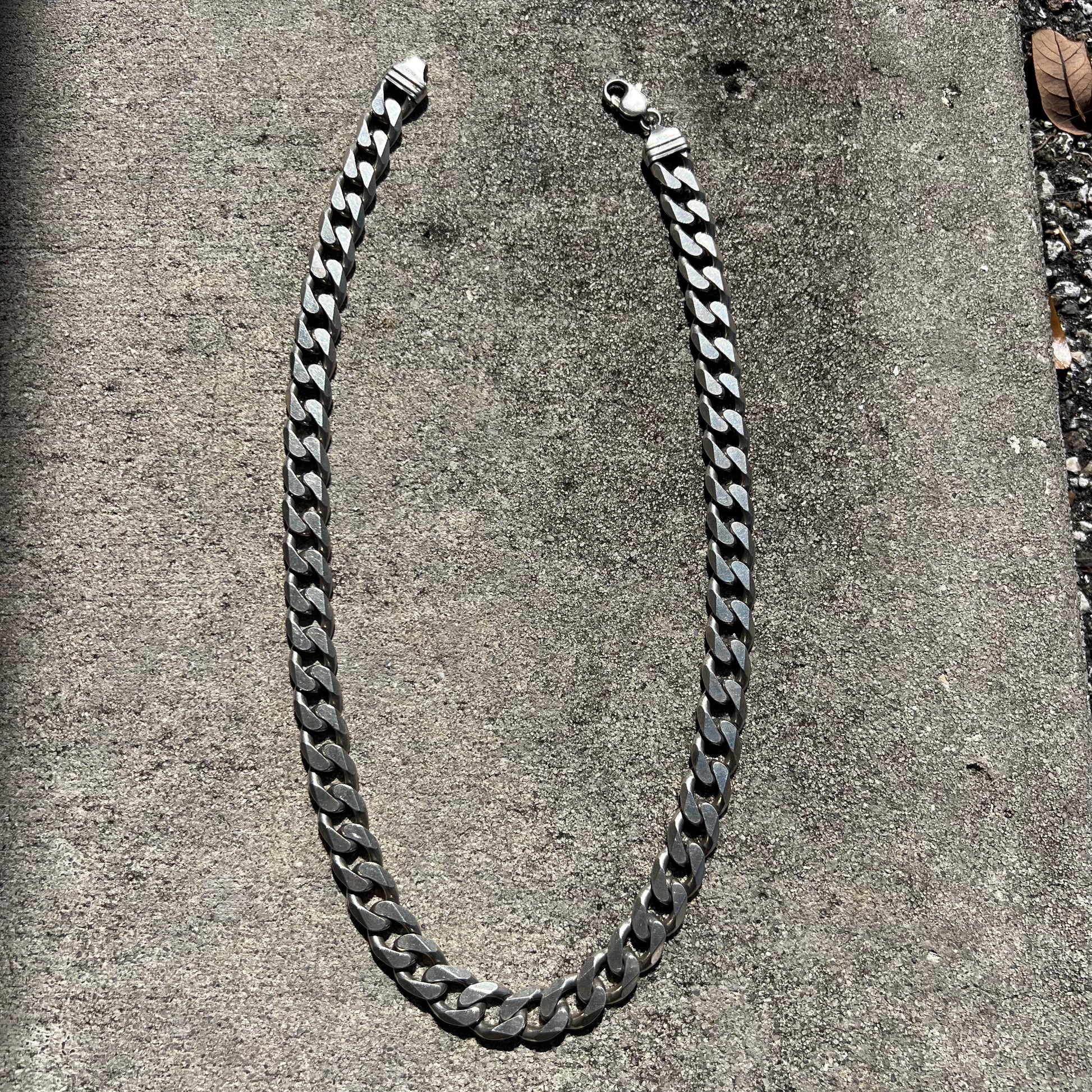 Very Heavyduty this necklace could be used as a chain and pull a car behind a tow truck. In the hard to find 22” length this whopper of 130g is 12mm wide by 4mm thick Italian made sometime around the 1990’s out of solid sterling/.925 silver.