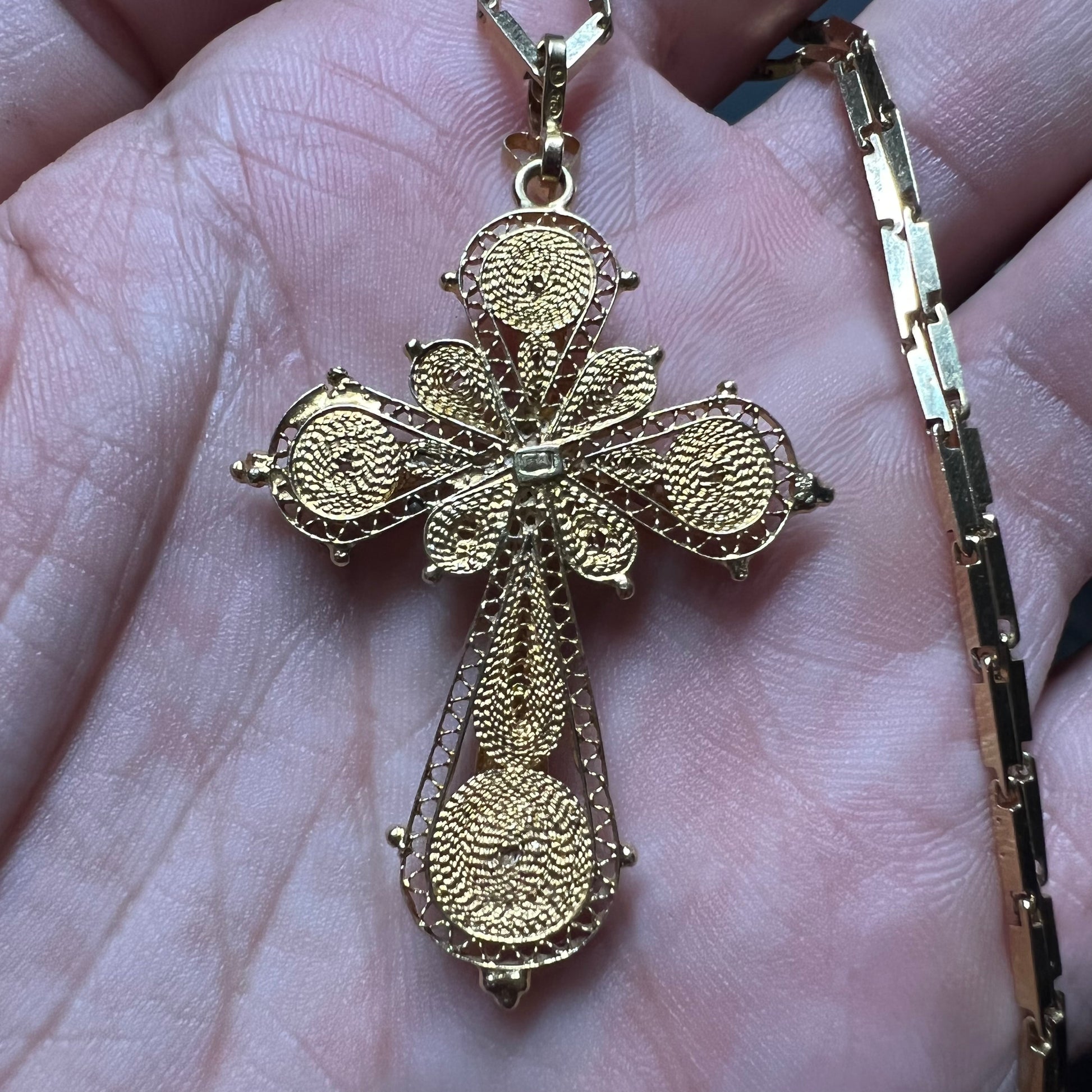 Beautiful antique Cannatille 18k yellow gold cross pendant weighing just under 6 grams with a .15ct genuine hand transitional cut round solitaire ruby. Cannatille work is a close relative of filigree, it features fine gold wires or thinly hammered sheets, utilizing twisted strands of gold wire wound into elaborate designs. Jewelry with cannetille was very popular in the 1820’s and 1830’s, with motifs including tendrils, scrolls, coils, beehives and spider web rosettes. Old handmade crosses like these don’t pop up often and when they do they go for at least triple the price you see here. The cross measures approximately 1.5” wide by 2” long with a bail opening of about 4mm. *necklace is not included*