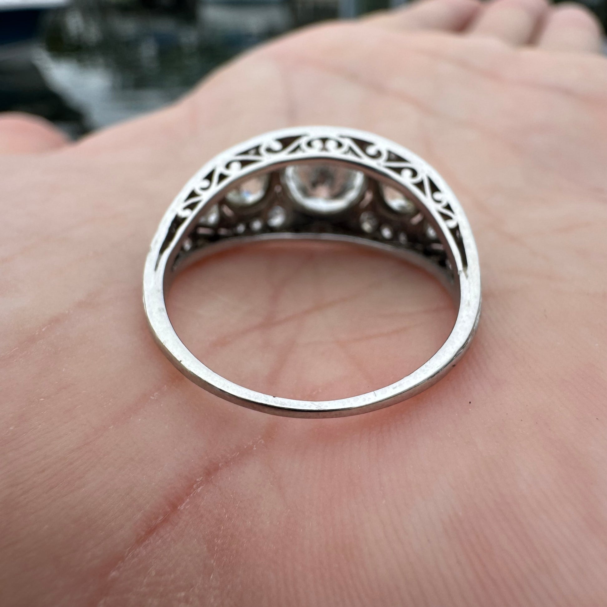 If you think this is beautiful now in the pictures wait until you see this masterpiece in person with the naked eye, these photos do absolutely no justice. All handcrafted out of solid platinum sometime around the 1910’s the center solitaire diamond is an astounding old euro cut that measures approximately 1.25ct (7mm x 4.15mm) super clean at VS2 or conservatively SI1 and G/H in color with colorful rainbows being thrown out at every angle. Flanked on each side are large open culet .25ct-30ct old euro cut diamonds also SI1/Si2 with approximate I color. My favorite part is the old trillion cuts that set the ring into a whole different stratosphere of rare as these also measure around .25ct each graded at SI1 and I in color. Clustered around the main diamonds are .25ctw of old single cut diamonds encrusted with hand chaise engraving throughout bringing the grand total of all the diamonds together at around 2.5ctw. A size:8 and weighing in at 4.4g this is not a ring you will see or be able to find often especially at this price point. A true heirloom piece this is museum quality and a piece of history with a beautiful story to continue on for generations.