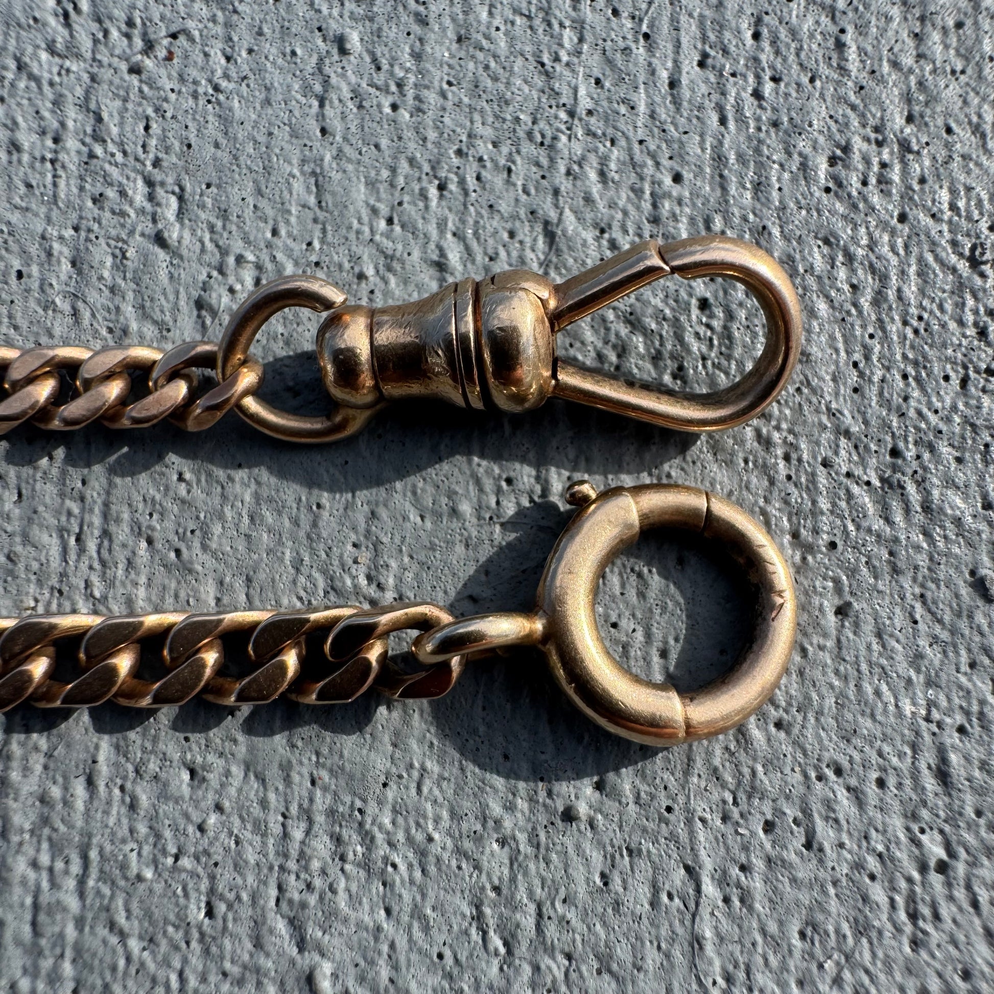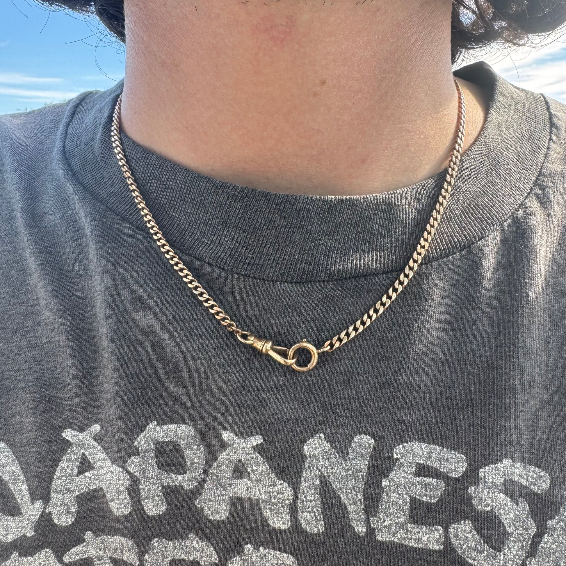 All original and over 100 years old is the most sought after out of all the watch chain necklaces, the classic Cuban curb link. Crafted out of a solid 14k yellow gold and Equipped with the dog clip and spring ring clasp there are many different ways to wear and style one of these chains. Measuring at an excellent wearable length of 18” with a thickness of 3.25mm x 1.75mm and a heavy weight of 18.2g. As the popularity of these chains increases they are becoming more and more scarce to come across and rapidly increasing in price points. If you have been looking for one now is a better time than ever.