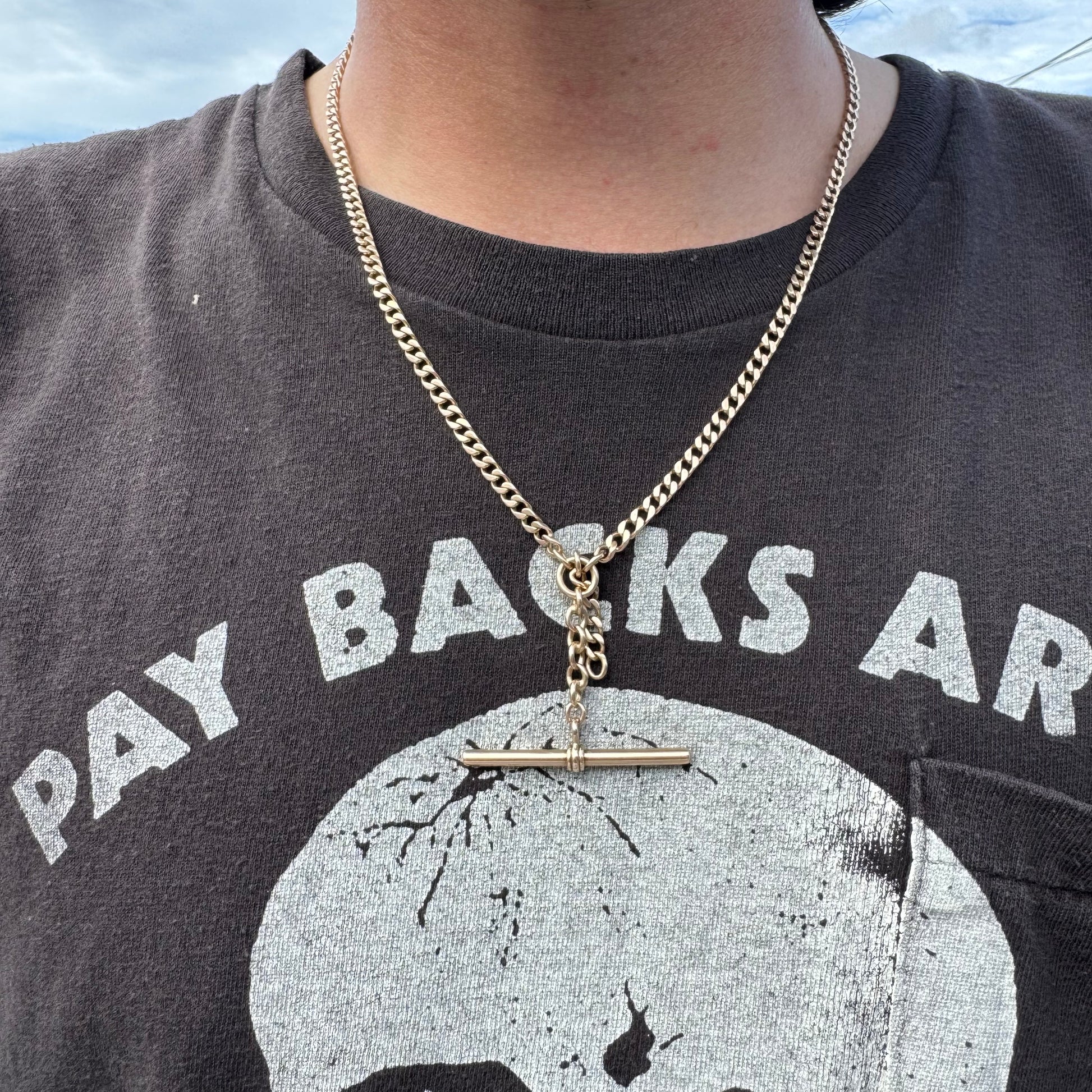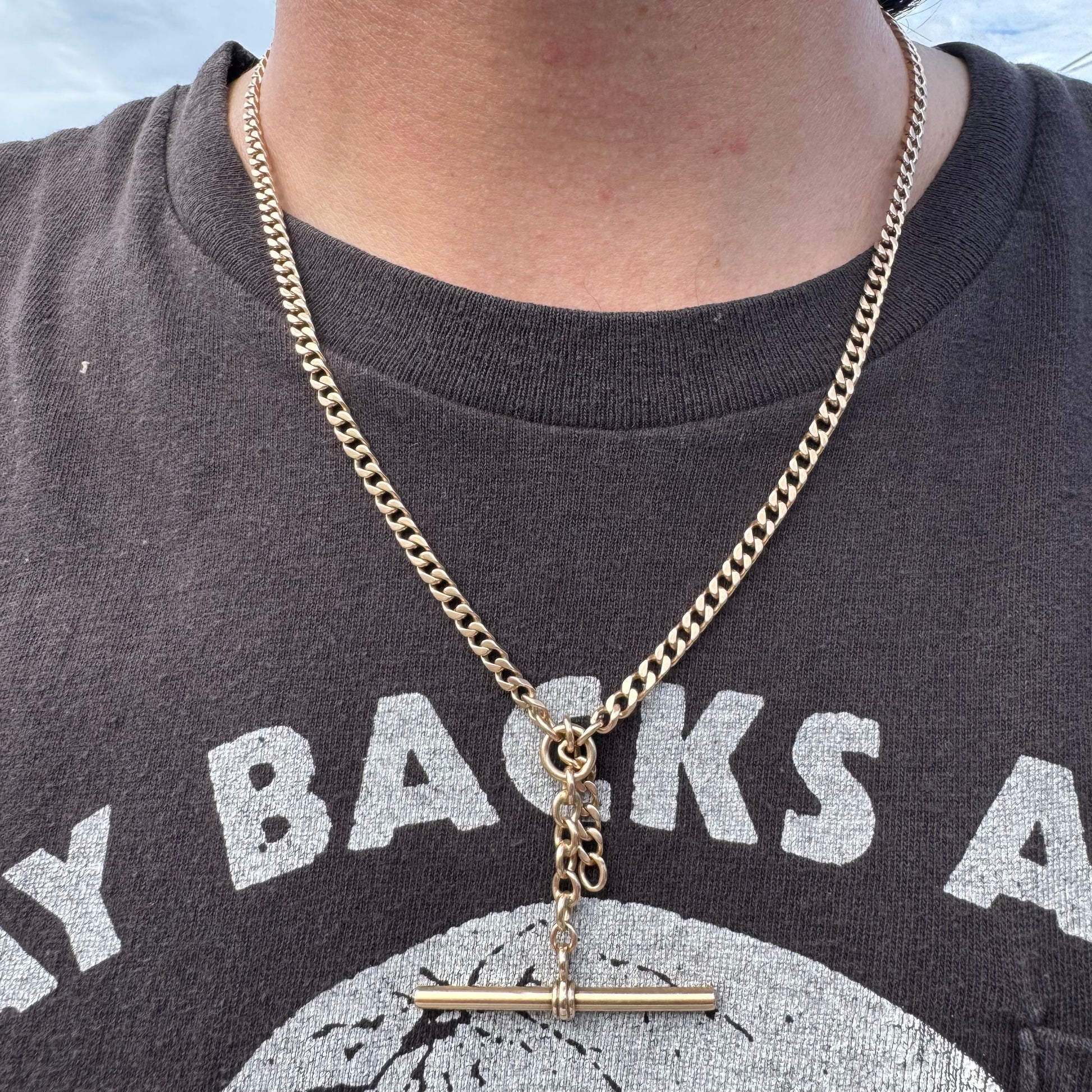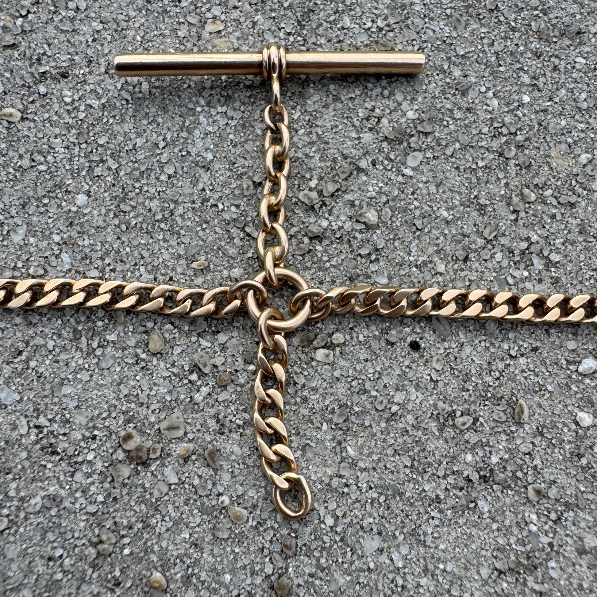 The double Albert watch chain is characterized by having two equal lengths of chain attached to the center dangling T-bar/chain link ring combination. The original use for this wonderful piece back in the late 1800’s to early 1900’s when this chain was crafted was for one chain to hold the pocket watch, as the other was used to hold the watch key to wind the movement as the T-bar would then be affixed to the vest button hole and the center chain ring links hanging next to it for fobs, charms, and talismans to bring out the character of the owner. You could tell a lot from a wearer just by their specific watch chain just like you could today by the different ways someone might wear or style their chains as well. Handcrafted out of a yellow toned solid 14k yellow gold in the early 1900’s this chain is in great condition with each piece of hardware being thicker, heavier, and larger than the average and in perfect working functioning order and tight spring back. Very versatile with numerous ways to wear this chain the T-bar(1.75” long) and chain link ring combo is fully stationary in the exact middle of the necklace allowing for a hanging drop to wear your pendants and charms. At the perfect size to weight ratio this chain measures at a wearable length of 20.5” and the curb link style chain a thick 4mm wide by 2mm thick with the entirety of the piece weighing 34.8g. Not easy to find at an affordable price they are only becoming more rare and sought after as the days go on. My intervals for finding them lately are just getting longer and longer as they just don’t show up like they used to.